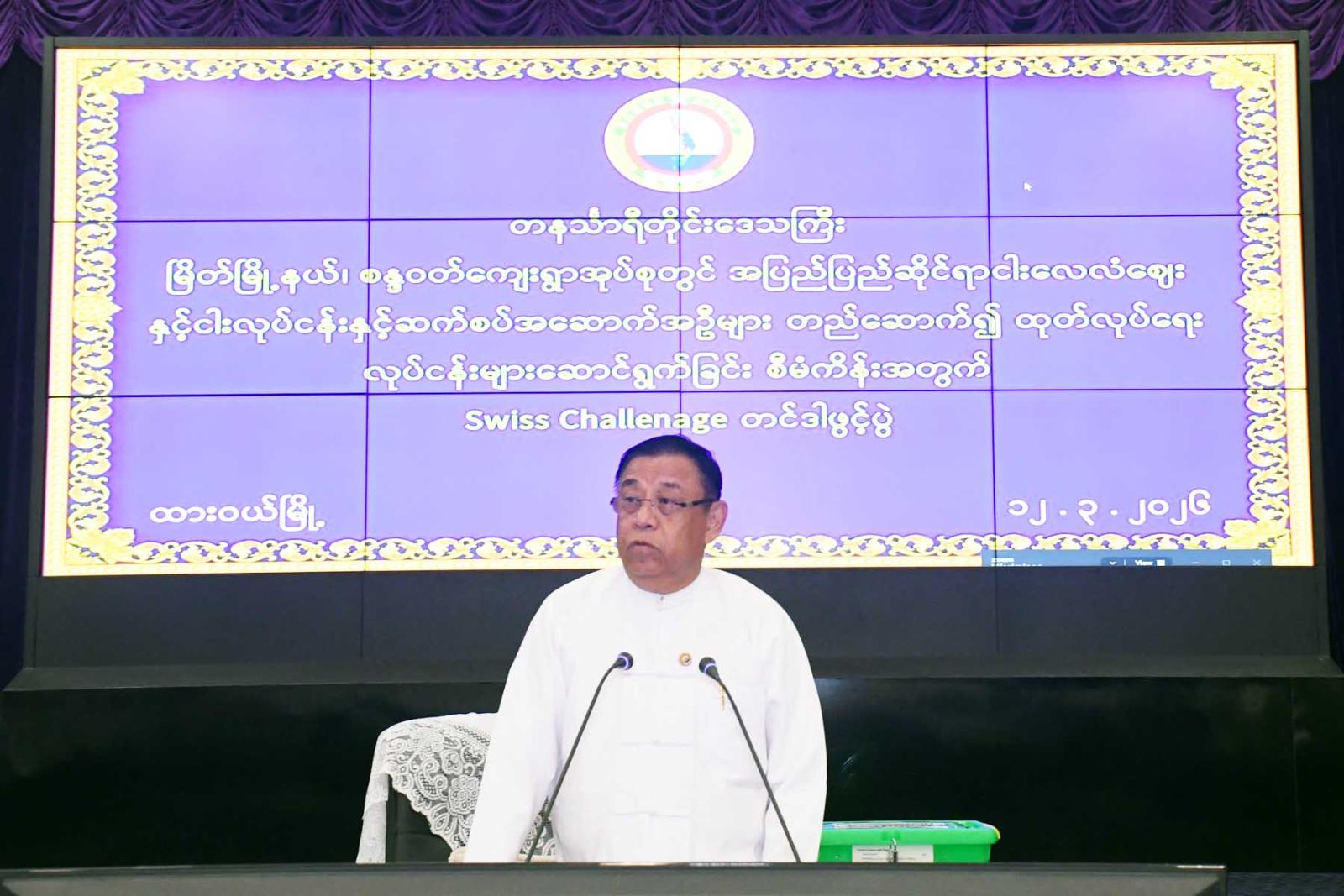 တနင်္သာရီတိုင်းဒေသကြီး၊ မြိတ်မြို့နယ်၊ စန္ဒဝတ်ကျေးရွာအုပ်စုတွင် အပြည်ပြည်ဆိုင်ရာ ငါးလေလံဈေးနှင့် ငါးလုပ်ငန်းနှင့်ဆက်စပ်အဆောက်အဦများတည်ဆောက်၍ ထုတ်လုပ်ရေးလုပ်ငန်းများ ဆောင်ရွက်ခြင်းစီမံကိန်းအတွက် Swiss Challenge တင်ဒါဖွင့်ပွဲအခမ်းအနားကို ယမန်နေ့နံနက် ၁၀ နာရီခွဲက ထားဝယ်မြို့၊ တိုင်းဒေသကြီးအစိုးရအဖွဲ့ရုံး အစည်းအဝေးခန်းမ၌ ကျင်းပခဲ့သည်။