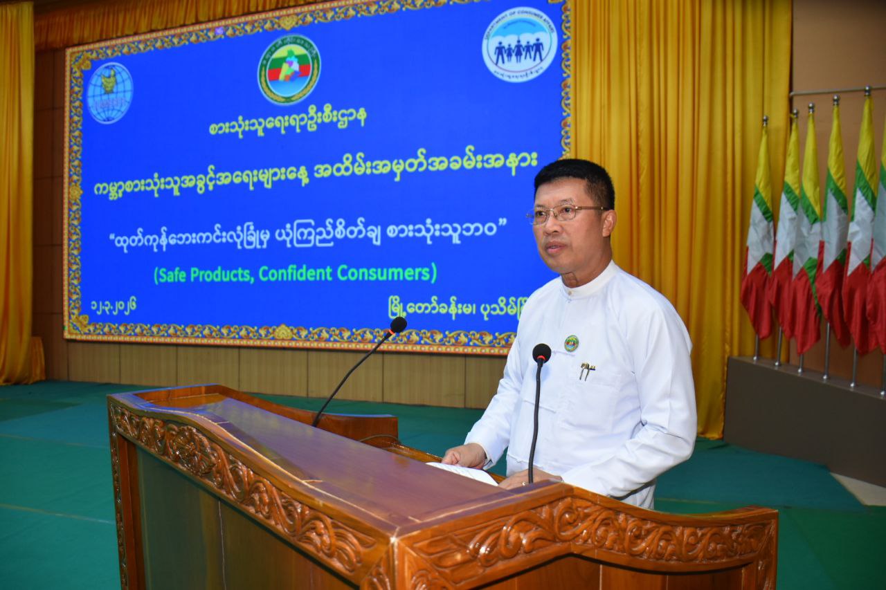 ဦးစွာ တိုင်းဒေသကြီးဝန်ကြီးချုပ်က “နှစ်စဉ်မတ်လ (၁၅) ရက်နေ့ကို စားသုံးသူများ၏ အခွင့်အလမ်းများအတွက် ဂရုပြုကာ အလေးထားမြှင့်တင်သည့်အနေဖြင့် စားသုံးသူကာကွယ်ရေး လုပ်ငန်းများဆောင်ရွက်ခြင်းနှင့် စားသုံးသူကာကွယ်ရေးဥပဒေရေးဆွဲပြဌာန်းခြင်းများကို ၂၀၁၄ ခုနှစ်တွင် စတင်လုပ်ဆောင်ခဲ့ပြီးနောက် ၂၀၁၆ခုနှစ်မှ စတင်၍ နှစ်စဉ် “ကမ္ဘာ့စားသုံးသူ အခွင့်အရေးများနေ့” အခမ်းအနားအား ကျင်းပဆောင်ရွက်ခဲ့ခြင်းဖြစ်ပါကြောင်း၊ ယခုနှစ် ၂၀၂၆ခုနှစ်တွင် ကျင်းပမည့် ကမ္ဘာ့စားသုံးသူအခွင့်အရေးများနေ့ အခမ်းအနားအတွက် အပြည်ပြည်ဆိုင်ရာစားသုံးသူများအဖွဲ့(Consumer International) မှ ချမှတ်ထားသော ဆောင်ပုဒ်မှာ “ထုတ်ကုန်ဘေးကင်းလုံခြုံမှ ယုံကြည်စိတ်ချ စားသုံးသူဘဝ”(Safe Products, Confident Consumers)ဖြစ်ပါကြောင်း၊ ၂၀၁၄ခုနှစ်တွင် စားသုံးသူကာကွယ်ရေး ဥပဒေကို အတည်ပြုပြဋ္ဌာန်းခဲ့ပြီးဖြစ်ရာ အဆိုပါဥပဒေတွင် စီးပွားရေးလုပ်ငန်းရှင်များအနေဖြင့် မိမိတို့၏ ထုတ်ကုန်များပေါ်တွင် မြန်မာဘာသာဖြင့် ကုန်အညွှန်းအမှတ်အသားများကို ရှင်းလင်းစွာဖော်ပြရန်၊ ထုတ်ကုန်များကြောင့် စားသုံးသူများနစ်နာမှုရှိပါက တာဝန်ယူဖြေရှင်းပေးရန်နှင့် အရည်အသွေးမပြည့်မီသောကုန်စည်များကို ဈေးကွက်အတွင်းမှ ပြန်လည်သိမ်းဆည်းရန်ဖော်ပြထားပြီးဖြစ်ပါကြောင်း၊ စားသုံးသူများသည် မိမိတို့ဝယ်ယူမည့် ကုန်စည်များတွင် ပါဝင်သော ကုန်အညွှန်းအမှတ်အသားများကို သေချာစွာဖတ်ရှုစစ်ဆေးသည့် အလေ့အကျင့်ကို မွေးမြူရမည်ဖြစ်ပါကြောင်း၊ ဘေးကင်းစိတ်ချရသောထုတ်ကုန်များ များပြားလာသည်နှင့်အမျှ နိုင်ငံ၏ကျန်းမာရေးနှင့် လူမှုစီးပွားဘဝဖွံ့ဖြိုးတိုးတက်မှုကို အထောက်အကူပြုစေမည်ဖြစ်ပါကြောင်း” အမှာစကားပြောကြားသည်။