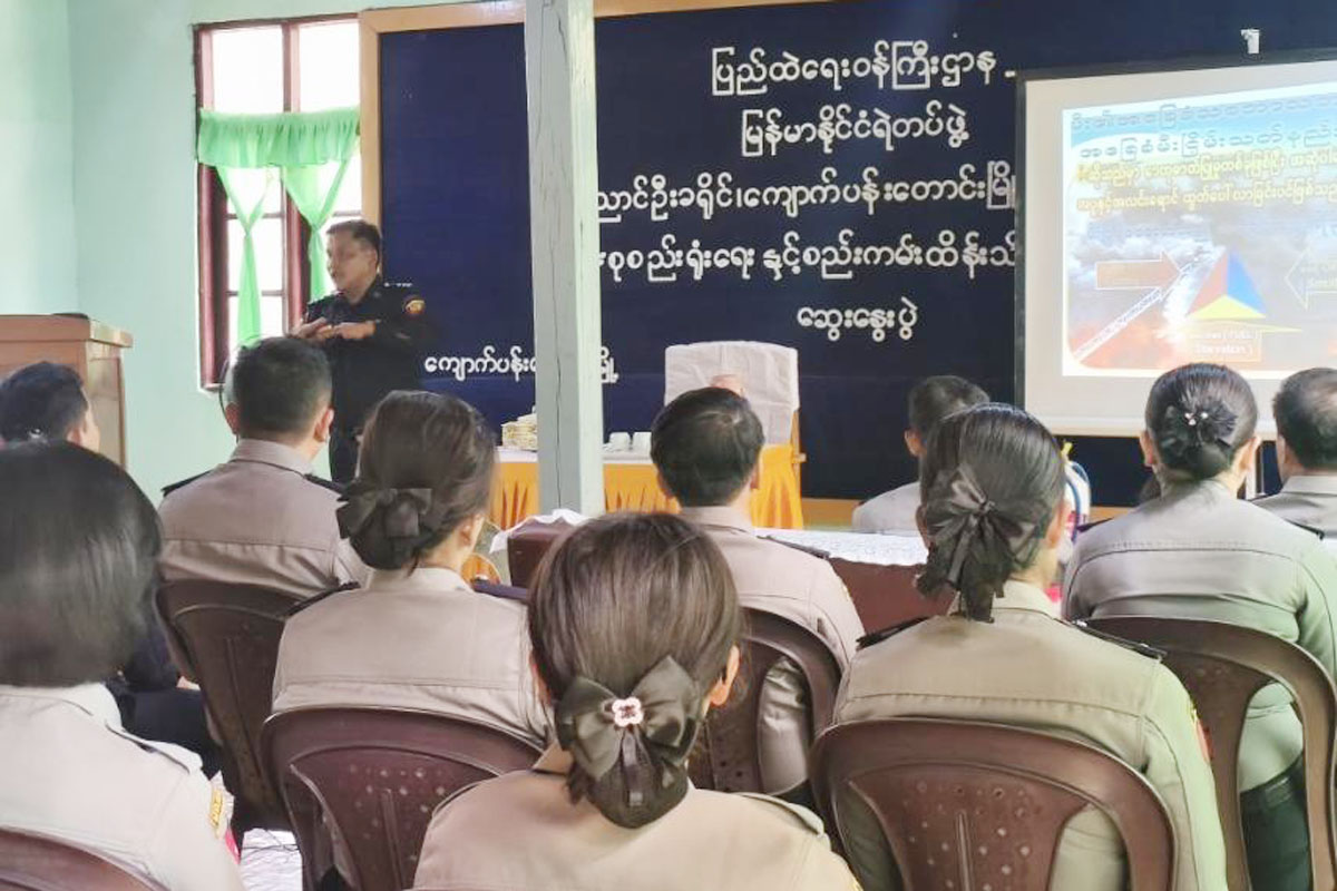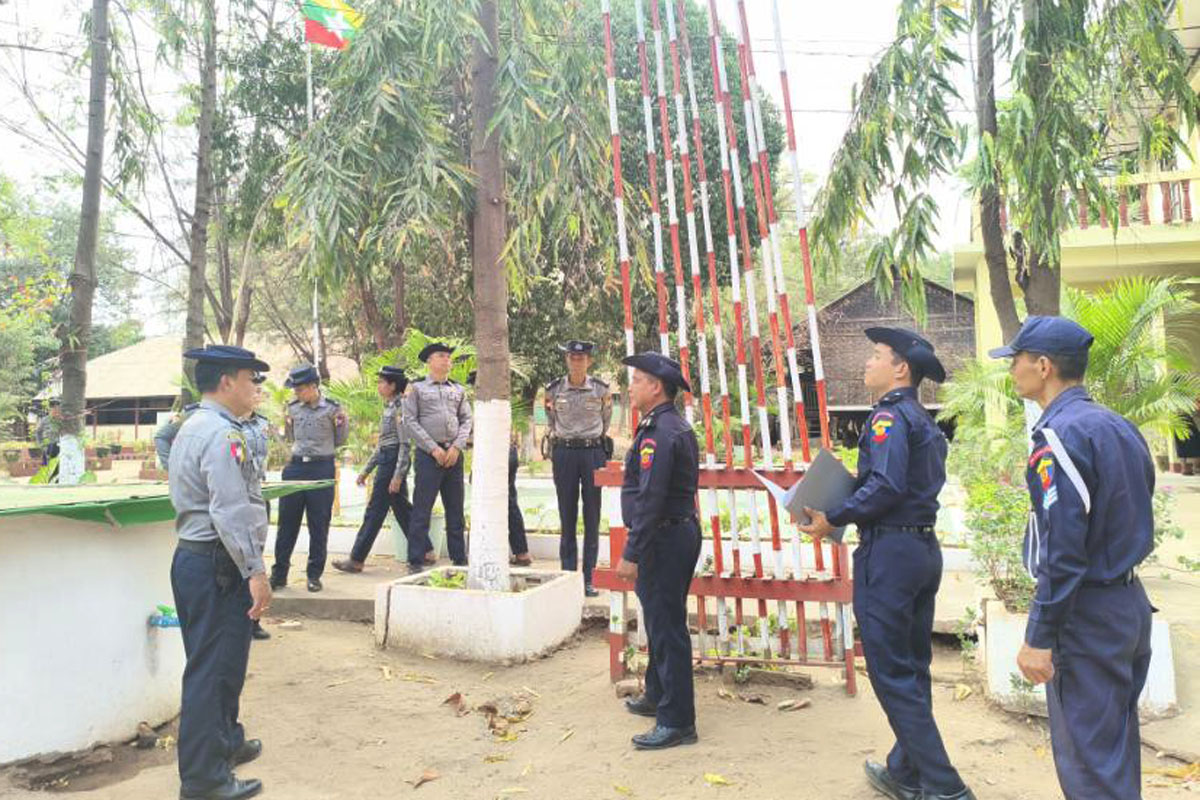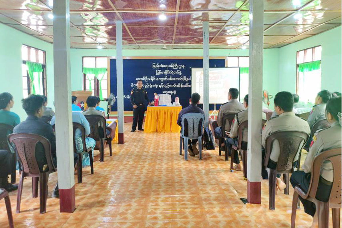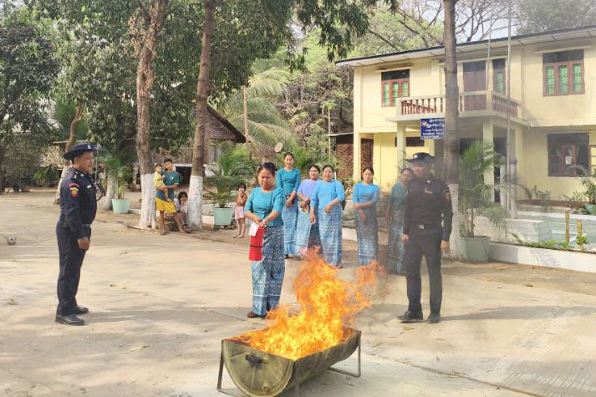 ရှေ့ဦးစွာ မြို့နယ်ရဲတပ်ဖွဲ့မှူး ရဲမှူးနိုင်ဝင်းထွန်းက တပ်ဖွဲ့ဝင်များအတွင်း မီးဘေးလုံခြုံရေး ချမှတ်ထားသည့် စည်းကမ်းများကို အတိအကျလိုက်နာဆောင်ရွက်ကြရန် အမှာစကားပြောကြားပြီး၊ မြို့နယ်မီးသတ်ဦးစီးမှူး ဦးသန်းမြင့်က ပူပြင်းခြောက်သွေ့သောကာလသို့ ရောက်ရှိလာပြီဖြစ်သဖြင့် ရုံးဌာများ မီးလန့်မှုမီးလောင်မှု မဖြစ်ပွားစေရန်နှင့် အဆိုပါ မီးလောင်မှုမီးလန့်မှု ဖြစ်ပွားရသည့်အကြောင်းအရင်းများနှင့် ကြိုတင်ကာကွယ်ရမည့် နည်းလမ်းများကို ရှင်းလင်းဟောပြောသည်။ ယင်းနောက် မြို့နယ်ရဲတပ်ဖွဲ့မှူးရုံးရှေ့ မြေကွက်လပ်တွင် ရဲတပ်ဖွဲ့ဝင်များနှင့် မိသားစုများအား မြို့နယ်မီးသတ်ဦးစီးမှူး ဦးသန်းမြင့်နှင့် ဝန်ထမ်းများက မီးသတ်ဆေးဘူး ကိုင်တွယ်အသုံပြုနည်းနှင့် မီးသတ်ဆေးဘူးနှင့် မီးငြှိမ်းသတ်နည်း၊ ဆီမီးလောင်မှု ငြှိမ်းသတ်နည်းများကို လက်တွေ့ပြသကြပြီး၊ ရဲတပ်ဖွဲ့မိသားစုများနှင့်အတူ ဇာတ်တိုက်လေ့ကျင့်ကြသည်။ ယင်းနောက် မီးသတ်ဦးစီးမှူးနှင့် မြို့နယ်ရဲတပ်ဖွဲ့မှူးတို့က မိသားစုဝင်များ၏ လိုင်းခန်းများ မီးဘေးလုံခြုံရေး ဆောင်ရွက်ထားရှိမှုအခြေအနေများကို လှည့်လည်စစ်ဆေး၍ မြို့နယ်မီးသတ်ဦးစီးမှူးက လိုအပ်သည်များကို အကြံပြုဆွေးနွေးခဲ့ကြောင်းနှင့် အဆိုပါအသိပညာပေးခြင်းနှင့် ဇာတ်တိုက်လေ့ကျင့်ရာသို့ မြို့နယ်ရဲတပ်ဖွဲ့မှူး ရဲမှူးနိုင်ဝင်းထွန်း၊ မြို့မရဲစခန်းမှူး ဒုတိယရဲမှူး ကျော်ဇင်ထွေးနှင့် တပ်ဖွဲ့ဝင်များ၊ မိသားစုဝင်များ စုစုပေါင်း (၃၀)ဦး တက်ရောက်ခဲ့ကြကြောင်း သိရသည်။