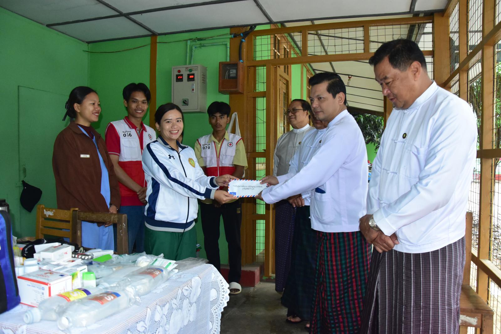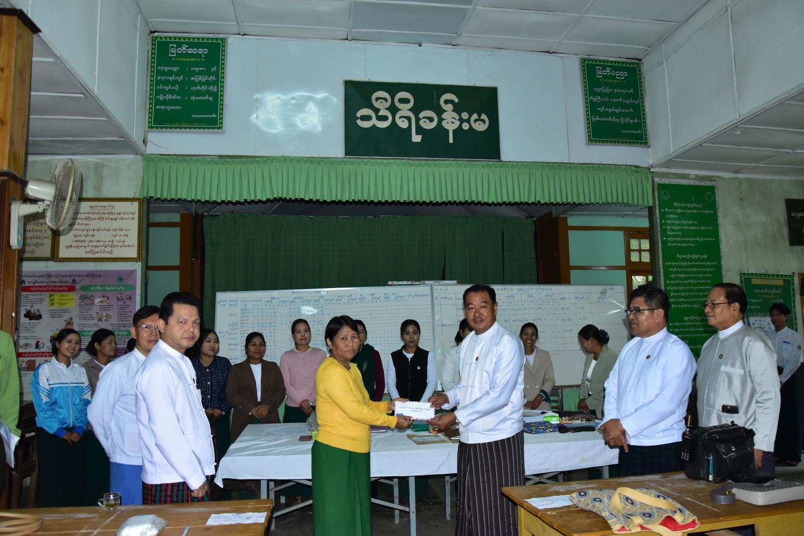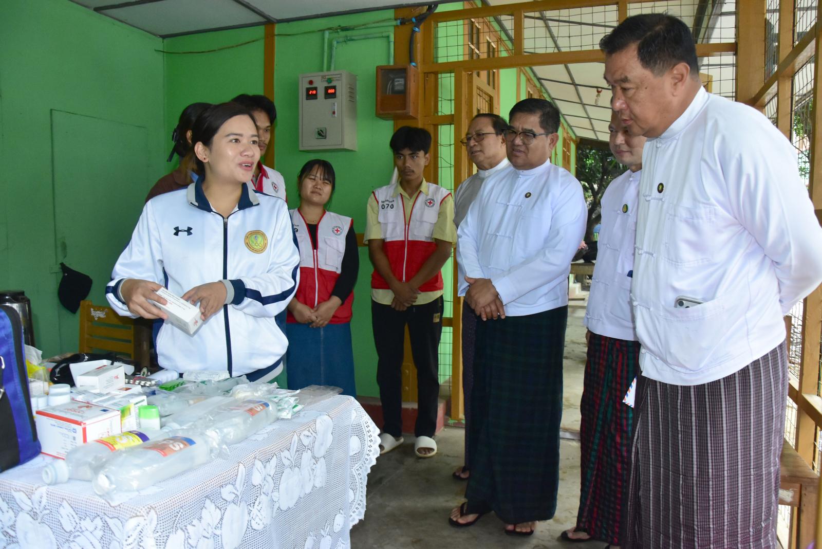 ဆက်လက်၍ စာမေးပွဲကြီးကြပ်ရေးမှူးရုံးခန်း၌ တာဝန်ကျ ဆရာ/ ဆရာမများနှင့်တွေ့ဆုံကာ စာမေးပွဲလုပ်ငန်းစဉ်များနှင့်အညီ ဆောင်ရွက်နေမှုအခြေအနေများနှင့် ကျန်းမာရေးစောင့်ရှောက်မှုပေးရေးအဖွဲ့တို့ကို လိုက်လံအားပေးခဲ့ကြပြီး အရေးပေါ်အခြေအနေတွင် ကျန်းမာရေးစောင့်ရှောက်မှု အပြည့်အဝပေးနိုင်ရေး စီစဉ်ဆောင်ရွက်ထားရန် လိုကြောင်း မှာကြားခဲ့ကာ ချီးမြှင့်ငွေများကို ပေးအပ်ခဲ့ကြသည်။