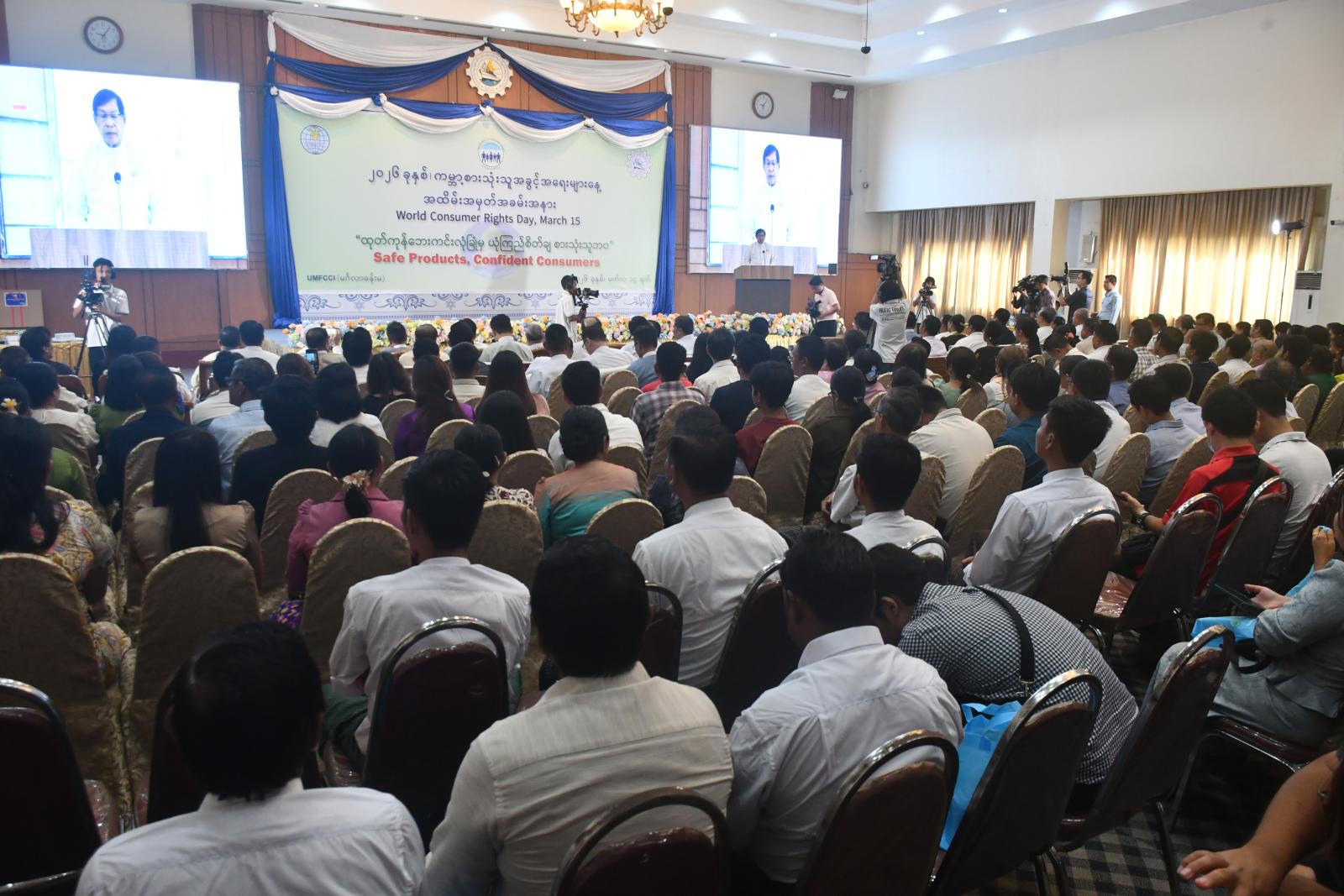 ရန်ကုန်တိုင်းဒေသကြီး၊ ၂ဝ၂၆ ခုနှစ်၊ ကမ္ဘာ့စားသုံးသူ အခွင့်အရေးများနေ့ အထိမ်းအမှတ် အခမ်းအနားကို ယနေ့ နံနက်ပိုင်းက ရန်ကုန်မြို့၊လမ်းမတော်မြို့နယ်၊ မင်းရဲကျော်စွာလမ်းရှိ မြန်မာနိုင်ငံ ကုန်သည်များနှင့် စက်မှုလက်မှုလုပ်ငန်းရှင်များအသင်းချုပ် (UMFCCI) အစည်းဝေးခန်းမ၌ ကျင်းပရာ ရန်ကုန်တိုင်း ဒေသကြီး ဝန်ကြီးချုပ် ဦးစိုးသိန်း၊ တိုင်းဒေသကြီးဝန်ကြီးများ၊ ဌာနဆိုင်များမှ တာဝန်ရှိသူများ၊ ညီနောင် အသင်းများမှ ဥက္ကဋ္ဌများနှင့် တာဝန်ရှိသူများ၊ ဖိတ်ကြားထားသူများ တက်ရောက်ကြသည်။