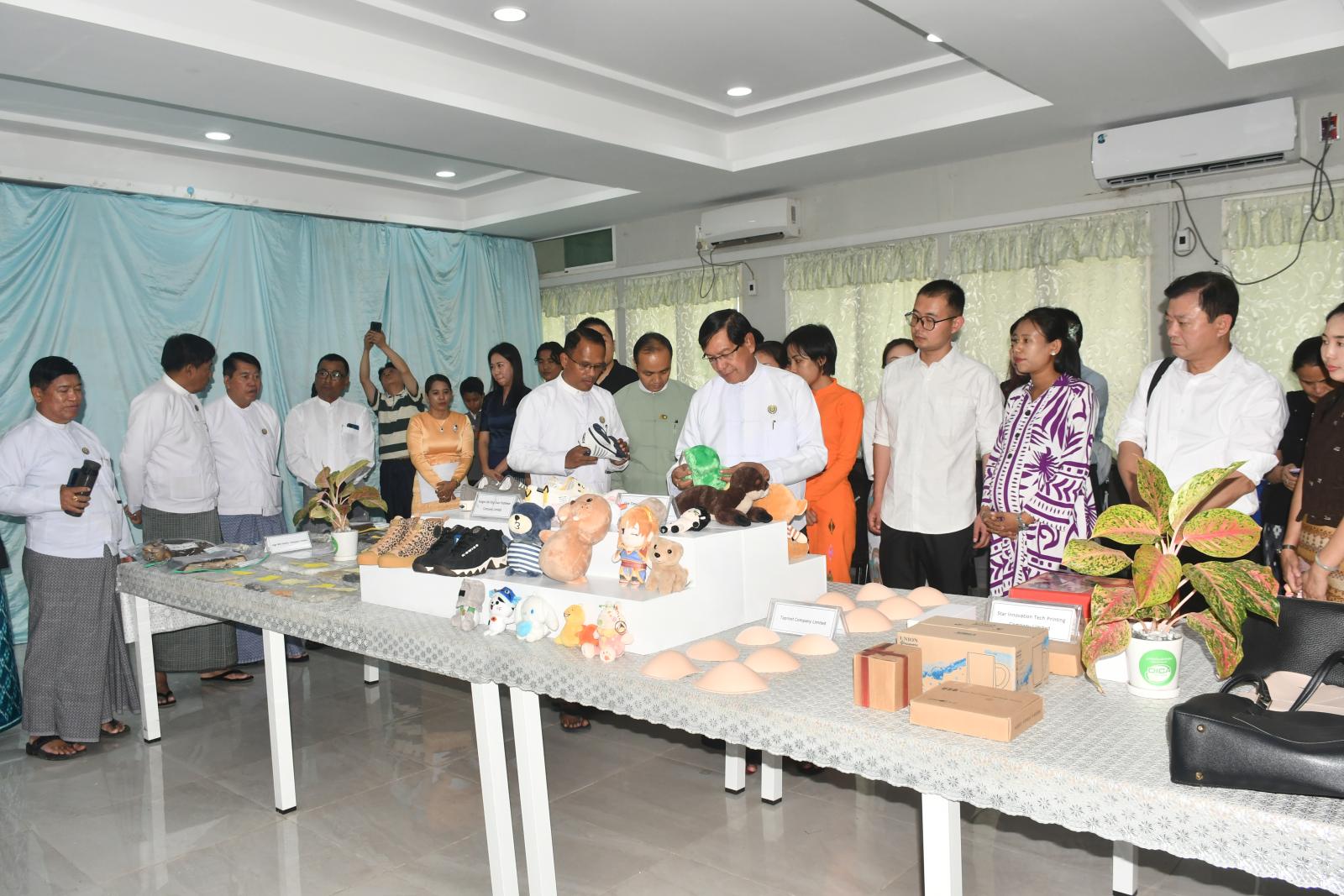 ဦးစွာ ရန်ကုန်တိုင်းဒေသကြီး ဝန်ကြီးချုပ် ဦးစိုးသိန်းနှင့်အဖွဲ့သည် ရင်းနှီးမြှုပ်နှံသူလုပ်ငန်းရှင်များ၏ ထုတ်လုပ်သည့်ပစ္စည်း နမူနာပြသထားရှိမှုများကို ကြည့်ရှုစစ်ဆေးကြသည်။
