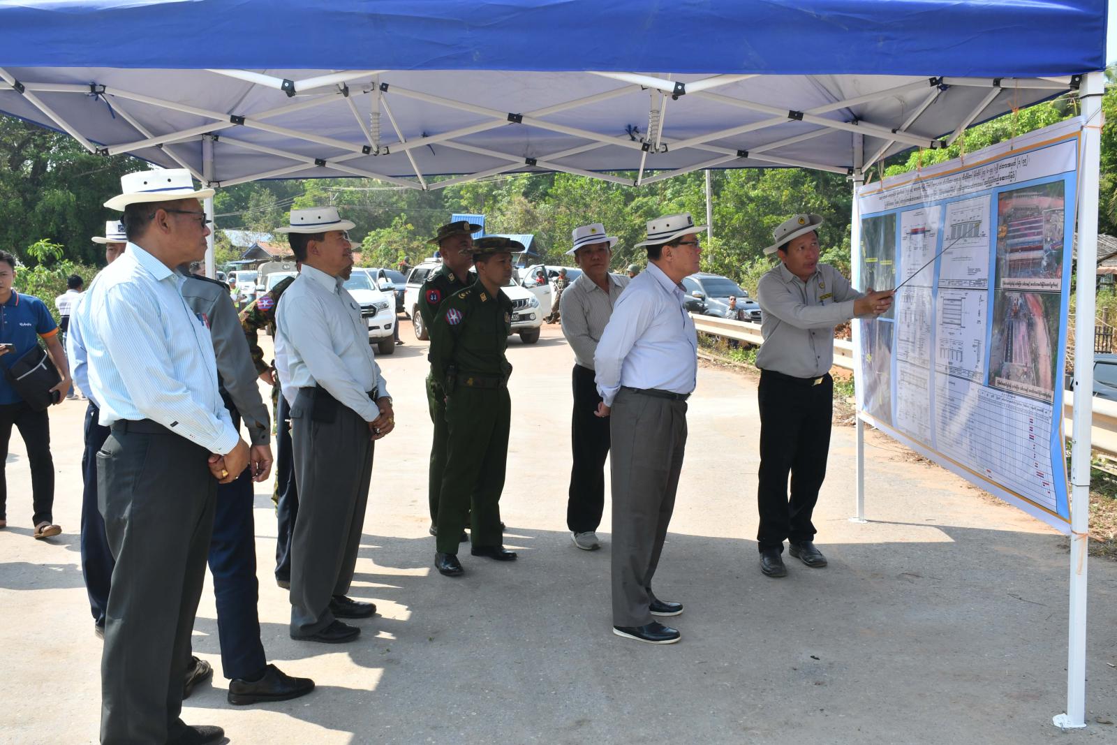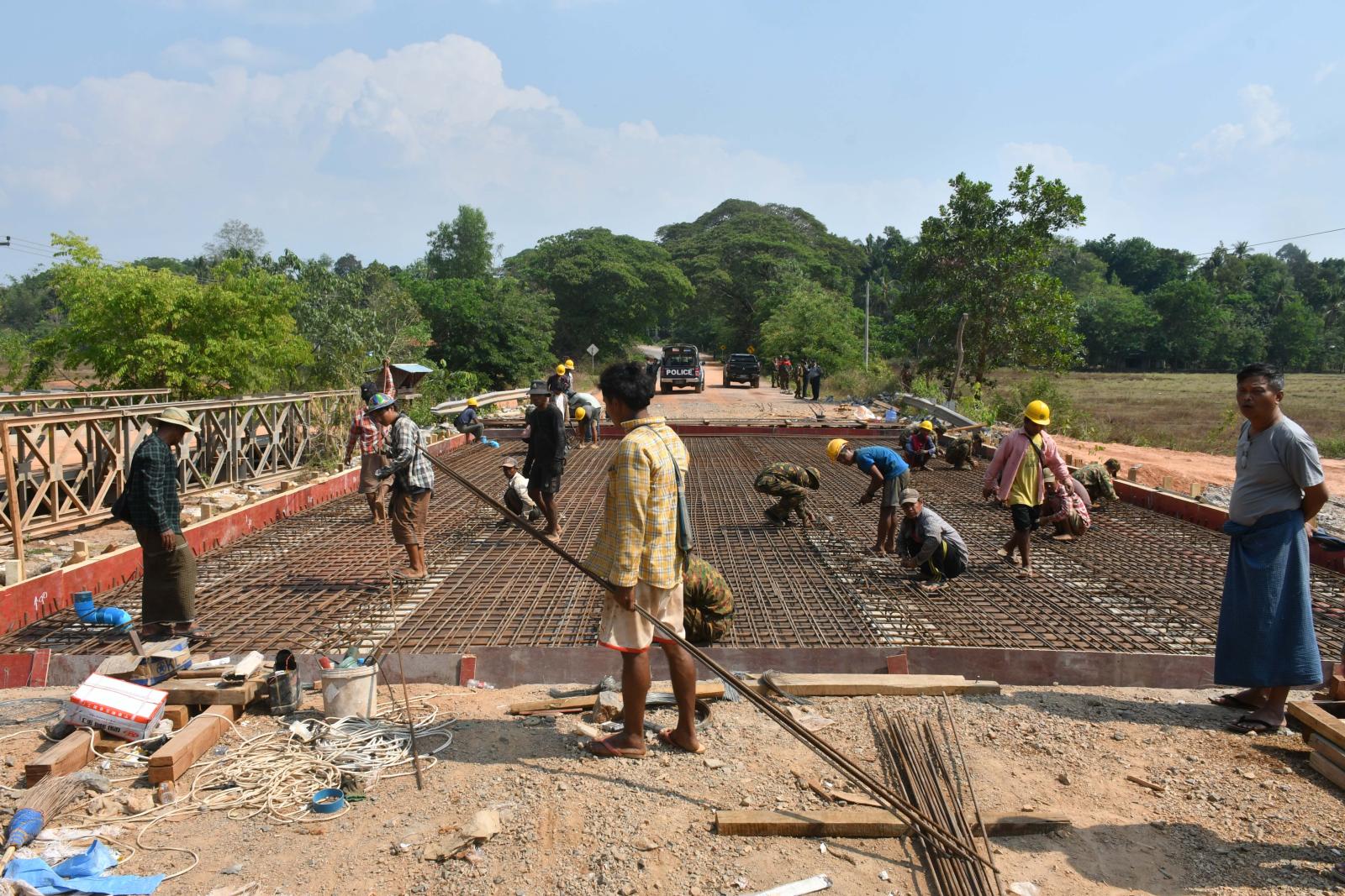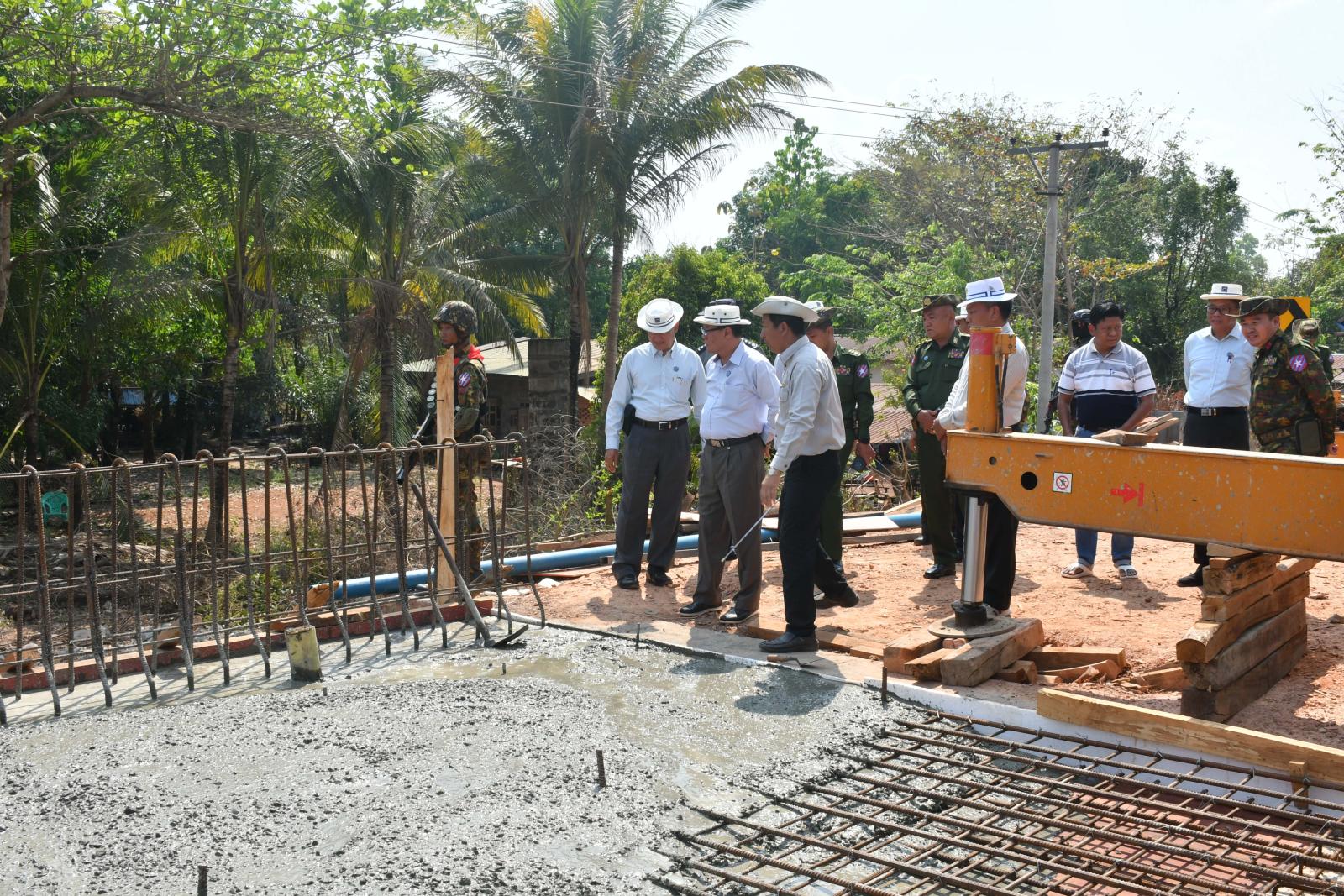 ထို့နောက် ပြည်နယ်ဝန်ကြီးချုပ်နှင့်တာဝန်ရှိသူများသည် သထုံ-ဘားအံ-ကော့ကရိတ်-မြဝတီလမ်းပေါ်ရှိ (ကျုံဒိုးမြို့နှင့်ကော့ကရိတ်မြို့ကြား) အကြမ်းဖက်သောင်းကျန်းသူများ၏မိုင်းခွဲဖျက်စီးခြင်းကြောင့် ထိခိုက်ပျက်စီးသွားသော ငါးတိုင်တံတားအား သံကူကွန်ကရစ်တံတားအသစ်တည်ဆောက်ခြင်း လုပ်ငန်းခွင်အား ကြည့်ရှုစစ်ဆေးရာ တာဝန်ရှိသူများ၏ ရှင်းလင်းတင်ပြမှုများအပေါ် လိုအပ်သည်များ ပေါင်းစပ်ညှိနှိုင်းဖြည့်ဆည်းဆောင်ရွက်ပေးပြီး တည်ဆောက်ရေးလုပ်ငန်းခွင်တွင် နယ်မြေခံတပ်မတော်သားများက ဝိုင်းဝန်းကူညီဆောင်ရွက်ပေးနေမှုအခြေအနေများကို ကြည့်ရှုအားပေးကာ အဆိုပါဒေသတွင် လုံခြုံရေးတာဝန်များထမ်းဆောင်ရွက်လျက်ရှိသော နယ်မြေခံတပ်မတော်သားများအား အသား၊ ငါး၊ လက်ဖက်၊ ဟင်းသီးဟင်းရွက်အစရှိသော စားသောက်ကုန်ပစ္စည်းများ ပေးအပ်ချီးမြှင့်ခဲ့သည်။