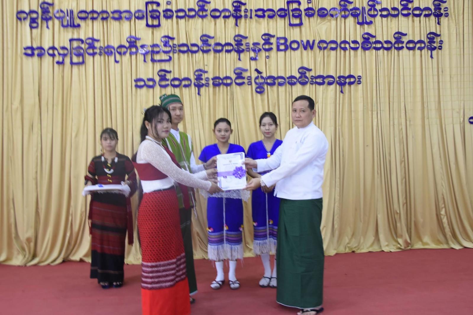 ထို့နောက် သယံဇာရေးရာဝန်ကြီး ဦးတင်သိန်းက သင်တန်းနည်းပြဆရာမများအား ဂုဏ်ပြုချီးမြှင့်ငွေပေးအပ်ပြီး တိုင်းရင်းသားရေးရာဝန်ကြီး ဦးစောလင်းအောင်က ကွန်ပျူတာ သင်တန်းသားများကိုယ်စား သင်တန်းသားတစ်ဦးအားလည်းကောင်း၊ ဥပဒေချုပ် ဦးခင်မောင်တင့်က အခြေခံစက်ချုပ်သင်တန်း၊ အလှခြင်းရက်နှင့် BOW ကလစ်သင်တန်းသားများကိုယ်စား သင်တန်းသားတစ်ဦးအားလည်းကောင်း သင်တန်းဆင်းလက်မှတ်များ အသီးသီးပေးအပ်ခဲ့ကြသည်။