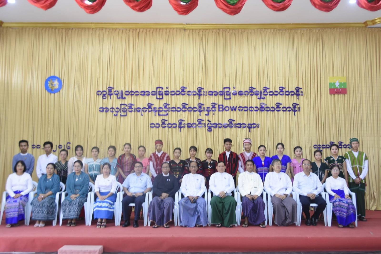 ဦးစွာ ပဲခူးတိုင်းဒေသကြီးအစိုးရအဖွဲ့၊ သယံဇာတရေးရာဝန်ကြီး ဦးတင်သိန်းက ယခုဖွင့်လှစ်ပေးခဲ့တဲ့ သင်တန်း(၄)ခုသည် တိုင်းရင်းသားလူငယ်တွေရဲ့ စာပေဘာသာစကား ဖွံ့ဖြိုးတိုးတက်ရေး၊ တိုင်းရင်းသားလူငယ်တွေရဲ့ လူမှုစီးပွားဘဝဖွံ့ဖြိုးတိုးတက်ရေး စတာတွေကို အထောက်အကူပြုမယ်လို့ ယုံကြည်ပါကြောင်း၊ ဒါကြောင့် တိုင်းရင်းသားစာပေဘာသာသင် ဆရာ/ဆရာမများအနေနဲ့ စာပေမြင့်မှ လူမျိုးတင့်မည်ဆိုသည့်စကားအတိုင်း ကွန်ပျူတာ နည်းပညာများကိုအသုံးချပြီး နိုင်ငံတော်ကို အကျိုးပြုတဲ့ ဆရာ/ဆရာမများဖြစ်လာအောင် ကြိုးစားကြပါ၊ တိုင်းရင်းသား လူငယ်မောင်မယ်များအနေနဲ့လည်း အခြေခံစက်ချုပ်သင်တန်း၊ အလှခြင်းရက်နှင့် BOW ကလစ်သင်တန်းများက သင်ကြားပေးလိုက်သော နည်းပညာရပ်များကို လက်တွေ့အသုံးချကာ ကိုယ်တိုင်ကြိုးစားအားထုတ်ပြီး တိုင်းရင်းသားလုပ်ငန်းရှင်များ ဖြစ်လာအောင် ကြိုးစားအားထုတ်ကြမယ်လို့ ယုံကြည်ပါကြောင်း သင်တန်းဆင်းအမှာစကား ပြောကြားခဲ့သည်။