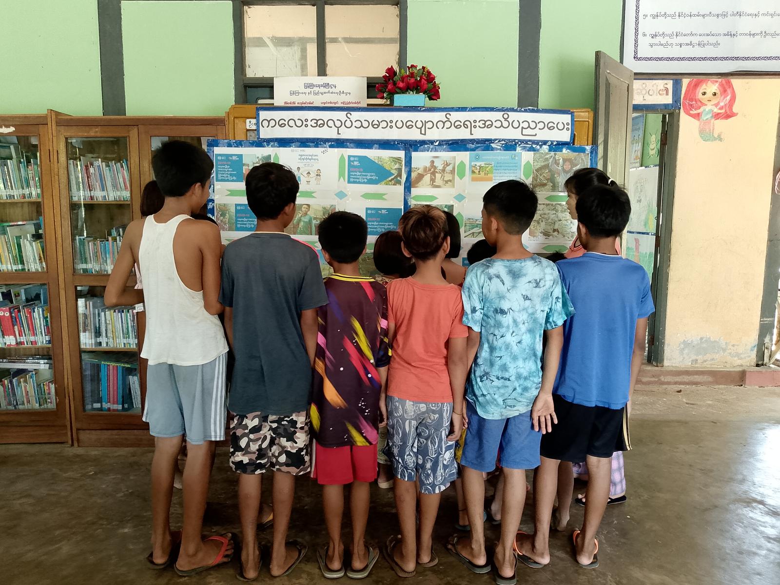 ဆက်လက်၍ ပြန်ကြားရေးနှင့်ပြည်သူ့ဆက်ဆံရေးဦးစီးဌာနမှ ဝန်ထမ်းများက ကလေးအလုပ်သမားနှင့်ပတ်သက်သည့် နံရံကပ်စာစောင်များအား ပြသရာ ကလေးငယ်များက စိတ်ပါဝင်စားစွာ လေ့လာကြည့်ရှုခဲ့ကြကြောင်း သိရသည်။