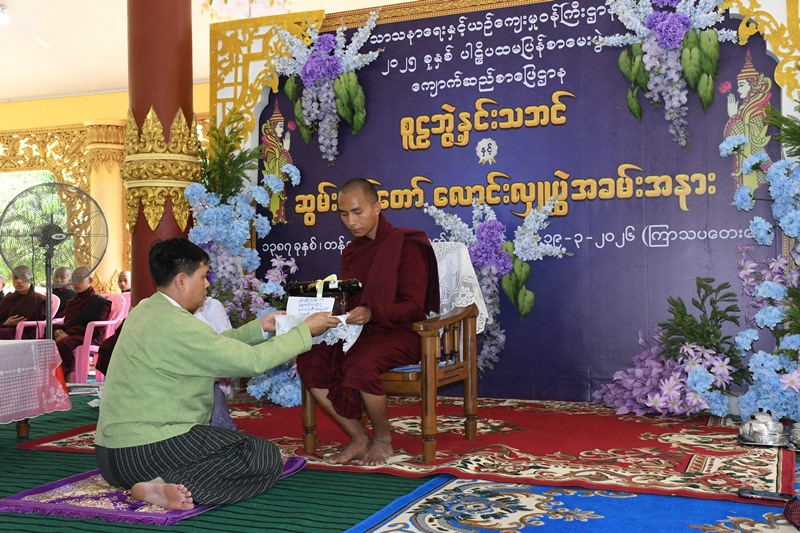 ထို့နောက် ကျောက်ဆည်ခရိုင်စီမံခန့်ခွဲရေးနှင့်အုပ်ချုပ်ရေးကော်မတီဥက္ကဋ္ဌ ဦးဇော်ဟိန်းအောင်နှင့် အဖွဲ့ဝင်များ၊ မြို့နယ်စီမံခန့်ခွဲရေးနှင့်အုပ်ချုပ်ရေးကော်မတီဥက္ကဋ္ဌ ဦးထိုက်ထိုက်ဇော်နှင့်အဖွဲ့ဝင်များ၊ တာဝန်ရှိသူများ၊ ဌာနဆိုင်ရာ တာဝန်ရှိသူများက စာအောင်သံဃာတော်များအား စာအောင်လက်မှတ်များနှင့် စာအောင်ဆုများ ဆက်ကပ်ခဲ့ကြောင်းနှင့် မန္တလေးတိုင်းဒေသကြီး၊ ဩဝါဓာစရိယ ဘဒ္ဒန္တဇနိတာဘိဝံသ အရှင်သူမြတ်ထံမှ အနုမောဒနာတရားနားယူ၍ ရေစက်သွန်းချ အမျှပေးဝေကာ အခမ်းအနားကို ဗုဒ္ဓသာသနံစိရံတိဌတု သုံးကြိမ်ရွတ်ဆို ဆုတောင်း၍ ရုပ်သိမ်းခဲ့ကြောင်း သိရသည်။