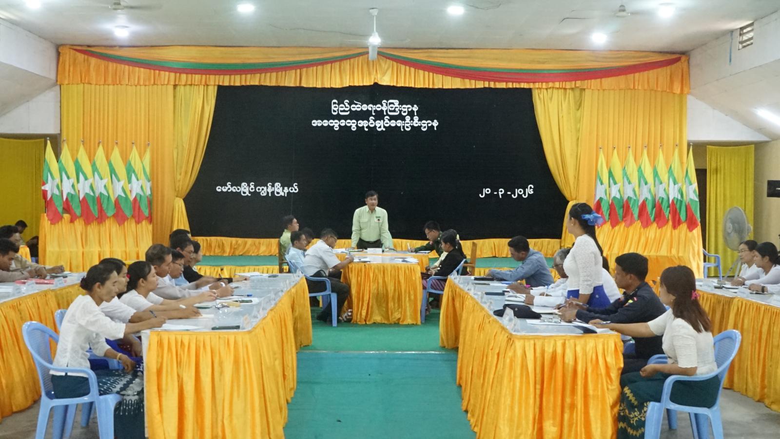 ဧရာဝတီတိုင်းဒေသကြီး၊ လပွတ္တာခရိုင်၊ မော်လမြိုင်ကျွန်းမြို့နယ်တွင် ခရိုင်စီမံခန့်ခွဲရေးနှင့် အုပ်ချုပ်ရေးကော်မတီဥက္ကဋ္ဌနှင့်တာဝန်ရှိသူများက မြို့နယ်အဆင့်ဌာနဆိုင်ရာအကြီးအကဲများနှင့်တွေ့ဆုံ၍ လုပ်ငန်းညှိနှိုင်းအစည်းအဝေးကို ယနေ့နံနက်ပိုင်းက မြို့နယ်အထွေထွေအုပ်ချုပ်ရေး ဦးစီးဌာန၊ မော်ဧရာအစည်းအဝေးခန်းမ၌ ကျင်းပသည်။