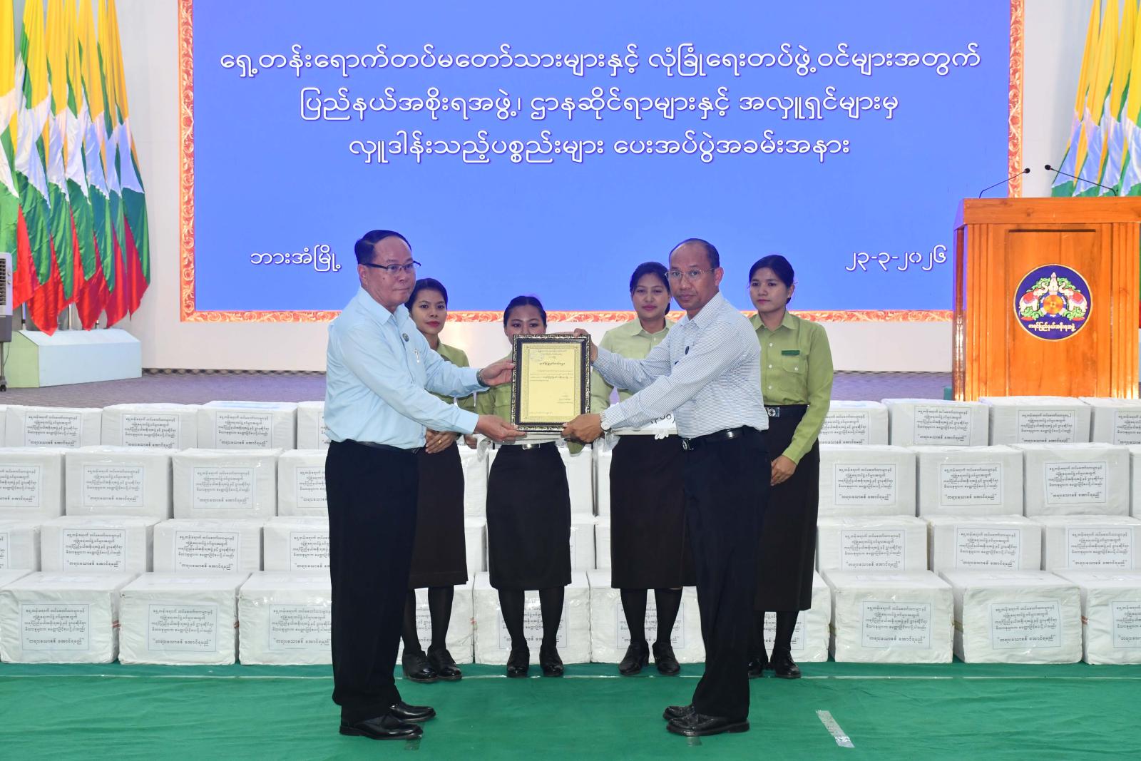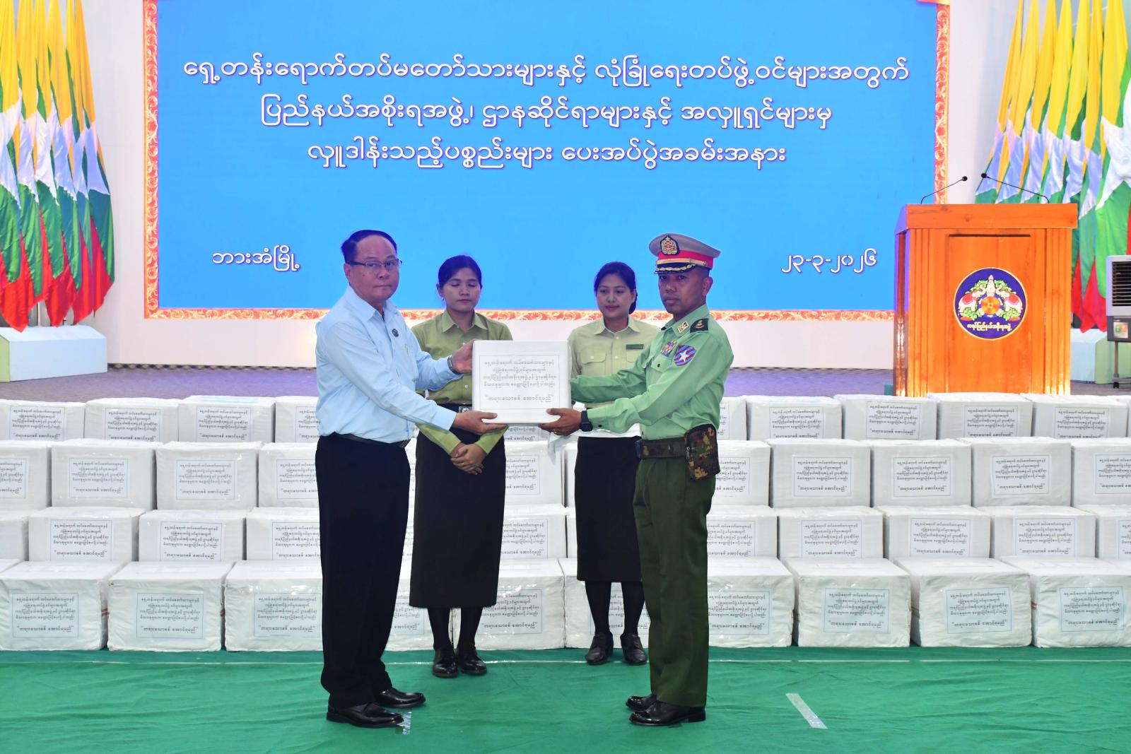 ထို့နောက် ပြည်နယ်ဝန်ကြီးချုပ်က စုစုပေါင်းငွေကျပ် ၉၃၁၅၀၀၀ဝ တန်ဖိုးရှိ စားသောက်ကုန်ပစ္စည်းများကို အရှေ့တောင်တိုင်းစစ်ဌာနချုပ်ဒုတိယတိုင်းမှူးထံချီးမြှင့်ပေးအပ်ပြီးလှူဒါန်းပေးကြသော ကရင်ပြည်နယ်အစိုးရအဖွဲ့၊ ဌာနဆိုင်ရာဝန်ထမ်းမိသားစုများနှင့်စေတနာရှင်အလှူရှင်များအား ဂုဏ်ပြု မှတ်တမ်းလွှာများပြန်လည်ပေးအပ်သည်။
