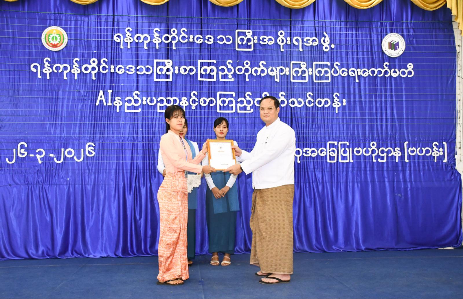 ဆက်လက်၍ ရန်ကုန်တိုင်းဒေသကြီး စာကြည့်တိုက်များကြီးကြပ်ရေးကော်မတီအဖွဲ့ဝင် ဒေါက်တာ ခင်လေးစိုးက AI နည်းပညာနှင့် စာကြည့်တိုက်သင်တန်း ဖွင့်လှစ်နိုင်မှုအခြေအနေ ရှင်းလင်းပြောကြားပြီး ရန်ကုန်တိုင်းဒေသကြီးအစိုးရအဖွဲ့ တိုင်းရင်းသားရေးရာဝန်ကြီးနှင့်တာဝန်ရှိသူများက AI နည်းပညာနှင့် စာကြည့်တိုက်သင်တန်း သင်တန်းထူးချွန်ဆုရရှိသူများနှင့်သင်တန်းသားများကို ထူးချွန်ဆုနှင့်သင်တန်းဆင်းလက်မှတ်များ ပေးအပ်ခဲ့ကြသည်။