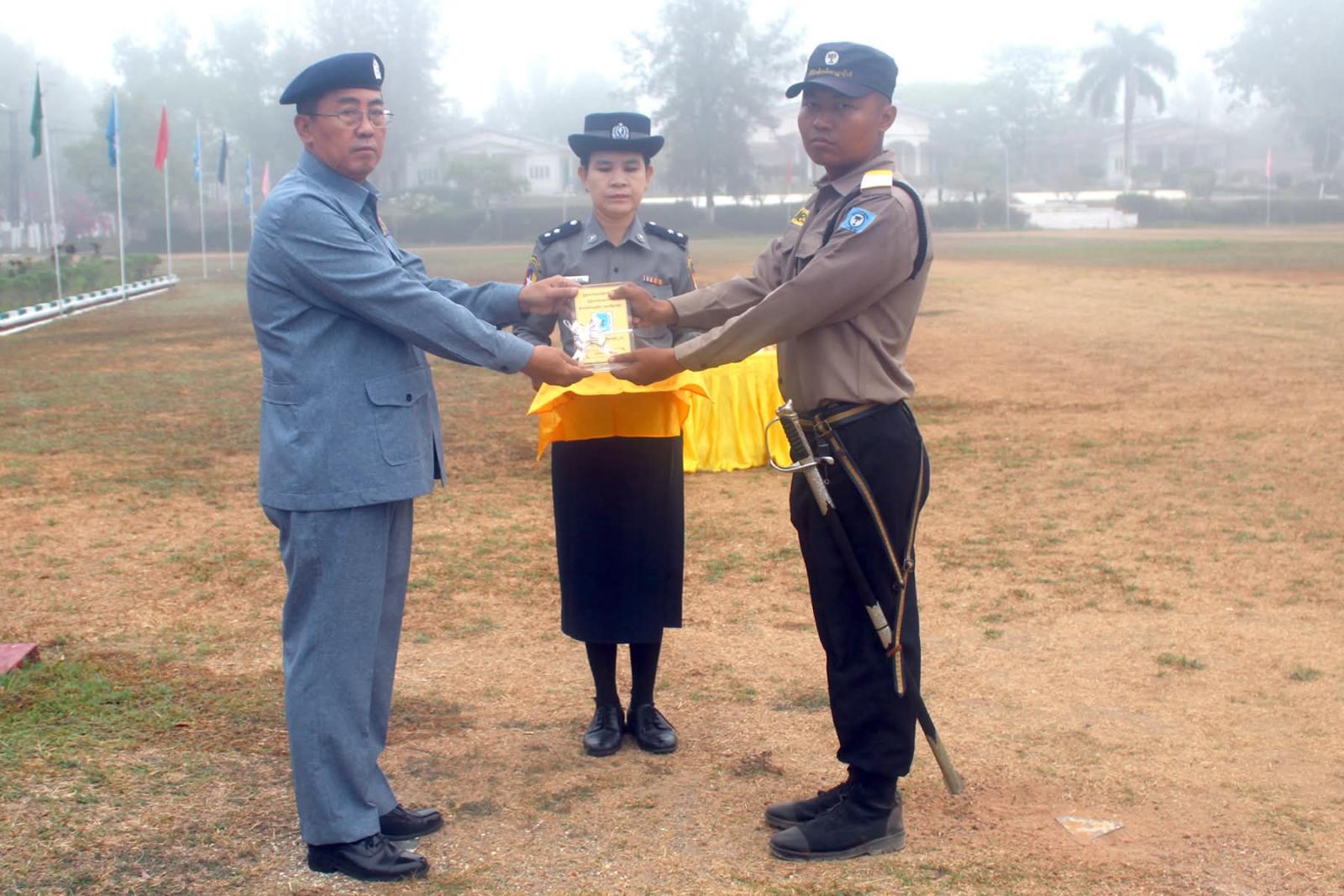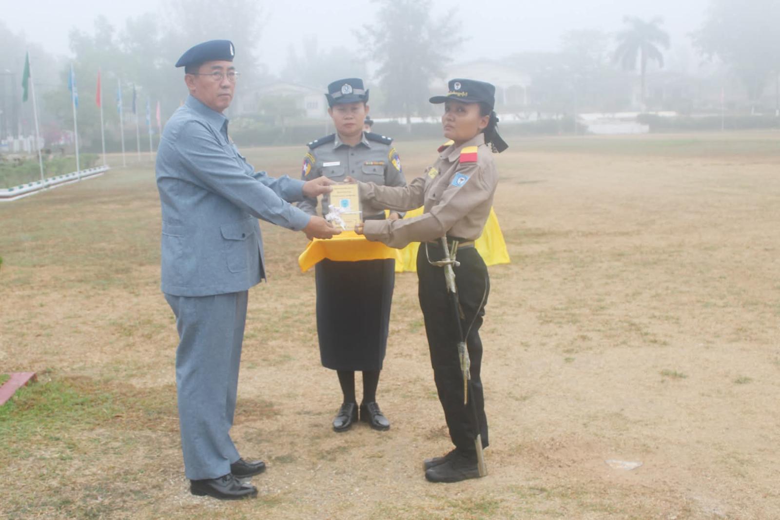 သင်တန်းဆင်း ဂုဏ်ပြုစစ်ရေးပြအခမ်းအနားတွင် ပါမောက္ခချုပ်က သင်တန်းသား စံပြဆုကို သင်တန်းသားအမှတ်-၂၉၅ ဦးအောင်ဘုန်းမြင့်၊ အငယ်တန်းစာရေး၊ အင်းစိန်မြို့နယ်အထွေထွေ အုပ်ချုပ်ရေးဦးစီးဌာန၊ ပြည်ထဲရေးဝန်ကြီးဌာနအားလည်းကောင်း၊ သင်တန်းသူစံပြဆုကို သင်တန်းသူအမှတ်-၇၅ ဒေါ်ထက်ထက်သိန်းဇော်ဝင်း၊ အငယ်တန်းအင်ဂျင်နီယာ-၃၊ သန်လျင်မြို့နယ်စည်ပင်သာယာရေးအဖွဲ့၊ ရန်ကုန် တိုင်းဒေသကြီးအစိုးရအဖွဲ့အားလည်းကောင်း၊ စာပေထူးချွန်ဆုကို သင်တန်းသူအမှတ်-၂၀၈ဒေါ်ရည်မွန်ကျော်၊ အငယ်တန်းအင်ဂျင်နီယာ-၃၊ လှည်းကူးမြို့နယ် စည်ပင်သာယာရေးအဖွဲ့၊ ရန်ကုန်တိုင်းဒေသကြီးအစိုးရအဖွဲ့အား လည်းကောင်း၊ သေနတ်ပစ်ထူးချွန်ဆုကို သင်တန်းသူအမှတ်-၃၇၆ ဦးဝေလင်းဖြိုး၊ အငယ်တန်းစာရေး၊ မြန်မာ့သစ်လုပ်ငန်း၊ သယံဇာတနှင့်သဘာဝပတ်ဝန်းကျင် ထိန်းသိမ်းရေးဝန်ကြီးဌာနအားလည်းကောင်း၊ စစ်ရေးပြထူးချွန်ဆုရရှိသူများနှင့် သင်တန်းဆင်းအောင်လက်မှတ်များကိုလည်းကောင်း ချီးမြှင့်ပေးခဲ့ပြီးနောက် သင်တန်းဆင်းမိန့်ခွန်းပြောကြားရာတွင် နိုင်ငံ့ဝန်ထမ်းတက္ကသိုလ်အနေနဲ့ သင်တန်းသား၊ သင်တန်းသူများကို အဂတိတရားကင်းစင်၍ စိတ်ဓာတ်နှင့် အကျင့်စာရိတ္တကောင်းမွန်တဲ့ ဝန်ထမ်းကောင်းများဖြစ်စေရန်နှင့် နိုင်ငံတော်က မျှော်မှန်းထားတဲ့ ကောင်းမွန်တဲ့ အုပ်ချုပ်ရေး၊ သန့်ရှင်းတဲ့အစိုးရ ဖြစ်ပေါ်လာစေရေးအတွက် နိုင်ငံ့ဝန်ထမ်းများရဲ့ အရည်အသွေးကို မြှင့်တင်လေ့ကျင့်ပေးလျက်ရှိပြီး ပြည်သူတို့ရဲ့ လိုအပ်ချက်ကို အပြည့်အဝဝန်ဆောင်မှုပေးနိုင်တဲ့ အရင်းခံ စိတ်ဓာတ်ရှိသူများ ဖြစ်လာစေရန်၊ နိုင်ငံ့ဝန်ထမ်းများ ဖြစ်သည်နှင့်အညီ မိမိနိုင်ငံနှင့်လူမျိုး အကျိုးစီးပွားကို အစဉ်တစိုက် တိုးတက်အောင် ဆောင်ရွက်ကြရမှာဖြစ်ပြီး မည်သည့်အခြေအနေ မျိုးတွင်မဆို မိမိတို့၏ မူလလုပ်ငန်းတာဝန်ကို ကျေပွန်စွာထမ်းဆောင်ပြီး ပိုမိုခိုင်မာ အားကောင်းတဲ့ နိုင်ငံ့ဝန်ထမ်းအဖွဲ့အစည်းဖြစ်အောင် ဆောင်ရွက်သွားကြရန်၊ ဒို့တာဝန်အရေးသုံးပါးကို ဦးထိပ်ပန်ဆင်ပြီး ပြည်ထောင်စုစိတ်ဓာတ် အစဉ်ထာဝရ ရှင်သန်ကိန်းအောင်းနေစေရေး ဗဟုသုတ၊ အတွေးအခေါ်၊ ဉာဏ်အမြော်အမြင်များ မှန်ကန်မြင့်မား စေရေး၊ အမှန်နှင့်အမှား ဝေဖန်ပိုင်းခြားနိုင်မှုရှိစေရေး၊ စိတ်ဓာတ်ကြံ့ခိုင်ကောင်းမွန်ရေး၊ ဗလငါးတန်နှင့် ပြည့်စုံတဲ့ ထူးချွန်ထက်မြက်သူများ ဖြစ်စေရေး ကြိုးစားဆောင်ရွက်သွားကြရန်၊ နိုင်ငံတော်နှင့် ပြည်သူလူထုရဲ့ အကျိုးစီးပွားကို ဦးထိပ်ပန်ဆင်ပြီး အထက်က ပေးအပ်လာတဲ့ မည်သည့်တာဝန်မျိုးကိုမဆို ကျေပွန်စွာ သယ်ပိုးထမ်းရွက်နိုင်မယ့် နိုင်ငံ့ဝန်ထမ်းများ ဖြစ်လာစေရန်၊ မိမိကိုယ်တိုင်ရွေးချယ်ထားတဲ့ နိုင