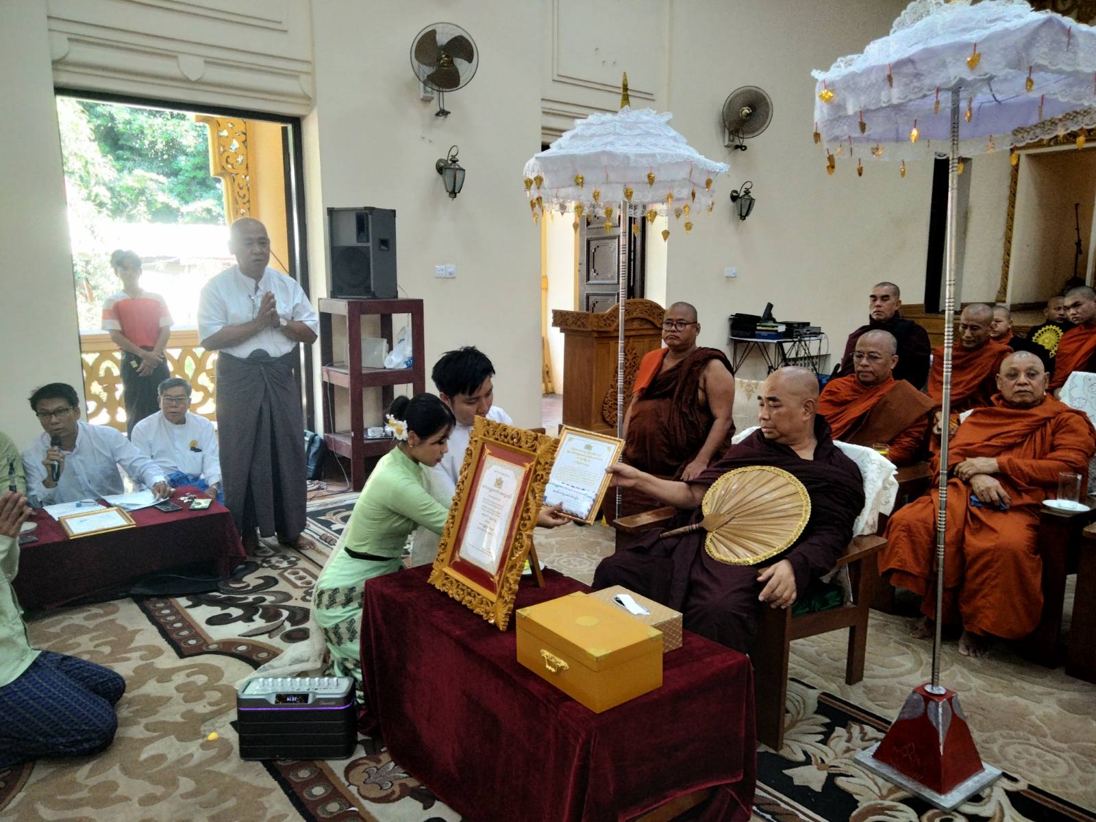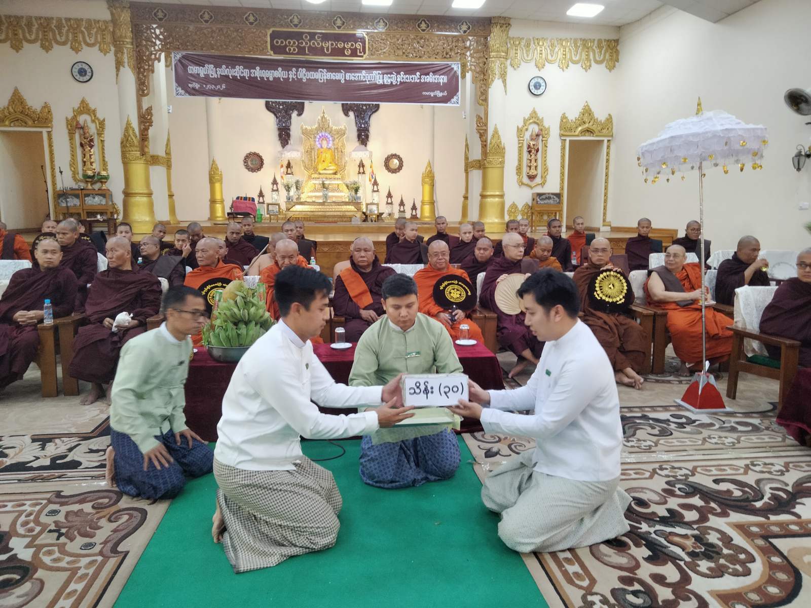 ဆက်လက်၍ ရန်ကုန်တိုင်းဒေသကြီးသံဃာနာယကအဖွဲ့ဥက္ကဋ္ဌ ဆရာတော် ထံမှငါးပါးသီလ ခံယူဆောက်တည်ကာ မြို့နယ်စီမံခန့်ခွဲရေးနှင့် အုပ်ချုပ်ရေးကော်မတီဥက္ကဋ္ဌ ဦး ကောင်းမြင့်သူက သာသနာရေးဆိုင်ရာများကို လျှောက်ထားခဲ့ပြီး အလှူရှင်များအားဂုဏ်ပြုမှတ်တမ်းလွှာများ ပေးအပ်ခဲ့သည်။