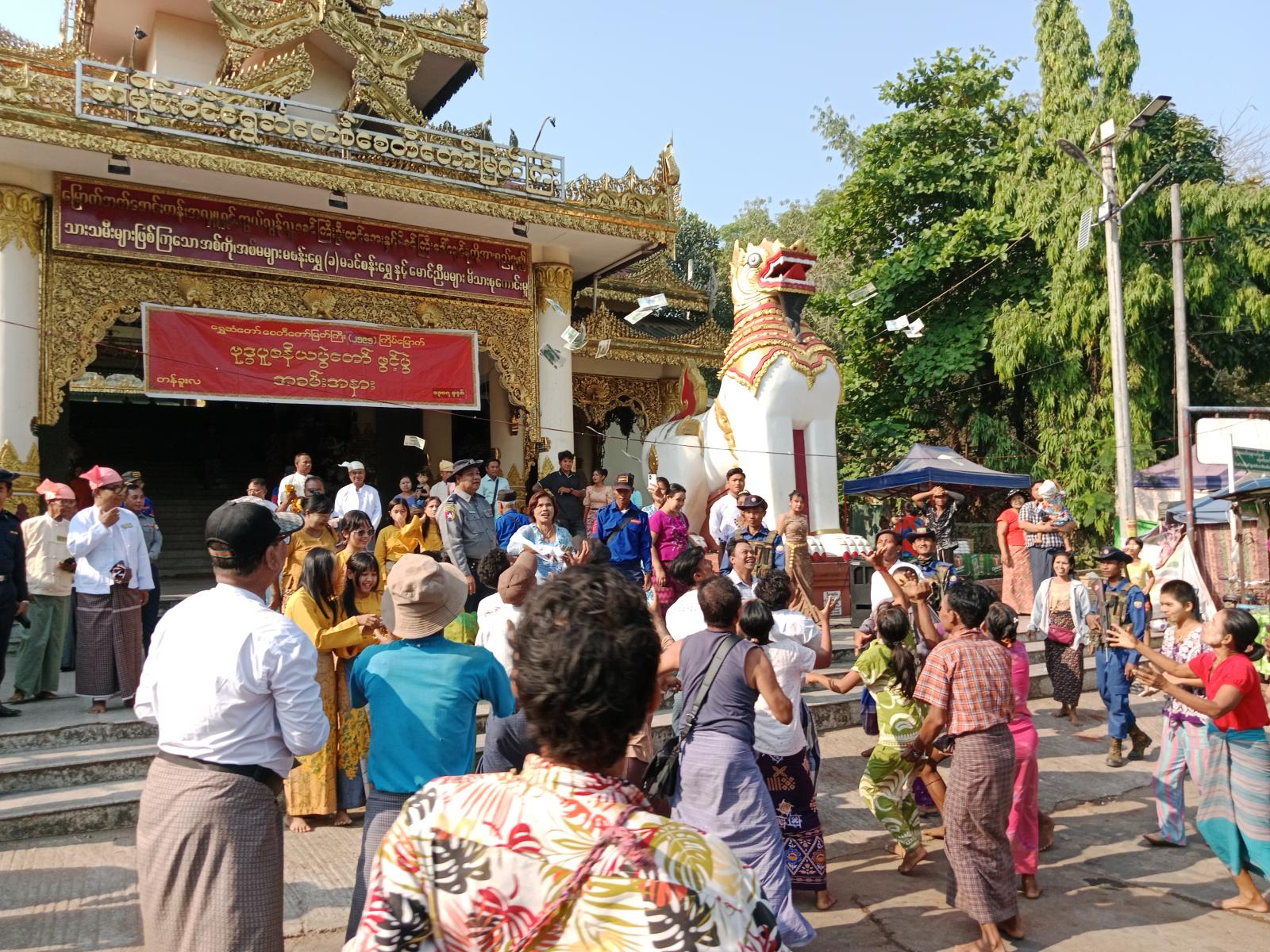 အခမ်းအနားတွင် တိုင်းဒေသကြီး လွှတ်တော်ကိုယ်စားလှယ် ဦးနေဝင်း၊ ခရိုင်စီမံခန့်ခွဲရေးနှင့်အုပ်ချုပ်ရေးကော်မတီဥက္ကဋ္ဌ ဦးညွန့်နွယ်၊ ခရိုင်ခေတ္တရဲတပ်ဖွဲ့မှူး ရဲမှူးအောင်နိုင်ဝင်း၊ မြို့နယ်စီမခန့်ခွဲရေးနှင့်အုပ်ချုပ်ရေးကော်မတီဥက္ကဋ္ဌ ဦးခင်မောင်မြင့်၊ ရွှေဆံတော်ဘဏ္ဍာတော်ထိန်းဂေါပကဥက္ကဋ္ဌဦးအေးကိုတို့က ဖဲကြိုးဖြတ်ဖွင့်လှစ်ပေးသည်။ ဆက်လက်၍ အလှူရှင်များက ရွှေမိုး၊ ငွေမိုးများရွာသွန်းပေးခဲ့ကြောင်းသိရသည်။