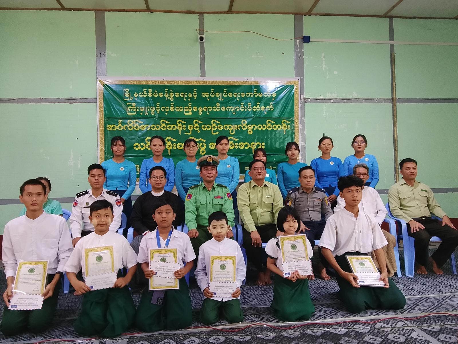 ထို့နောက် ယဥ်ကျေးလိမ္မာနှင့် အင်္ဂလိပ်စာအခြေခံသင်တန်းပို့ချခဲ့သော ဆရာမများအား မြို့နယ်စီမံခန့်ခွဲရေးနှင့်အုပ်ချုပ်ရေးကော်မတီ ဥက္ကဋ္ဌနှင့် အဖွဲ့ဝင်များက ဂုဏ်ပြုထောက်ပံ့ပေးအပ်ခြင်း ယဥ်ကျေးလိမ္မာနှင့် အင်္ဂလိပ်စာအခြေခံသင်တန်းတို့တွင် ထူးချွန်ကျောင်းသား/ကျောင်းသူ(၆)ဦးတို့အား မြို့နယ်စီမံခန့်ခွဲရေးနှင့်အုပ်ချုပ်ရေးကော်မတီအဖွဲ့များက ဆုများ ပေးအပ်ခဲ့သည်။