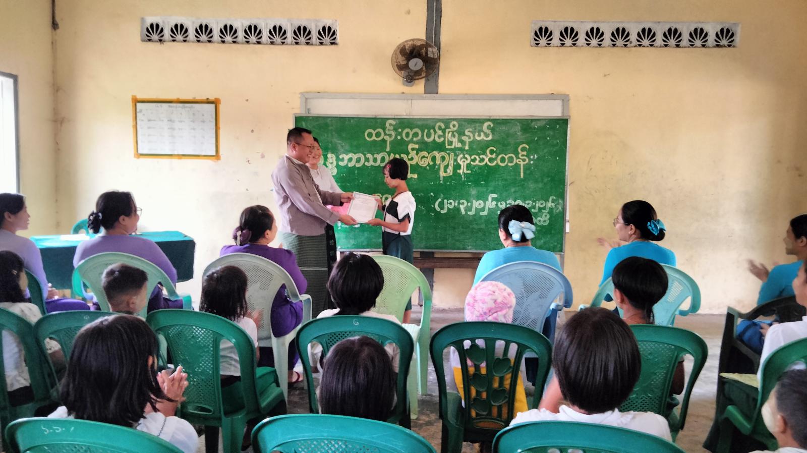 ဆက်လက်၍ မြို့နယ်စီမံခန့်ခွဲရေးနှင့်အုပ်ချုပ်ရေးကော်မတီဥက္ကဋ္ဌ ဦးသန်းထိုက်အောင်၊ မြို့နယ်ပညာရေးမှူးကိုယ်စား ဦးဇာဏီမောင် ဒုတိယမြို့နယ်ပညာရေးမှူး (စီမံ / ဘဏ္ဍာ) နှင့် မြို့နယ်အမျိုးသမီးရေးရာအဖွဲ့ဥက္ကဋ္ဌ ဒေါ်ခိုင်စန္ဒာထွန်းနှင့် အဖွဲ့ဝင်များ၊ မြို့နယ်မိခင်နှင့်ကလေးစောင့်ရှောက်အသင်းဝင်များက အခြေခံဗုဒ္ဓဘာသာယဥ်ကျေးလိမ္မာသင်တန်း တက်ရောက်ကြသော ကျောင်းသား၊ ကျောင်းသူများအား သင်တန်းဆင်းဂုဏ်ပြုမှတ်တမ်းလွှာများ ပေးအပ်ခဲ့သည်။