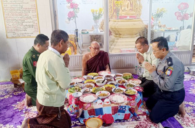 ရှေးဦးစွာ ပါဠိပထမပြန်စာမေးပွဲကြီးကြပ် ဆရာတော်ကြီးများနှင့် စာဖြေသံဃာတော်အရှင်သူမြတ်တို့အား မြို့နယ်စီမံခန့်ခွဲရေးနှင့် အုပ်ချုပ်ရေးကော်မတီ(ခေတ္တ)ဥက္ကဋ္ဌ ဦးကျော်မင်းထက်၊ အတွင်းရေးမှူး မြို့နယ်ရဲတပ်ဖွဲ့မှူး ရဲမှူးကြည်စိုး၊ ဗိုလ်မှူးသောင်းထွဋ်လွင်နှင့် အဖွဲ့ဝင်များ၊ ရပ်ကွက်အုပ်ချုပ်ရေးမှူးများနှင့် မြို့နယ်အဆင့်ဌာနဆိုင်ရာများနှင့် အလှူရှင်များက ဆွမ်းဘောဇဉ်အချို အဟာရများဖြင့် ဆက်ကပ်လှူဒါန်းကြသည်။
