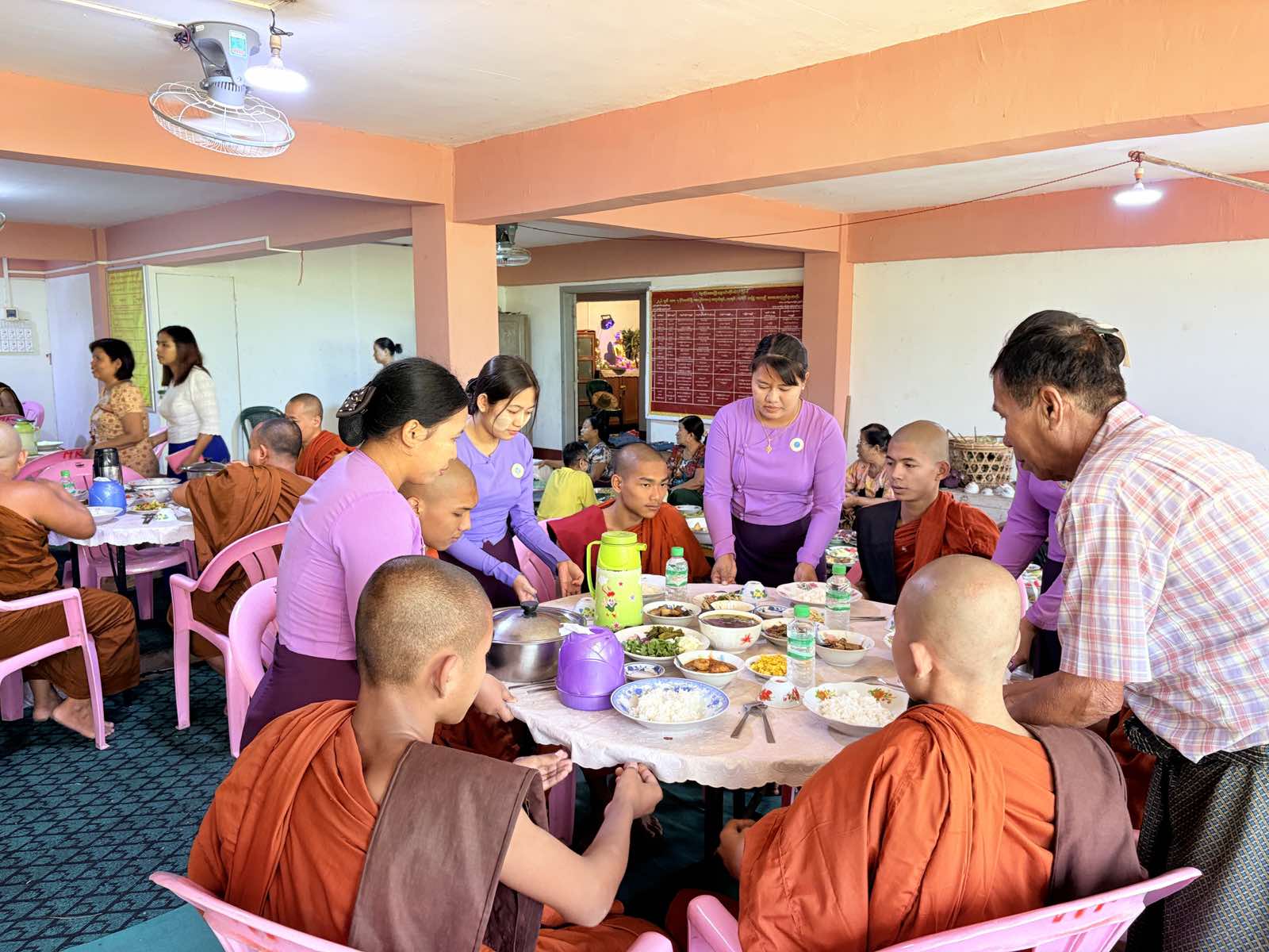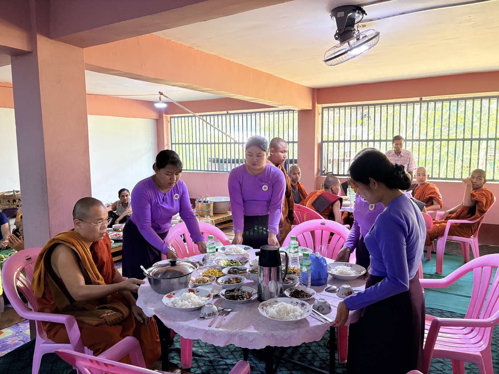 ထိုသို့ နေ့ဆွမ်းဆက်ကပ်လှူဒါန်းရာတွင် မြို့နယ်စီမံခန့်ခွဲရေးနှင့် အုပ်ချုပ်ရေးကော်မတီဥက္ကဋ္ဌ ဦးယဥ်ထွေး၊ ဌာနဆိုင်ရာအကြီးအကဲတာဝန်ရှိသူများ၊ မြို့နယ်အမျိုးသမီးရေးရာအဖွဲ့ဥက္ကဋ္ဌ ဒေါ်လှလှရွှေနှင့် အဖွဲ့ဝင်များ၊ မိခင်နှင့် ကလေးစောင့်ရှောက်ရေးအသင်းဝင်များမှ မြို့နယ်သံဃာ့နာယက ဩဝါဒစရိယဆရာတော်များ၊ စာမေးပွဲကြီးကြပ်ရေးဆရာတော်ကြီးများ၊ ရဟန်း၊ ရှင်သာမဏေ၊ သီလရှင်များအား နေ့ဆွမ်းနှင့်အချိုပွဲများ ဆပ်ကပ်လှူဒါန်းခဲ့ကြသည်။