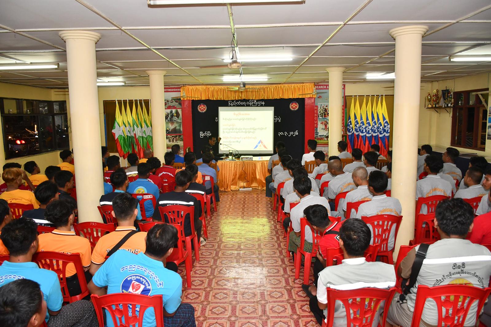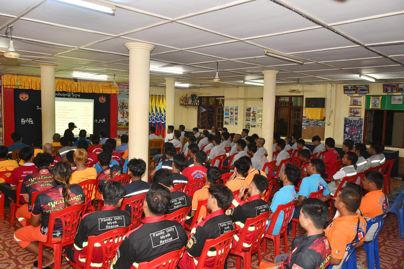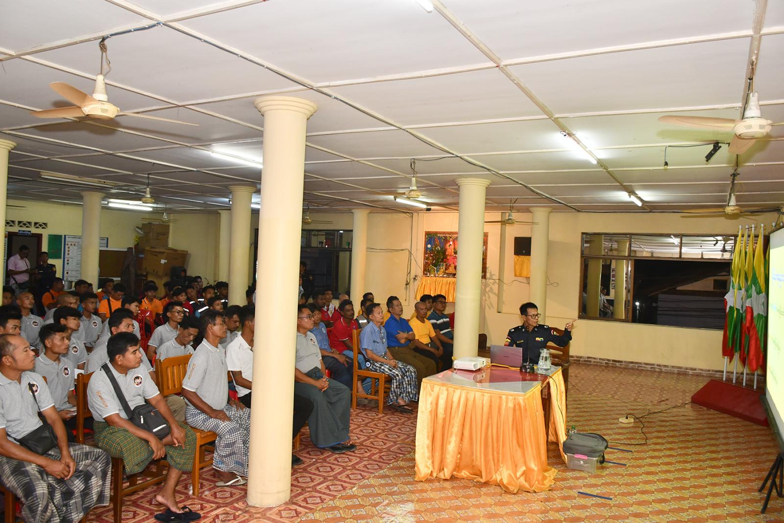 အသိပညာပေး ဆွေးနွေးရာတွင် ခရိုင်မီးသတ်ဦးစီးမှူး ဦးဇော်ဝင်းက မီးလောင်မှုအခြေခံ သဘောတရားများ၊ မီးလောင်မှုများတွင် ဖြစ်ပွားတတ်သောဘေးအန္တရာယ်များ၊ ဘေးအန္တရာယ် ဖြစ်ပွားသည့်နေရာသို့ ချဉ်းကပ်ဝင်ရောက်နည်းများ၊ အသက်ကယ်နည်းစနစ်များ၊ လူနာသယ်ဆောင်နည်းများ၊ အဖွဲ့အစည်းအလိုက် လုပ်ဆောင်ရမည့်လုပ်ငန်းစဉ်များ၊ မီးသတ်တပ်ဖွဲ့သို့ ကူညီဆောင်ရွက်ပေးရမည့် ကဏ္ဍများ၊ မီးသတ်ယာဉ်၊ လူနာတင်ယာဉ်နှင့် အခြားအရေးကြီးယာဉ်များ နေရာယူရမည့်စနစ်များအကြောင်းကို အကျယ်တဝင့် ပညာပေး ဟောပြောဆွေးနွေးသည်။