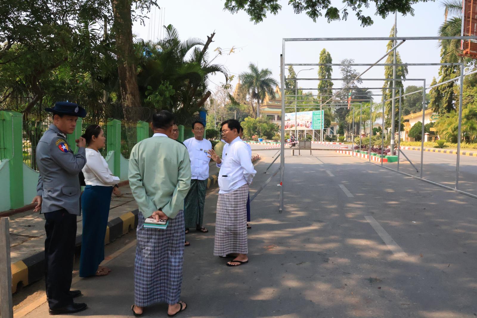 ကယားပြည်နယ်ဝန်ကြီးချုပ်နှင့် တာဝန်ရှိသူများသည် ယမန်နေ့ နေ့လယ်က ၂၀၂၆ ခုနှစ်၊ မဟာ သင်္ကြန်ပွဲတော်ကျင်းပမည့် ကန္ဒာဟေဝန်ပန်းခြံ၊ ကျောက်သားရင်ပြင်အတွင်း ဗဟိုမဏ္ဍပ်ဆောက်လုပ်နေမှုနှင့် လမ်းလျှောက်သင်္ကြန် ကျင်းပမည့်နေရာ တည်ဆောက်နေမှုတို့ကို ကြည့်ရှုစစ်ဆေးရာ တာဝန်ရှိသူများကလုပ်ငန်းများ ဆောင်ရွက်ပြီးစီးမှုအခြေအနေကို ရှင်းလင်း တင်ပြသည်။