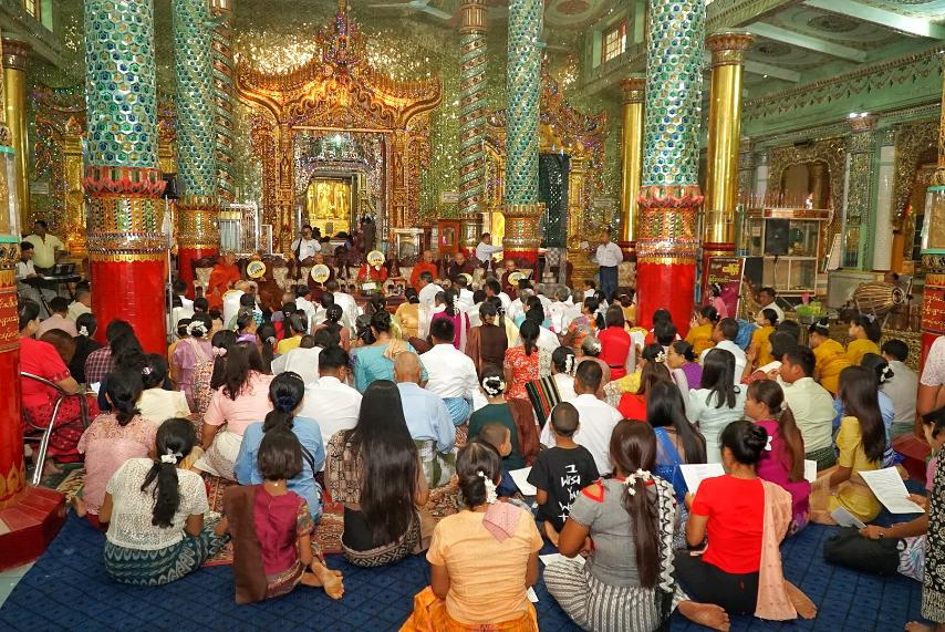 ရှေးဦးစွာ သီဟိုဠ်ရှင်မြတ်စွာဘုရားစေတီတော်ကြီး လုံးတော်ပြည့်ရွှေသင်္ကန်းရာနှုန်းပြည့်ကပ်လှူခြင်း အောင်ပွဲအထိမ်းအမှတ်ဘုရားအနေကဇာတင်ဗုဒ္ဓပူဇနိယပွဲတော်ကို နံနက် ၇ နာရီအချိန်က ကျင်းပရာ ကြွရောက်တော်မူလာကြသော ဆရာတော် သံဃာတော်များနှင့် ဧည့်သည်တော်များက နမောတဿသုံးကြိမ်ရွတ်ဆို၍ အခမ်းအနားဖွင့်လှစ်ကြပြီး မြို့နယ်သံဃနာယကအဖွဲ့ဥက္ကဋ္ဌ ဘဒ္ဒန္တအရိယဝံသ(အဂ္ဂမဟာကဏ္ဍိတ) ဆရာတော်အရှင်သူမြတ်ထံမှ ရှစ်ပါးသီလခံယူဆောက်တည်ကြသည်။