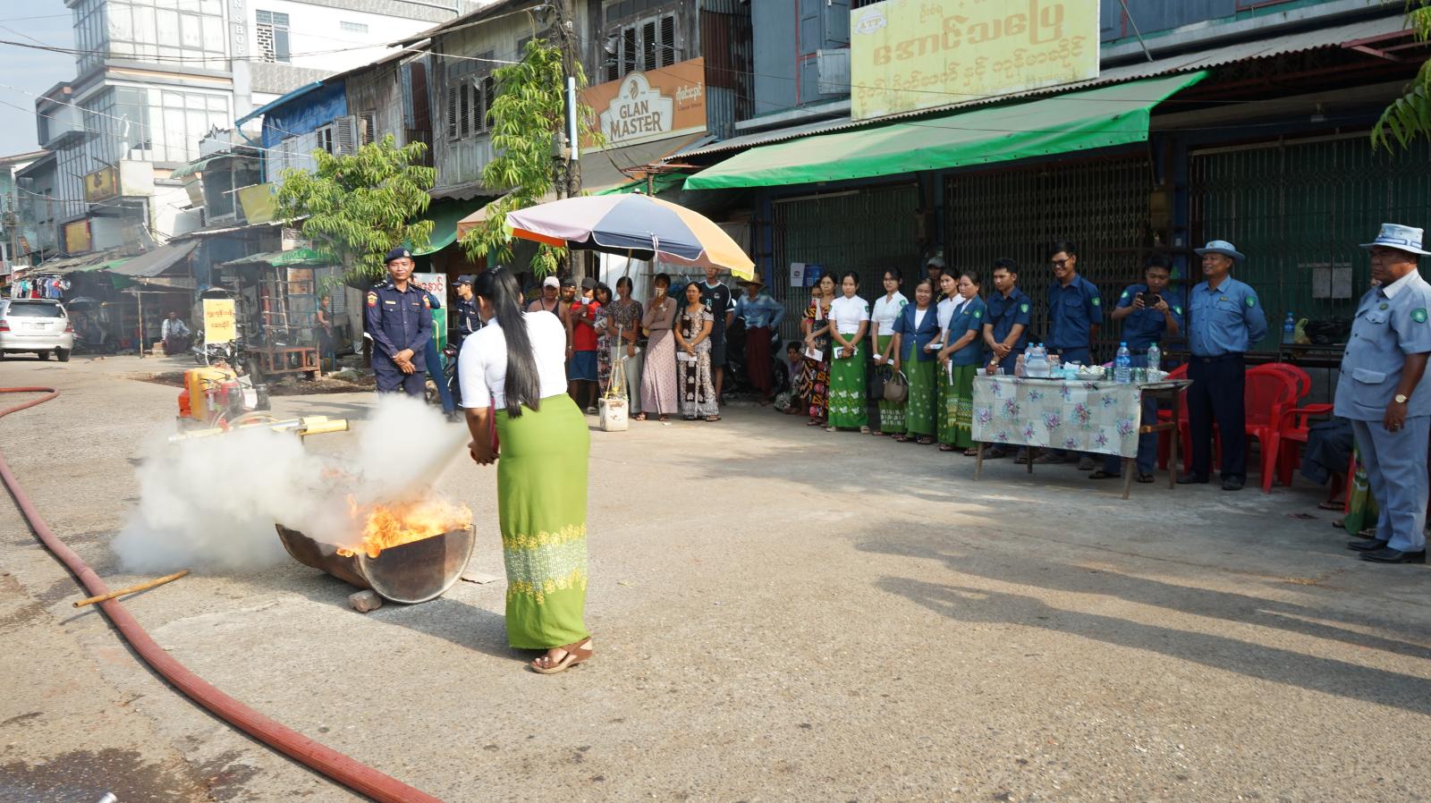 အသိပညာပေးဟောပြောခြင်းနှင့် မီးငြှိမ်းသတ်နည်း သရုပ်ပြဆောင်ရွက်ရာသို့ မြို့နယ်စီမံခန့်ခွဲရေးနှင့် အုပ်ချုပ်ရေးကော်မတီဥက္ကဋ္ဌ၊ ဦးဇော်ဝင်းလှိုင်နှင့်ကော်မတီဝင်များ၊ မြို့နယ်စည်ပင်သာယာရေးအဖွဲ့၊ အမှုဆောင်အရာရှိ ဦးခင်ညွန့်နှင့်ဝန်ထမ်းများ၊ မြို့နယ်မီးသတ်ဦးစီးဌာန၊ ဦးစီးအရာရှိ ဦးထွန်းအောင်နှင့်ဝန်ထမ်းများ၊ ဌာနဆိုင်ရာများ၊ ဈေးသူဈေးသားများတက်ရောက်ကြပြီး မြို့နယ်မီးသတ်ဦးစီးအရာရှိ ဦးထွန်းအောင်က မီးဘေးလုံခြုံရေးအတွက် လိုက်နာဆောင်ရွက်ရမည့်အချက်များနှင့် ရှောင်ရှားရမည့် အချက်များအား အသိပညာပေးဟောပြော၍ ဂက်(စ်)မီးဖိုကြောင့် မီးလောင်ကျွမ်းမှုအား ငြှိမ်းသတ်နည်း၊ လောင်စာဆီကြောင့် လောင်ကျွမ်းသောမီးအား ငြှိမ်းသတ်နည်း၊ ရေစိုမီးငြှိမ်းသတ်နည်းတို့ကို သရုပ်ပြဆောင်ရွက်ခဲ့ပြီး စည်ပင်သာယာရေးအဖွဲ့ဝန်ထမ်းများနှင့် ဈေးသူဈေးသားများအား လက်တွေ့မီးငြှိမ်းသတ်စေခဲ့ကြောင်း သိရသည်။