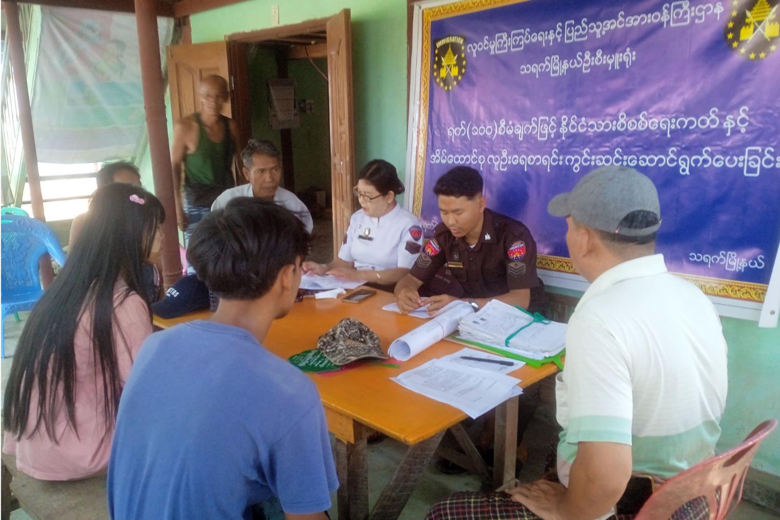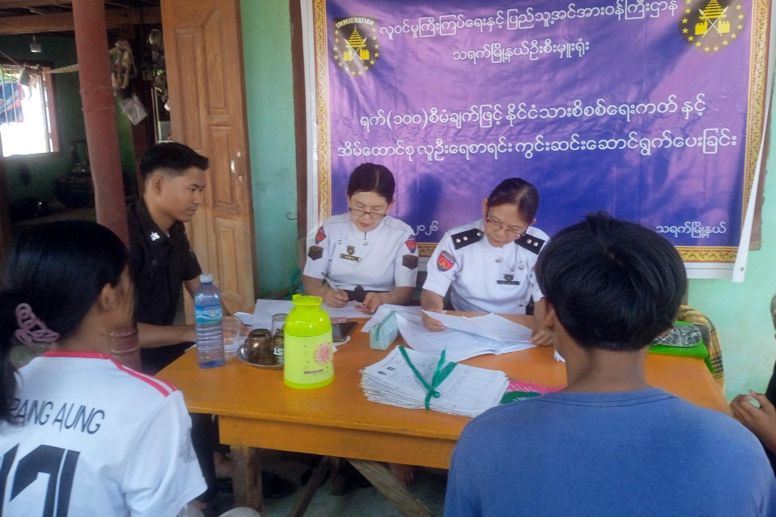 မကွေးတိုင်းဒေသကြီး သရက်မြို့၌ မြို့နယ်လူဝင်မှုကြီးကြပ်ရေးနှင့်ပြည်သူ့အင်အားဝန်ကြီးဌာန မြို့နယ်ဦးစီးမှူး ဦးစိုးနိုင်ဝင်းနှင့် ဝန်ထမ်းများက ယမန်နေ့နံနက်ပိုင်းက အမှတ်(၅)ရပ်ကွက်၌ အသက် (၁၀)နှစ်မှ (၁၈)နှစ်ကြား၊ အသက် (၁၈)နှစ်အထက် နိုင်ငံသားစိစစ်ရေးကတ်မရှိသူများအား ရက်(၁၀၀) စီမံချက်ဖြင့် နိုင်ငံသားစိစစ်ရေးကတ်နှင့် အိမ်ထောင်စုများအား အမှတ်(၅)ရပ်ကွက်ရုံးတွင် ကွင်းဆင်းဆောင်ရွက်ပေးလျက်ရှိကြောင်း သိရသည်။