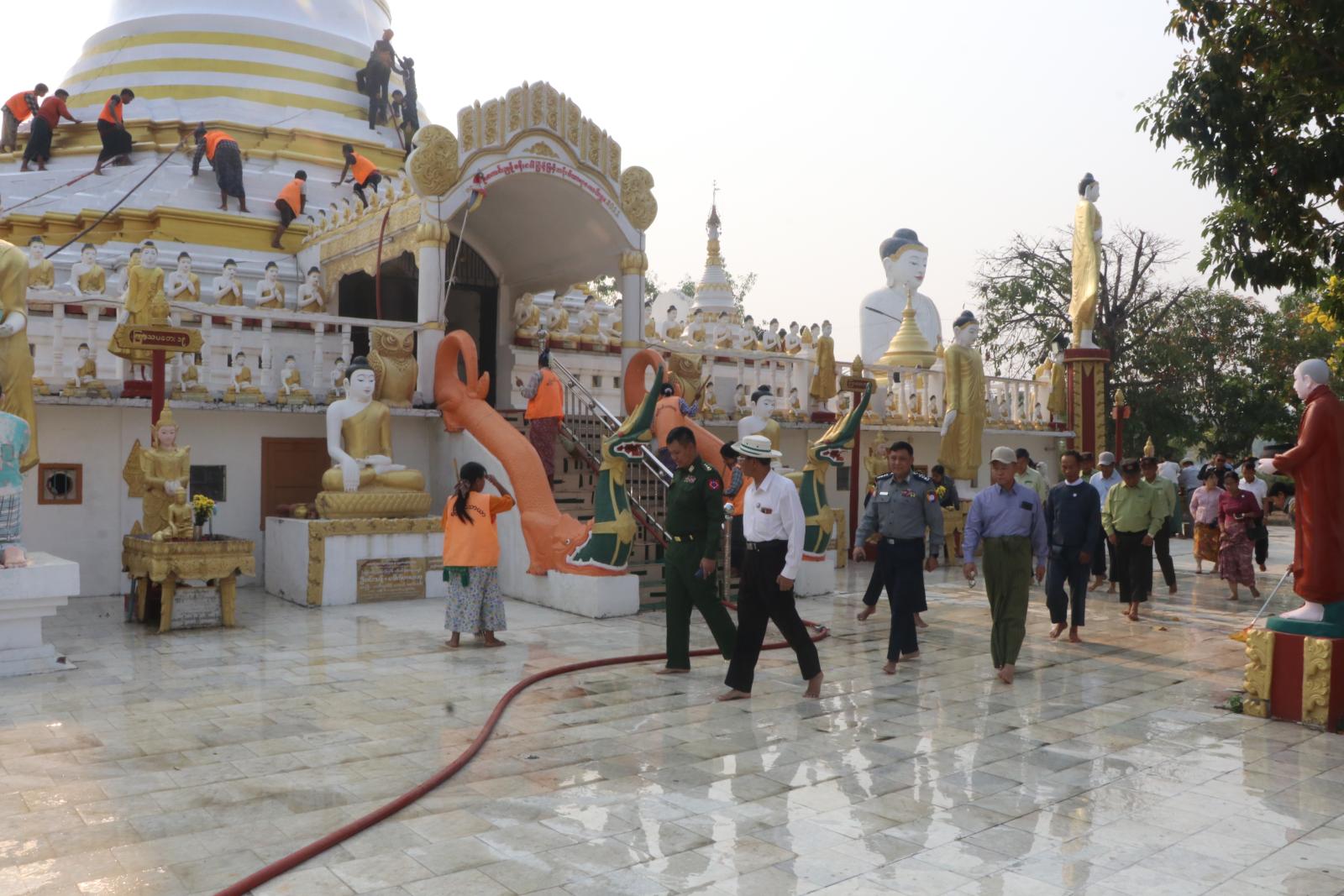 စစ်ကိုင်းတိုင်းဒေသကြီးအစိုးရအဖွဲ့ဝင်များ၊ တိုင်းဒေသကြီးအဆင့် ဌာနဆိုင်ရာများနှင့် တာဝန်ရှိသူများသည် ဧပြီလ ၄ ရက်၊ နံနက်ပိုင်းတွင် မုံရွာမြို့အား မြို့အင်္ဂါအရပ်နှင့်အညီ သန့်ရှင်းသပ်ရပ်သာယာလှပစေရေးနှင့် ဘုရားဖူးပြည်သူများ စိတ်အေးချမ်းသာစွာဖြင့် ဖူးမျှော်နိုင်စေရန်အတွက် မုံရွာမြို့၊ အရှေ့ဘက်ကန်သာယာကန်ရှိ မြို့ရာပြည့်ကပ် ကျော်စေတီတော်ကြီး ပရဝုဏ်အတွင်း မုံရွာမြို့ပေါ်ရှိ တိုင်းဒေသကြီး/ခရိုင်/ မြို့နယ်အဆင့် ဌာနဆိုင်ရာများမှဝန်ထမ်းများ၊ အထွေထွေအုပ်ချုပ်ရေးဦးစီးဌာနမှဝန်ထမ်းများ၊ မြန်မာနိုင်ငံရဲတပ်ဖွဲ့ဝင်များ၊ မီးသတ်တပ်ဖွဲ့ဝင်များ၊ စည်ပင်သာယာရေးအဖွဲ့များနှင့် ရပ်ကွက်နေပြည်သူများ စုစုပေါင်းအင်အား ၅၀၀ ဦးကျော်ဖြင့် စုပေါင်း၍ သန့်ရှင်းရေးလုပ်ငန်းများ ဆောင်ရွက်နေမှုများအား လိုက်လံကြည့်ရှုခဲ့ကြသည်။