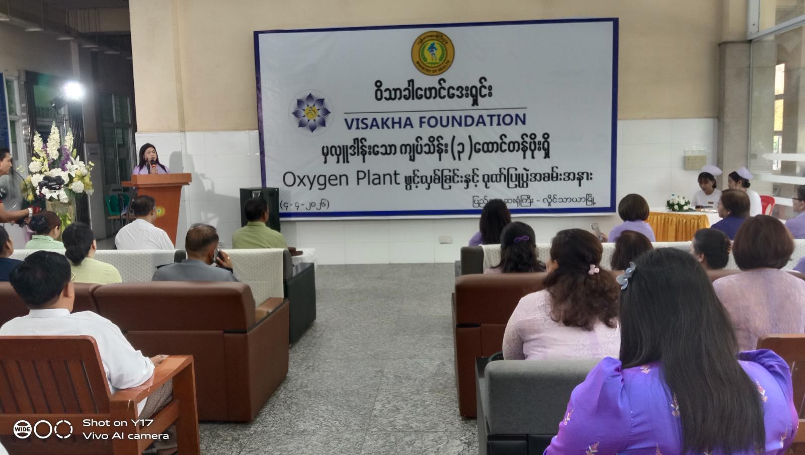 ရှေးဦးစွာ အခမ်းအနားစတင်ဖွင့်လှစ်ပြီး ဝိသာခါဖောင်ဒေးရှင်းနာယက ဒေါက်တာ ဝင်းမင်းသစ်က အဖွင့်အမှာစကားပြောကြားပြီး ဒေါက်တာစုလှဟန်က Liquid Oxygen teit လှူဒါန်းရခြင်းအကြောင်း ရှင်းလင်းပြောကြားသည်။ အထူးကုဆရာဝန်ကြီး(ဆေးပညာ) ဒေါက်တာရဲကျော်စီက ကျေးဇူးတင်စကားပြောကြားပြီး ဆေးရုံအုပ်ကြီး ဒေါက်တာ ခင်ရူပါစိုးက လှူဒါန်းသော ကျပ်သိန်း(သုံးထောင်)တန်ဖိုးရှိ Oxygen plant ဂုဏ်ပြုမှတ်တမ်းလွှာအား ဝိသာခါဖောင်ဒေးရှင်း အလှူရှင်များအား ပေးအပ်လျက်ရှိသည်။