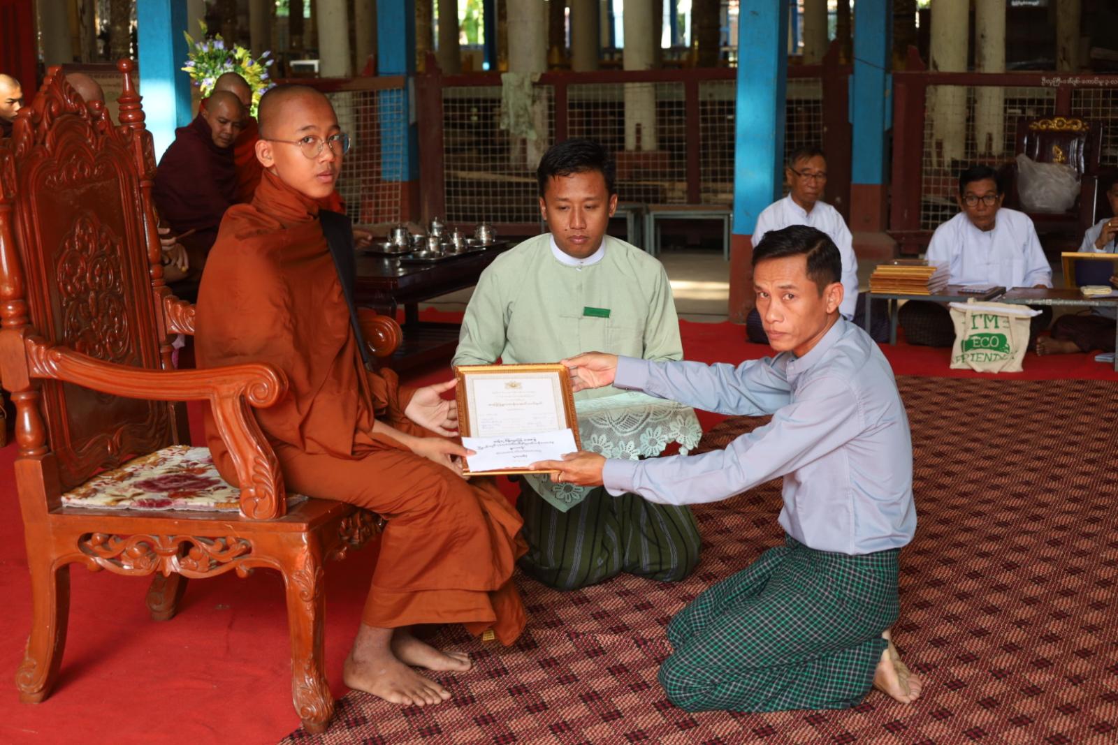 အခမ်းအနားကို နမောတဿသုံးကြိမ်ရွတ်ဆိုဘုရားကန်တော့၍ဖွင့်လှစ်ပြီး စိတ္တသုခကျောင်းတိုက်ဆရာတော်ထံမှ ငါးပါးသီလခံယူဆောက်တည်ခဲ့ကြသည်။ ရှေးဦးစွာ မြို့နယ်စီမံခန့်ခွဲရေးနှင့်အုပ်ချုပ်ရေးကော်မတီအဖွဲ့ဝင်များ၊ မြို့နယ်အထွေထွေအုပ်ချုပ်ရေးဦးစီးဌာန ဒုတိယမြို့နယ်အုပ်ချုပ်ရေးမှူး ဦးခင်မောင်နိုင်၊ ဌာနဆိုင်ရာအကြီးအကဲများနှင့်အလှူရှင်များက မြို့နယ်သံဃနာယကဆရာတော်များနှင့်စာမေးပွဲ ကြီးကြပ်ရေးဆရာတော်များအား လှူဖွယ်ဝတ္ထုများ ဆက်ကပ်လှူဒါန်းခဲ့ကြသည်။
