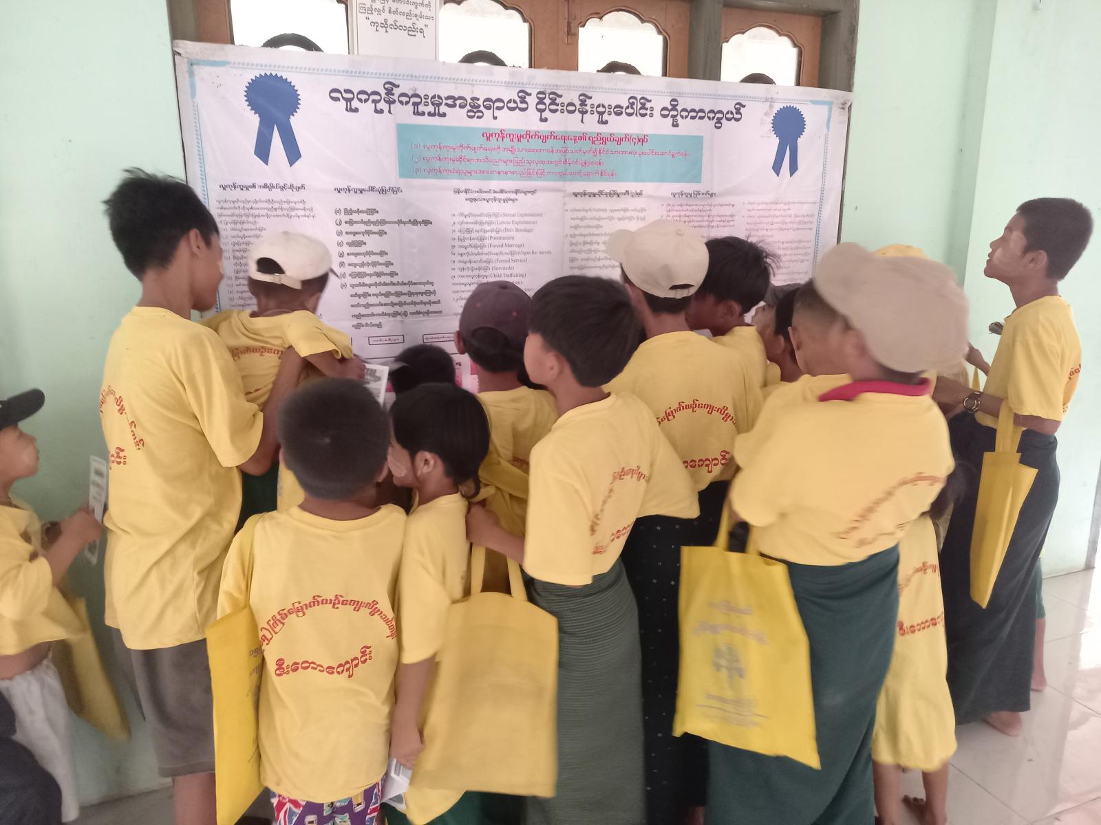 ထို့နောက် မြို့နယ်ပြန်ကြားရေးနှင့်ပြည်သူ့ဆက်ဆံရေးဦးစီးဌာနရုံးမှ လူကုန်ကူးမှုအန္တရာယ် တားဆီးကာကွယ်ရေး၊ မူးယစ်ဆေးဝါးအန္တရာယ်နှင့် ကလေးအလုပ်သမားပပျောက်ရေးဆိုင်ရာ အသိပညာပေး နံရံကပ်စာစောင်များကို ပြသဆောင်ရွက်ခဲ့ရာ ယဉ်ကျေးလိမ္မာသင်တန်း တက်ရောက်နေသော ကျောင်းသား၊ ကျောင်းသူ ၇၅ ဦးက စိတ်ပါဝင်စားစွာ လေ့လာကြည့်ရှုခဲ့ကြကြောင်း သိရသည်။