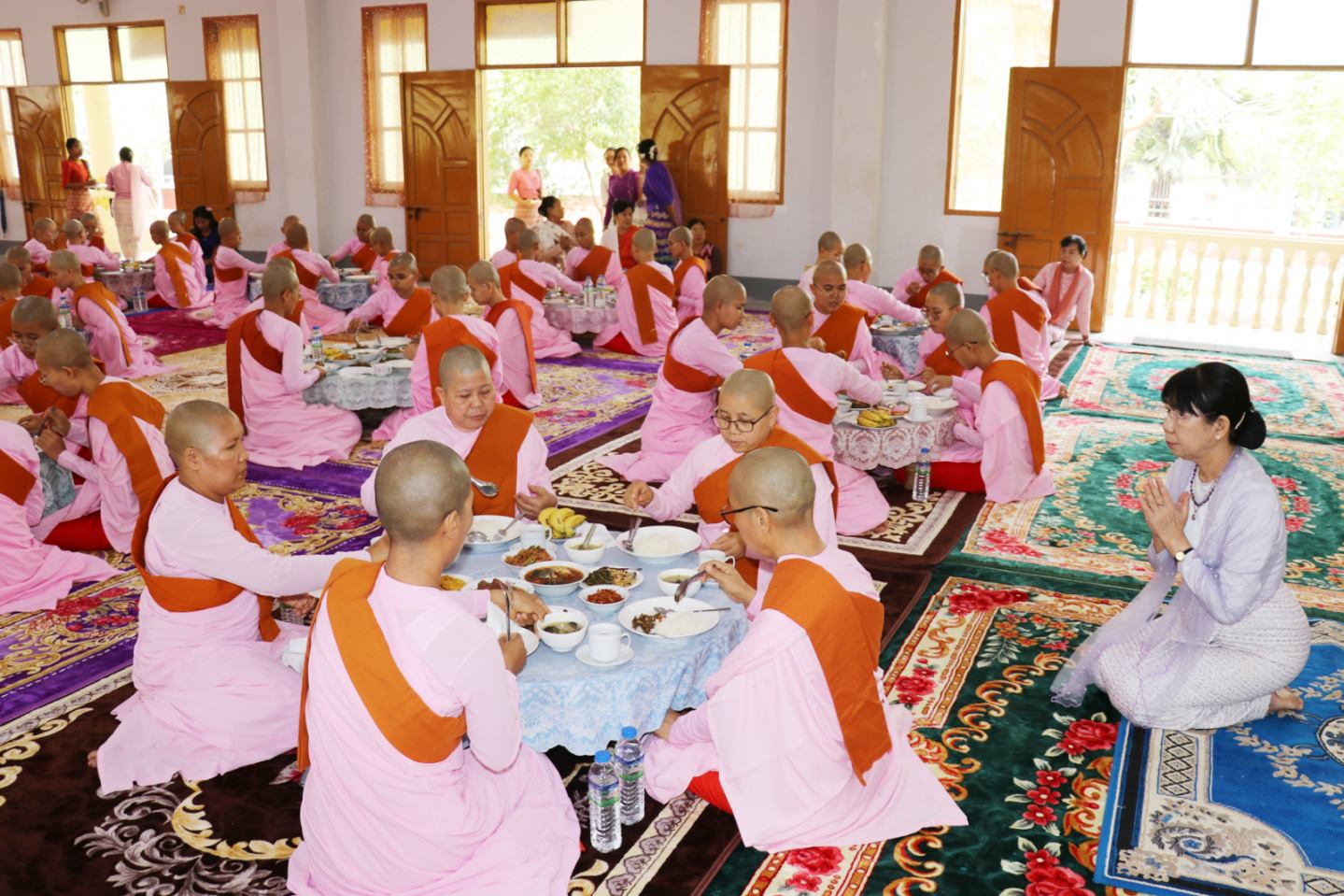 ရှေးဦးစွာ ပထမပိုင်းအခမ်းအနားတွင် ပုသိမ်ကြီးမြို့နယ်၊ ချမ်းမြရံသီ ပရိယတ္တိသီလရှင်စာသင်တိုက် ပဓာနနာယကဆရာကြီး ဒေါ်ခေမာစာရီ (ပထမကျော်၊ အဂ္ဂမဟာအကျာ်၊ မဟာဂန္ထဝါစကပဏ္ဍိတ) အမှူးရှိသော သီလရှင်အပါး (၁၀၀) တို့အား ပါမောက္ခချုပ်၊ ဒုတိယပါမောက္ခချုပ်များ၊ ဘာသာရပ်ဌာနများမှ ပါမောက္ခ (ဌာနမှူး) များ၊ ပါမောက္ခများ၊ ဆရာ၊ ဆရာမများ၊ စီမံရေးရာဌာနများမှ အရာထမ်း၊ အမှုထမ်းများနှင့် အလှူရှင်များက နေ့ဆွမ်းဆက်ကပ်လှူဒါန်းကြသည်။