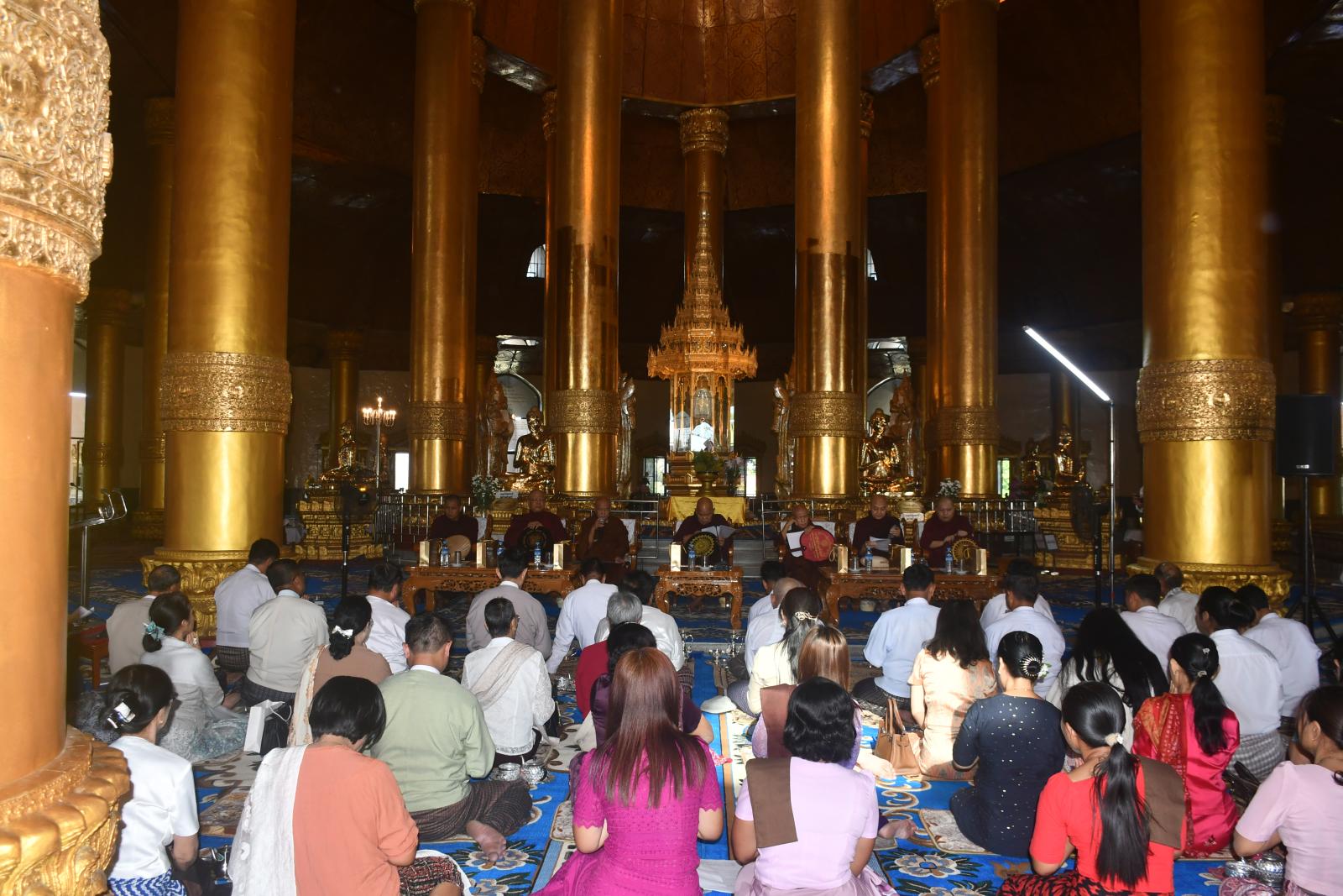 ဦးစွာ ဩဝါဒါစရိယဆရာတော် သံဃာတော်များက ဗုဒ္ဓါဘိသေက အနေကဇာတင်တော်မူကြသည်။ ထို့နောက် အခမ်းအနားအား “နုမောတဿ” သုံးကြိမ်ရွတ်ဆိုဘုရားကန်တော့၍ ဖွင့်လှစ်ပြီး ဝရဒါဌာဓာတုစေတိယ စွယ်တော်မြတ်စေတီတော်(ရန်ကုန်) ဘဏ္ဍာတော်ထိန်းဂေါပကအဖွဲ့၏ ဩဝါဒါစရိယဆရာတော် ရန်ကုန်တိုင်းဒေသကြီး သံဃနာယကအဖွဲ့ဥက္ကဋ္ဌ၊ အဂ္ဂမဟာပဏ္ဍိတ၊ အဂ္ဂမဟာသဒ္ဓမ္မ ဇောတိကဓဇ၊ ဒွိပိဋကဓရ၊ တိပိဋကာလင်္ကာရစာသင်တိုက် ဦးစီးပဓာနနာယက ဆရာတော် ဘဒ္ဒန္တ အဂ္ဂသာမိထံမှ ရှစ်ပါးသီလခံယူဆောက်တည်ကြသည်။