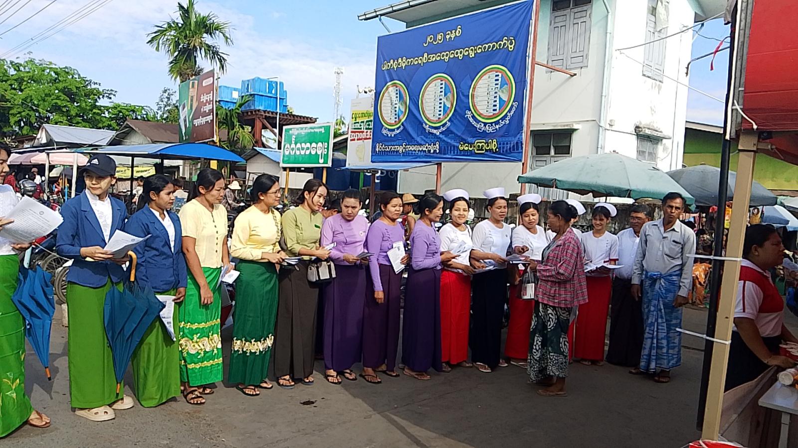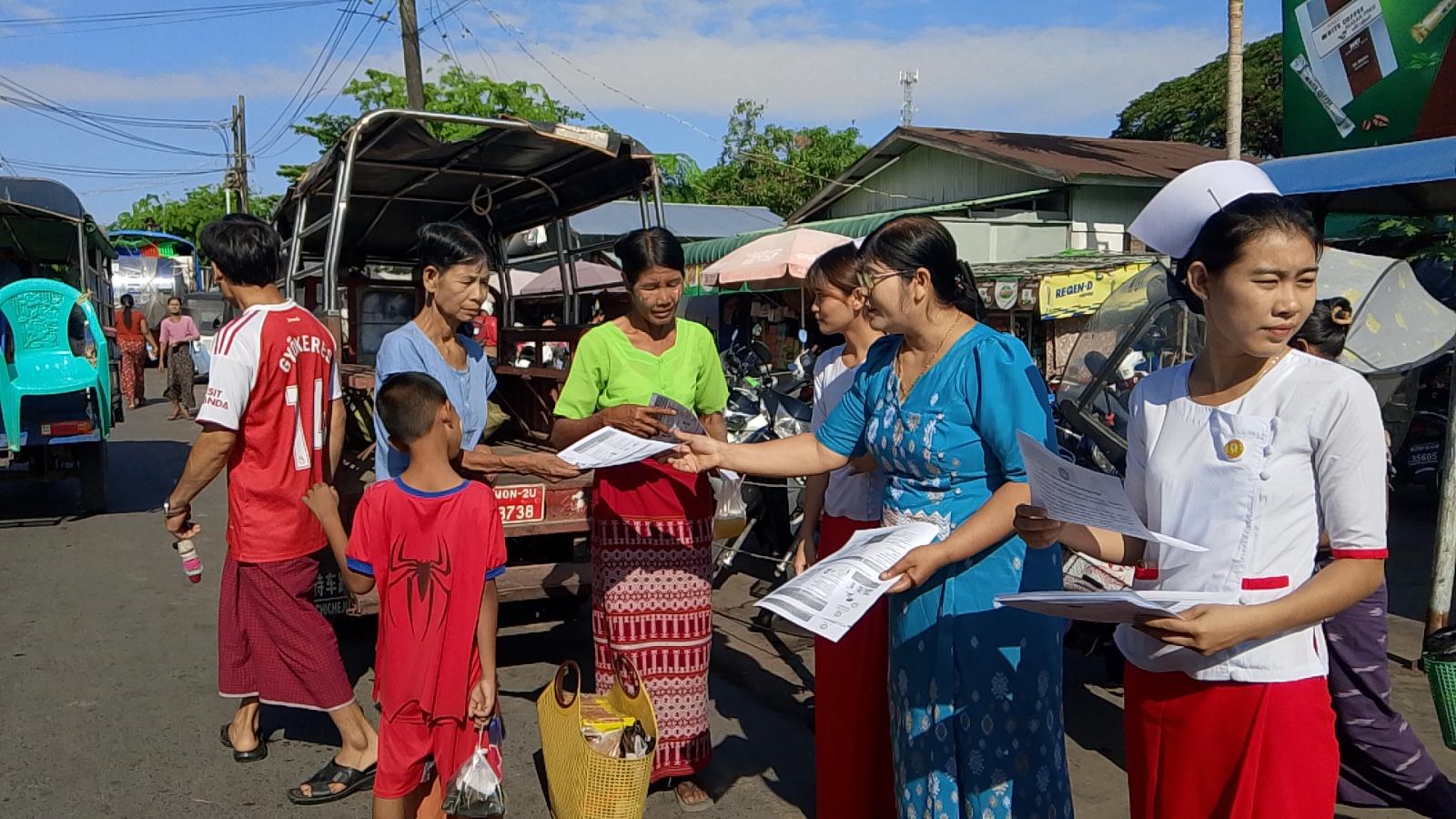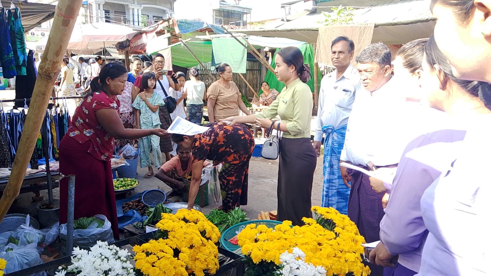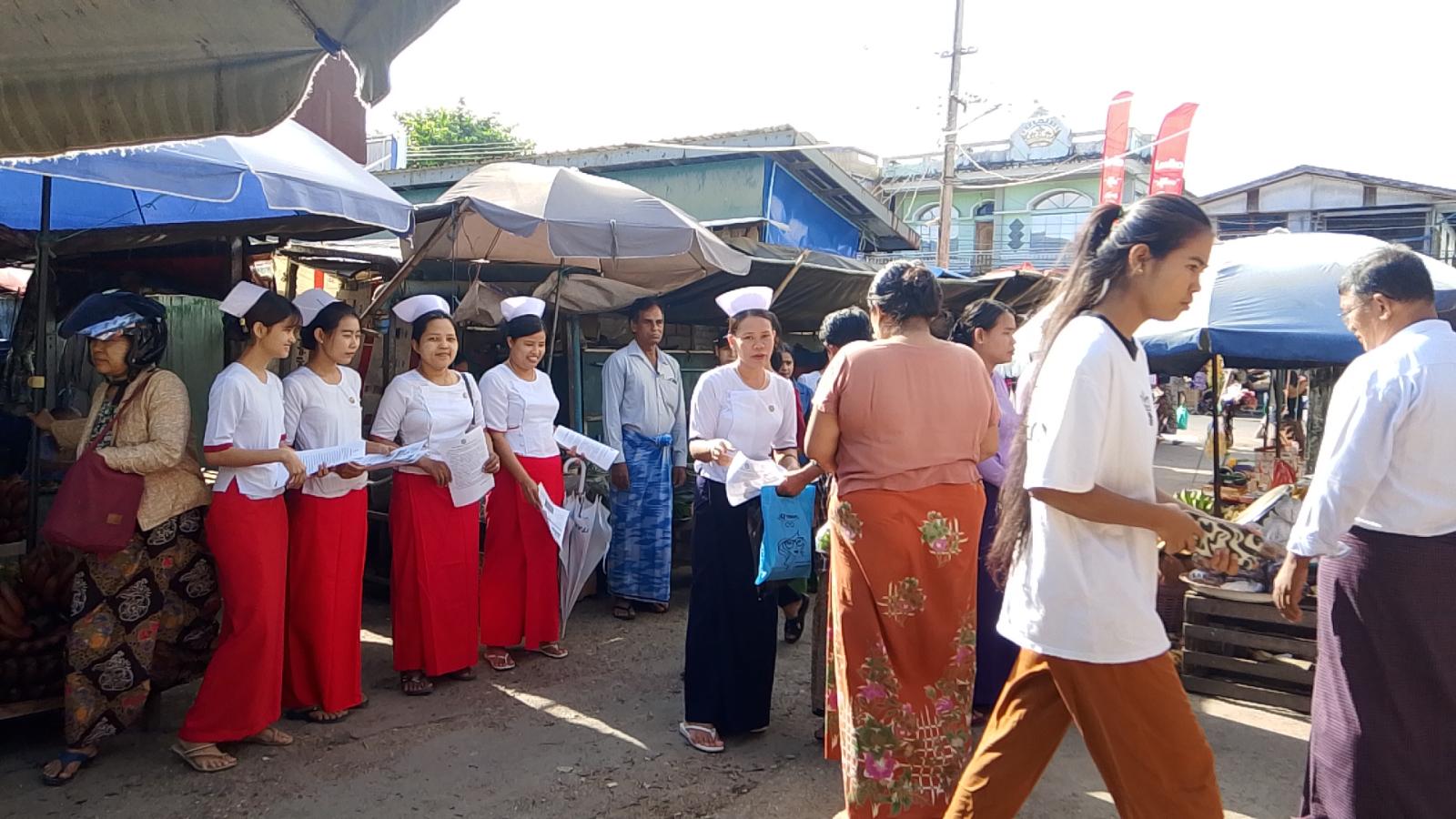 ထိုသို့ဆောင်ရွက်ရာတွင် မြို့နယ်အထွေထွေအုပ်ချုပ်ရေးဦးစီးဌာန ဒုတိယမြို့နယ်ဦးစီးမှူးနှင့် ဝန်ထမ်းများ၊ မြို့နယ်ပြည်သူ့ကျန်းမာရေးဦးစီးဌာနဝန်ထမ်းများ၊ မြို့နယ်တိုင်းရင်းဆေးပညာဦးစီးဌာနမှ တာဝန်ရှိသူများ၊ မြို့နယ်စည်ပင်သာယာရေးအဖွဲ့မှ ဝန်ထမ်းများ၊ မိခင်နှင့်ကလေးစောင့်ရှောက်ရေးအသင်းနှင့် ရပ်ကွက်/ကျေးရွာအုပ်ချုပ်ရေးမှူးများက စျေးအတွင်း လမ်းသွားလမ်းလာဒေသခံပြည်သူများအား အပူဒဏ်အန္တရာယ်ကြိုတင်ကာကွယ်နိုင်ရန် လိုက်နာရမည့်အချက်များကို အသိပညာပေး တိုက်တွန်းနှိုးဆော်ခဲ့သည်။