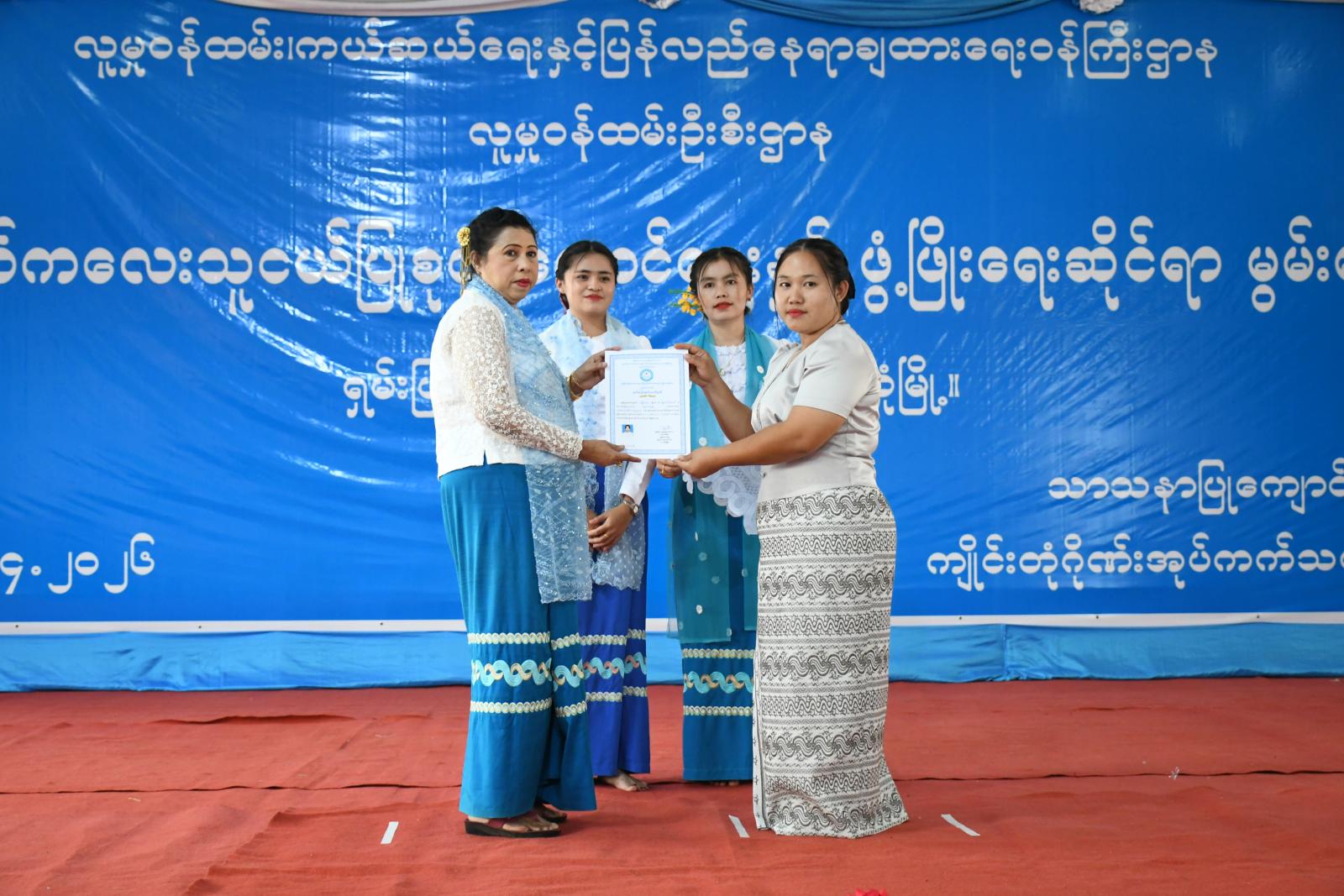 သင်တန်းဆင်းပွဲတွင် ကျိုင်းတုံခရိုင် လူမှုန်ထမ်းဦးစီးဌာနမှ ဒုတိယညွှန်ကြားရေးမှူး ဒေါ်ခင်ခင်မြင့် က ရှမ်းပြည်နယ်(အရှေ့ပိုင်း)အတွင်း အမျိုးသား၊ အမျိုးသမီးများအတွက် အလုပ်အကိုင်အခွင့်အလမ်းများ ရရှိစေရန်၊ မူကြိုပညာရပ်ဖြင့် အိုးမကွာ၊ အိမ်မကွာ မိမိအိမ်၌ပင် မူကြိုကျောင်း ဖွင့်လှစ်နိုင်ရန်၊ ရင်သွေးငယ်များကို ရှေးဦးအရွယ်ကလေးသူငယ် ပြုစုပျိုးထောင်ရေးဆိုင်ရာ နည်းလမ်းများဖြင့် နည်းစနစ်မှန်ကန်စွာ ပြုစုပေးနိုင်ရန် သင်တန်းဖွင့်လှစ်ရခြင်းဖြစ်ကြောင်း ပြောကြားပြီး တာဝန်ရှိသူများက သင်တန်းဆင်းလက်မှတ်များ ပေးအပ်သည်။