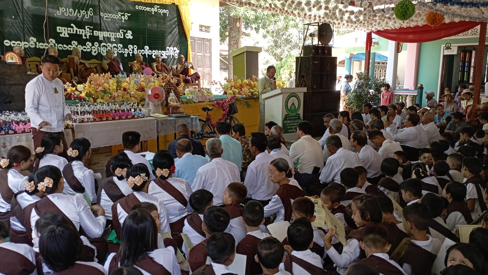 ရှေးဦးစွာ နမောတဿ(၃)ကြိမ်ရွတ်ဆို ဘုရားကန်တော့၍ အခမ်းအနားကိုဖွင့်လှစ်ခဲ့ပြီး၊ ဧည့်ပရိသတ်အပေါင်းနှင့် ဒါယိကာ၊ ဒါယိကာမအပေါင်းသူတော်ကောင်းတ်ို့က သဲကုန်းမြို့နယ် သံဃာ့နာယကဥက္ကဋ္ဌ ဆရာတော်ဘဒ္ဒန္ဒသြသဓထံမှ ငါးပါးသီလခံယူဆောက်တည်ခဲ့ကြပြီး၊ ဆရာတော်က သရဏိရသြဝါဒကထာ မြွတ်ကြားချီးမြှင့်ခဲ့၍၊ ဒုတိယမြို့နယ်အုပ်ချုပ်ရေးမှူး ဦးစောပြည့်စုံက သာသနာရေးဆိုင်ရာများ လျှောက်ထားတင်ပြခဲ့သည်။ ထို့နောက် သင်တန်းပြီးဆုံးအောင် တက်ရောက်ကြသည့် ဓမ္မစကူးလ်သင်တန်းသား/ သင်တန်းသူများအား ဒုတိယမြို့နယ် အုပ်ချုပ်ရေးမှူး ဦးစောပြည့်စုံနှင့် တာဝန်ရှိသူများက သင်တန်းဆင်းအောင်လက်မှတ်များနှင့် အမှတ်တရဆုလက်ဆောင်များ အသီးသီးပေးအပ်ချီးမြှင့်ခဲ့ပြီး ဓမ္မစကူးလ်ဖောင်ဒေးရှင်း တာဝန်ခံဆရာတော် အရှင်က္ကန္ဒက က ဝမ်းမြောက်ကြောင်း စကားမြွတ်ကြားချီးမြှင့်ခဲ့၍၊ ရွှေသဲကုန်းဓမ္မစကူးလ်ဖောင်ဒေးရှင်းဥက္ကဋ္ဌ ဦးအောင်သိန်းက ကျေးဇူးတင်စကားလျှောက်ထားပန်ကြားကာ ဗုဒ္ဓသာသနံစိရံတိဌတု သုံးကြိမ်ရွတ်ဆို၍ အခမ်းအနားကို ရုတ်သိမ်းခဲ့သည်။