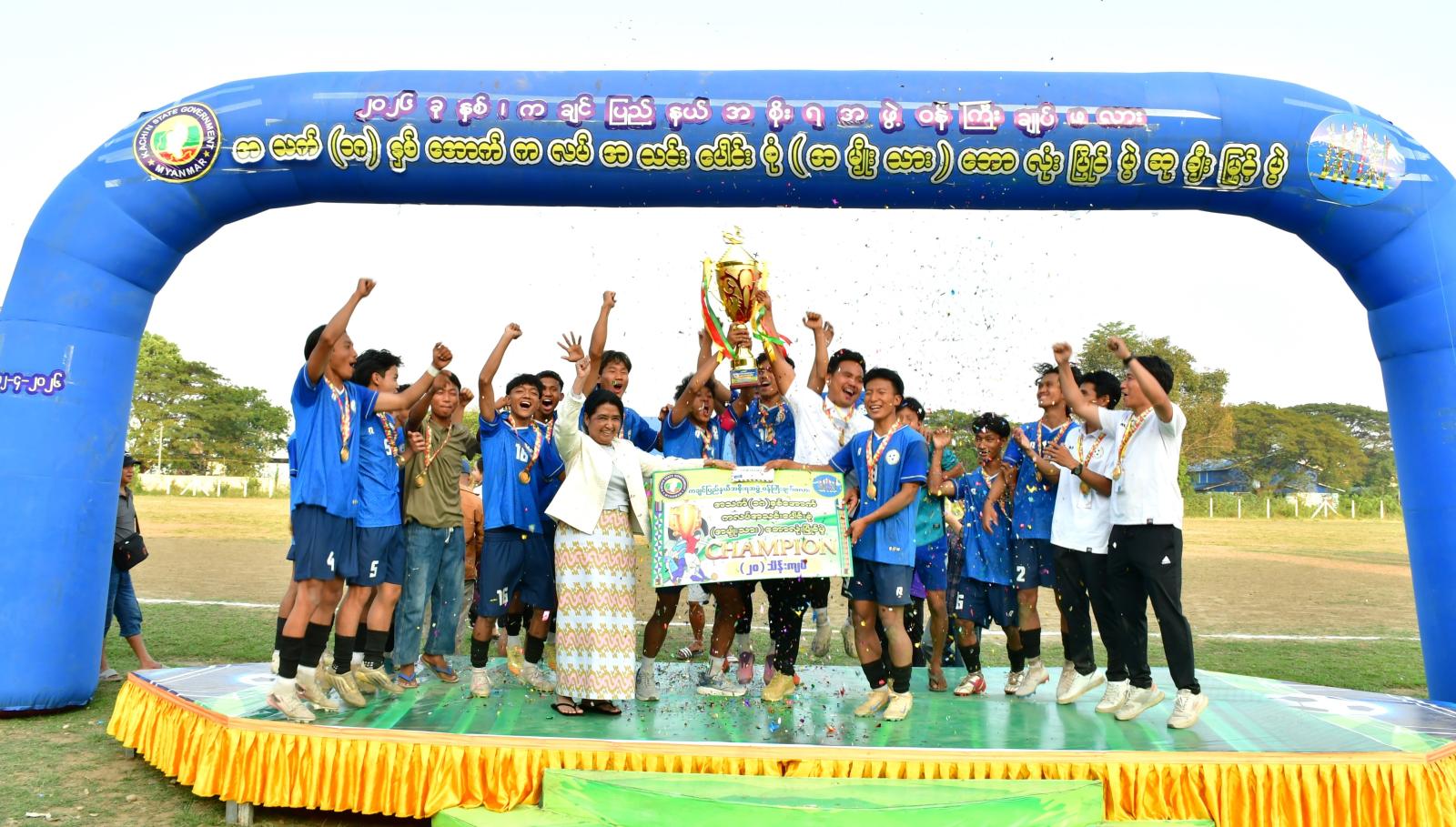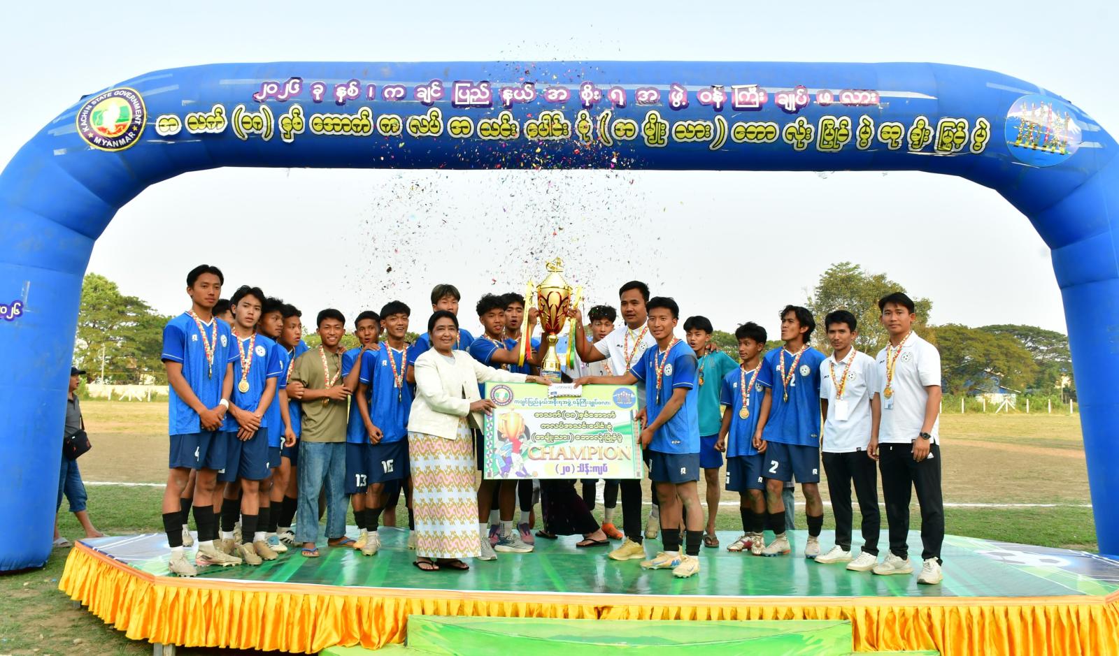 ထို့နောက် ဆုချီးမြှင့်ပွဲ အခမ်းအနားကို ဆက်လက်ကျင်းပပြုလုပ်ရာ တိုင်းရင်းသားလူမျိုးရေး ရာဝန်ကြီးများက ဘောလုံးပြိုင်ပွဲဖြစ်မြောက်ရေးအတွက် ပါဝင်ကူညီဆောင်ရွက်ပေးခဲ့ကြသော ဒိုင် အဖွဲ့၊ ကြက်ခြေနီတပ်ဖွဲ့၊ ဘောလုံးဆပ်ကော်မတီအဖွဲ့ဝင်များနှင့် တာဝန်ရှိသူများအား ဂုဏ်ပြုဆုများ ကို ပေးအပ်ချီးမြှင့်ခဲ့ကြပြီး ပြည်နယ်စည်ပင်သာယာရေးဝန်ကြီးက နေရာအလိုက် အကောင်းဆုံး ကစားသမားဆုများနှင့် ပွဲစဉ်တစ်လျှောက် အကောင်းဆုံးကစားသမားဆုများကို လည်းကောင်း၊ ပြည်နယ်စိုက်ပျိုးရေး၊ မွေးမြူရေးနှင့်ဆည်မြောင်းဝန်ကြီး ဦးရဲရင့်ဆွေ၊ လျှပ်စစ်၊ စွမ်းအင်၊ စက်မှုနှင့် လမ်းပန်းဆက်သွယ်ရေးဝန်ကြီး ဦးအောင်နိုင်တို့က ပူးတွဲတတိယဆုရအသင်း (၂)သင်းများအား လည်းကောင်း၊ပြည်နယ်လူမှုရေးရာဝန်ကြီးဦးကျော်မင်းခိုင်က ဒုတိယဆုရအသင်းအားလည်းကောင်း၊ စီမံကိန်း၊ စီးပွားရေးနှင့် ဘဏ္ဍာရေးဝန်ကြီး ဦးချန်တန်ခင်က ပထမဆုရအသင်းအား တစ်ဦးချင်းလည်ဆွဲဆုတံဆိပ်များကိုလည်းကောင်း၊ ပြည်နယ်တရားလွှတ်တော်တရားသူကြီးချုပ်က ပထမ တံခွန်စိုက်ဆုဖလားနှင့် ချီးမြှင့်ငွေများကို လည်းကောင်း ပေးအပ်ချီးမြှင့်ခဲ့ကြကြောင်း သိရသည်။