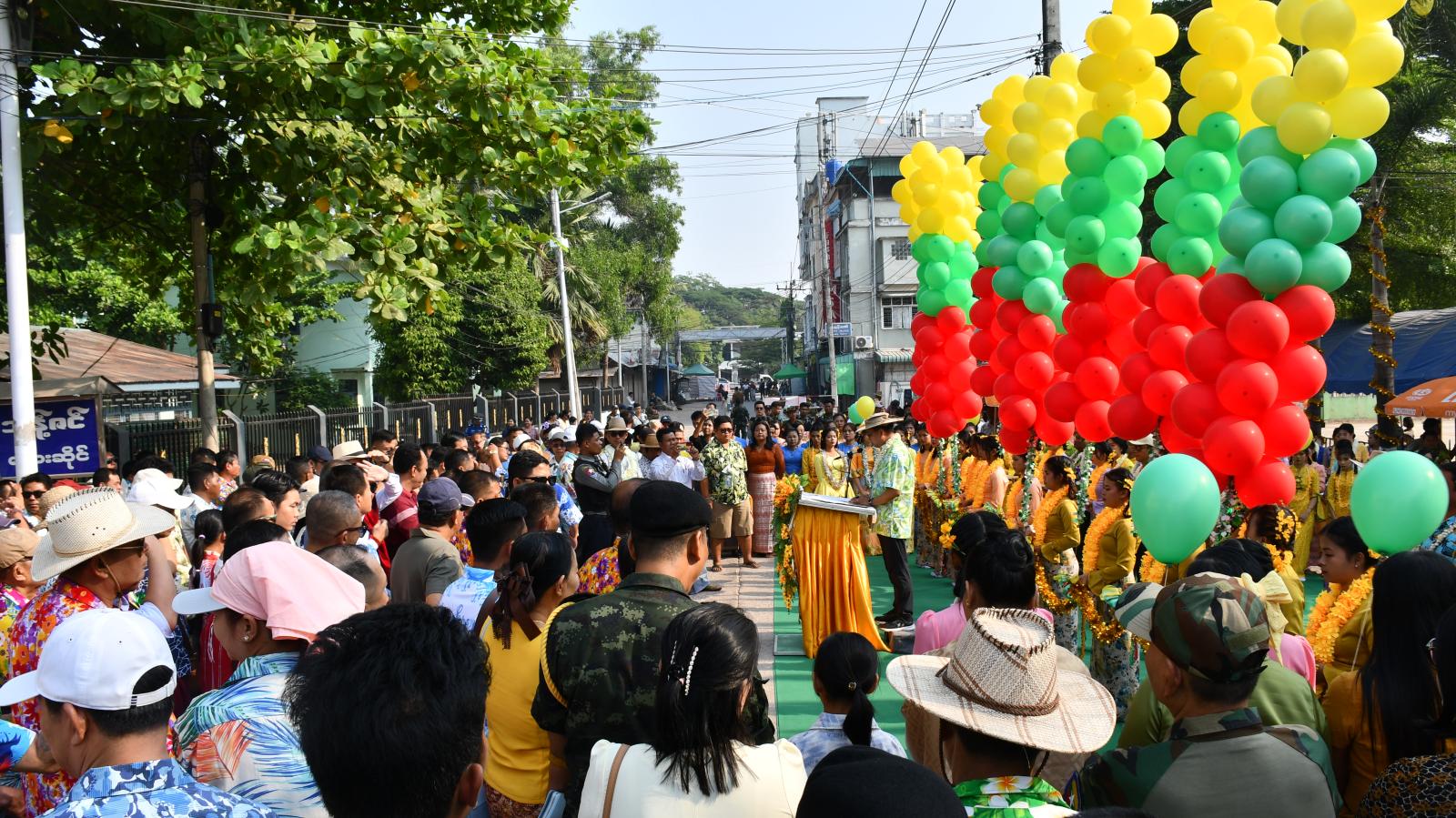ထို့နောက် လမ်းလျှောက်သင်္ကြန်ပွဲတော်အား ကရင်ပြည်နယ်လွှတ်တော် ဒုတိယဥက္ကဋ္ဌ ဦးအေးမင်းထွေး၊ ခရိုင်စီမံအုပ်ချုပ်ရေးအဖွဲ့ဥက္ကဋ္ဌ ဦးကောင်းစံလင်း၊ ပြည်သူ့လွှတ်တော် ကိုယ်စားလှယ် ဦးခင်မောင်ချင်း၊ ရှေ့တန်းအမှတ် (၂၇၅) တပ်ရင်းမှူး ဒုဗိုလ်မှူးကြီး ဇော်ဟံဦး၊ မြဝတီခရိုင်ရဲတပ်ဖွဲ့မှူး ဒုရဲမှူးကြီး မိုးကျော်ဟိန်းနှင့်တာဝန်ရှိသူများက ဖဲကြိုးဖြတ်၍ ဖွင့်လှစ်ပေးခဲ့ကြသည်။ အခမ်းအနားတွင် သင်္ကြန်ယိမ်းအကအဖွဲ့များမှ "မြူမှောင်ဝေကင်း" သင်္ကြန်တေးသီချင်းဖြင့် ကပြဖျော်ဖြေခဲ့ကြပြီး တက်ရောက်လာကြသည့် ဧည့်သည်တော်များက အမွှေးနံ့သာရည်များဖြင့် အပြန်အလှန်ပက်ဖြန်းကာ နှစ်သစ်ကို ကြိုဆိုခဲ့ကြသည်။