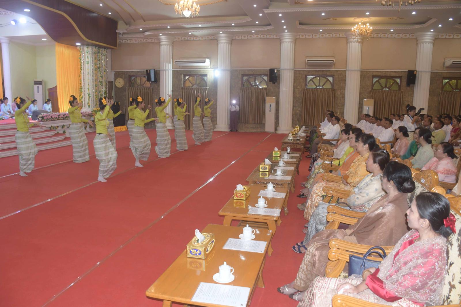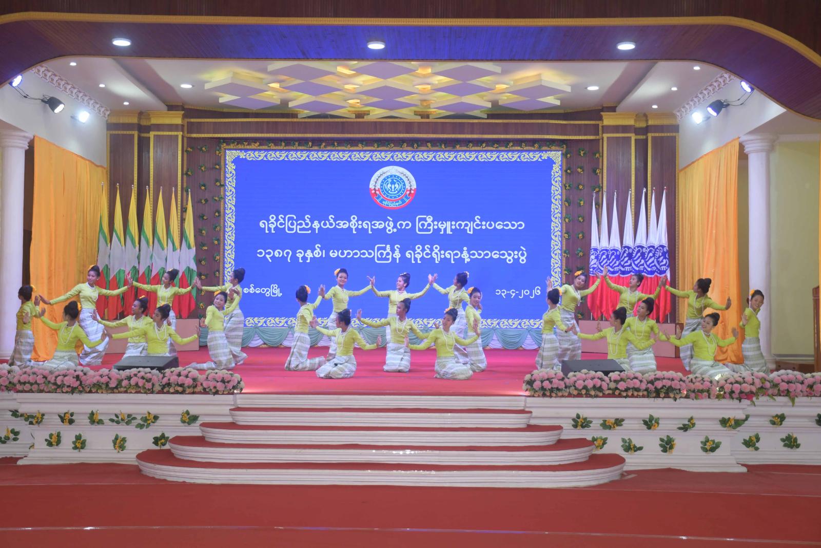 ဆက်လက်၍ ရခိုင်ပြည်နယ်ယဉ်ကျေးမှုအကအဖွဲ့က ရခိုင်ရိုးရာသင်္ကြန်သီချင်းဖြင့်လည်းကောင်း၊ ပြည်နယ်အထွေထွေအုပ်ချုပ်ရေးဦးစီးဌာနအကအဖွဲ့က အခါကြီးနိန့်ရက်မြတ်ဒါန သီချင်းဖြင့်လည်းကောင်း ကပြဖျော်ဖြေကြပြီး ပြည်နယ်ဝန်ကြီးချုပ်နှင့်ဇနီး တာဝန်ရှိသူများက နံ့သာသွေးပွဲအဖွဲ့များနှင့် ဖျော်ဖြေရေးအဖွဲ့များအား ဂုဏ်ပြုဆုငွေများ ပေးအပ်ချီးမြှင့်ကာ စုပေါင်းမှတ်တမ်းတင် ဓာတ်ပုံရိုက်ကူးကြသည်။