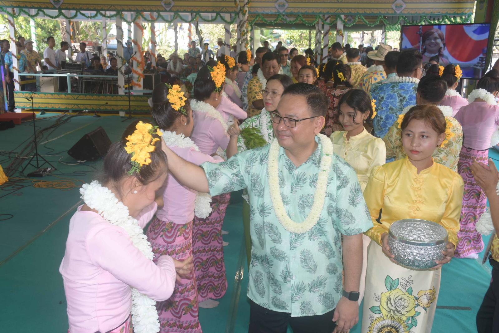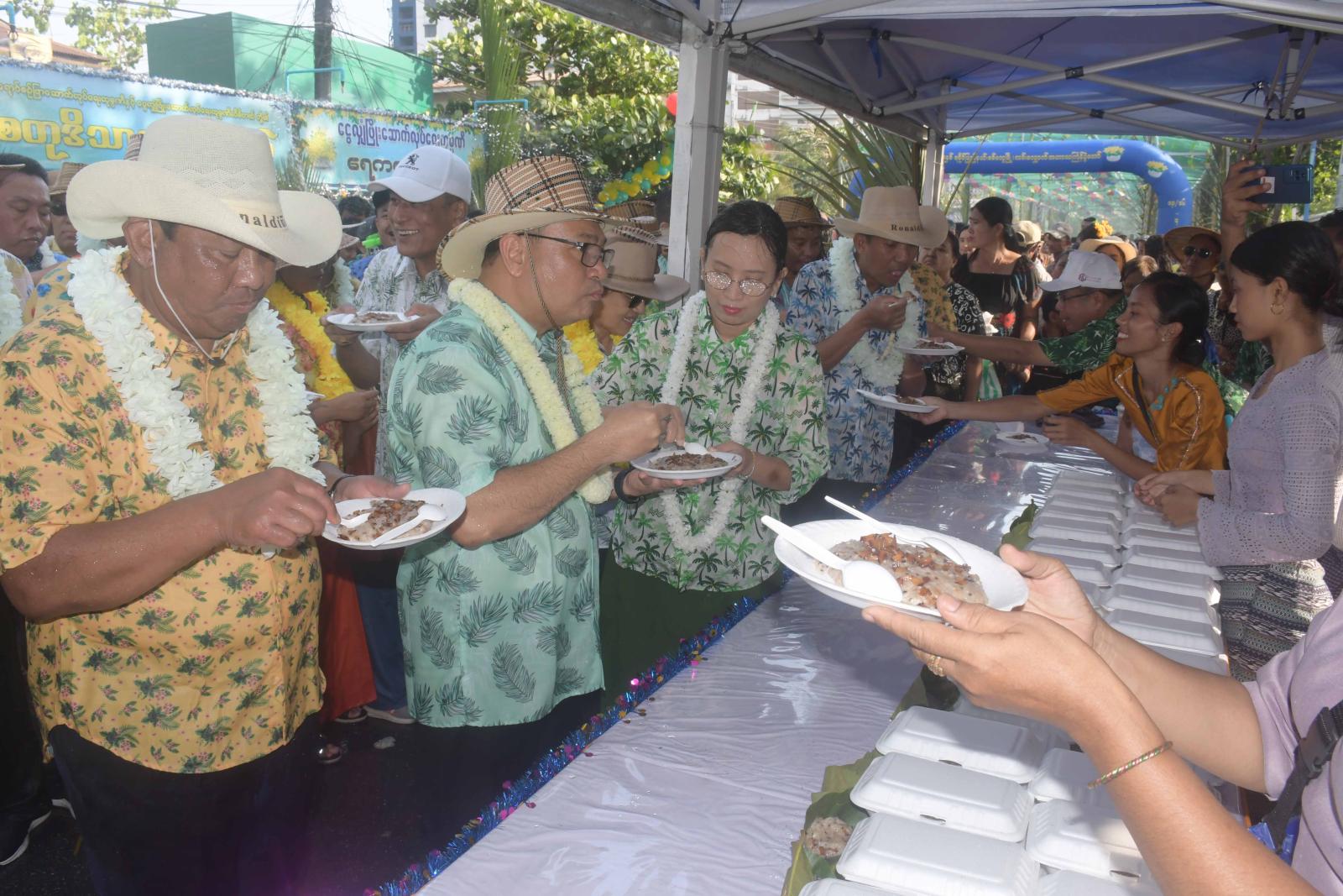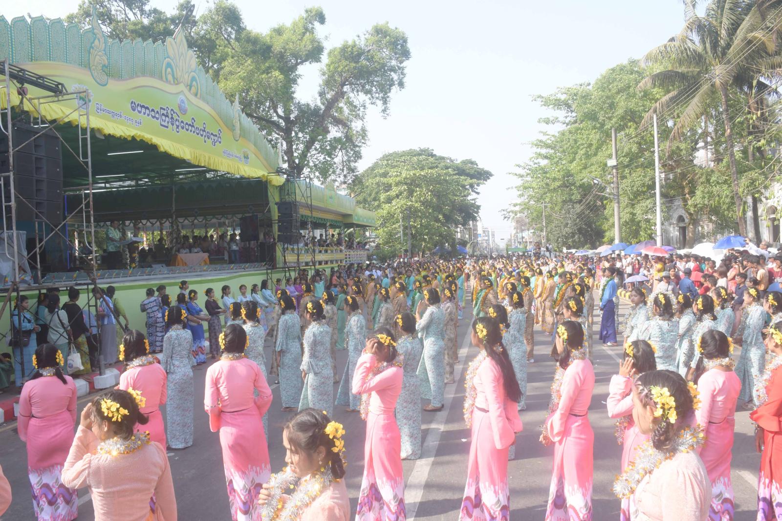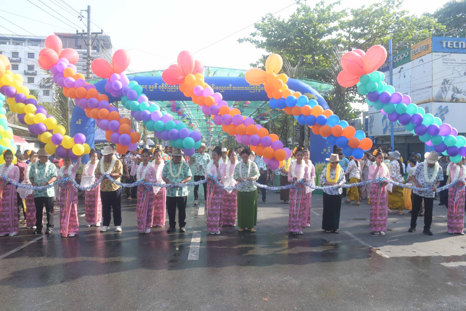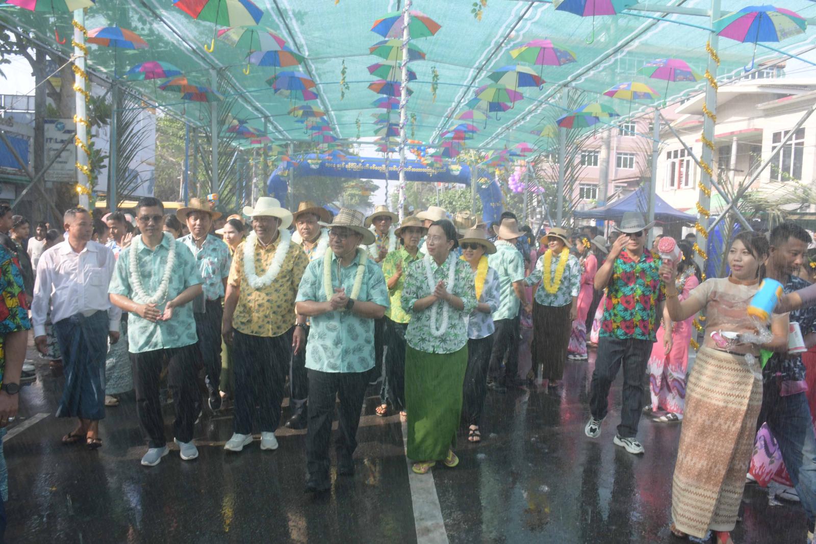ဦးစွာ မြန်မာ့ရိုးရာမဟာသင်္ကြန်ပွဲတော် လမ်းလျှောက်သင်္ကြန်မုခ်ဦးအား ရခိုင်ပြည်နယ်ဝန်ကြီးချုပ် ဦးနိုင်ဦးနှင့်ဇနီး ပြည်နယ်အမျိုးသမီးရေးရာအဖွဲ့နာယက ဒေါ်ထက်စန္ဒာကျော်၊ ရခိုင်ပြည်နယ် လွှတ်တော်ဥက္ကဋ္ဌ ဒေါက်တာစန်းရွှေနှင့် တာဝန်ရှိသူများက ဖဲကြိုးဖြတ်ဖွင့်လှစ်ပေးကြသည်။