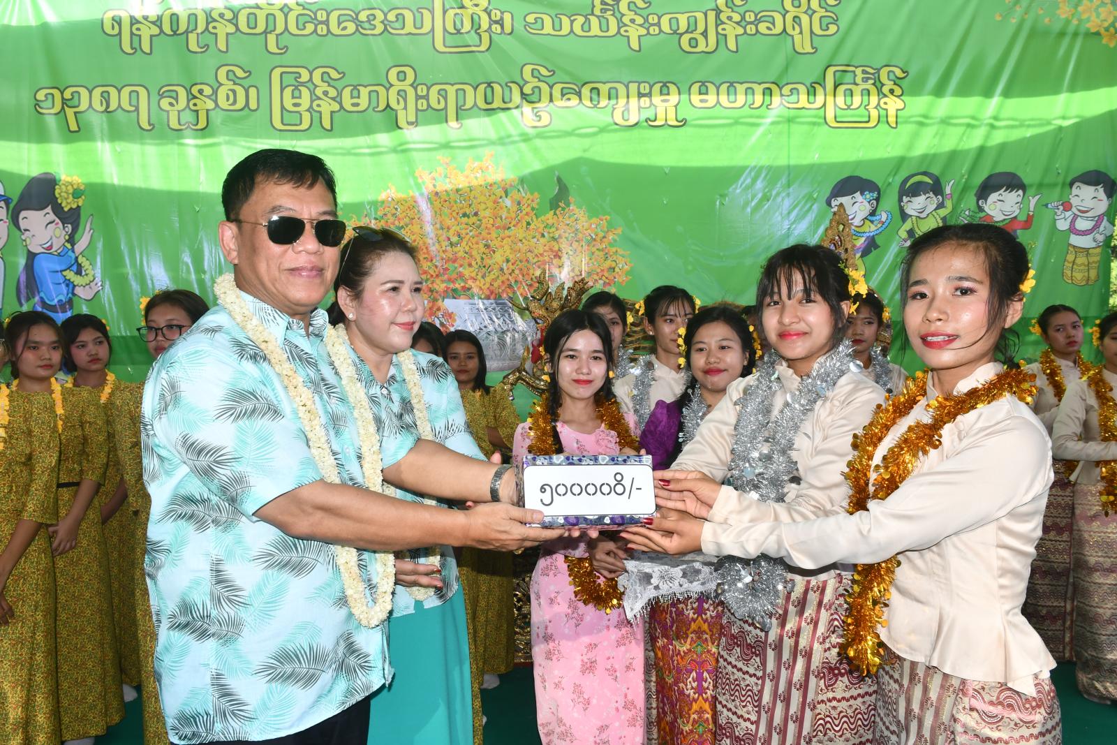 ထို့နောက် ရန်ကုန်တိုင်းဒေသကြီးဝန်ကြီးချုပ် ဦးအောင်နိုင်သူနှင့်အဖွဲ့သည် ရန်ကုန်တိုင်းဒေသကြီး၊ ဒဂုံမြို့သစ်ခရိုင်မဏ္ဍပ်၌ ပညာရေးယိမ်းအဖွဲ့များနှင့် တေးသံရှင်များက အကအလှတေးသီချင်းများဖြင့် ဖျော်ဖြေတင်ဆက်နေမှုများကို ကြည့်ရှုအားပေးပြီး ရန်ကုန်တိုင်းဒေသကြီးဝန်ကြီးချုပ် ဦးအောင်နိုင်သူနှင့်အဖွဲ့က ယိမ်းအဖွဲ့များအား ဂုဏ်ပြုချီးမြှင့်ငွေများကိုပေးအပ်ကာ သပြေခက်ဖြင့် ရေဖြန်းပက်ပေးပြီး ပြည်သူများနှင့်အတူ ပျော်ရွှင်စွာပါဝင်ဆင်နွှဲကြကြောင်း သိရသည်။