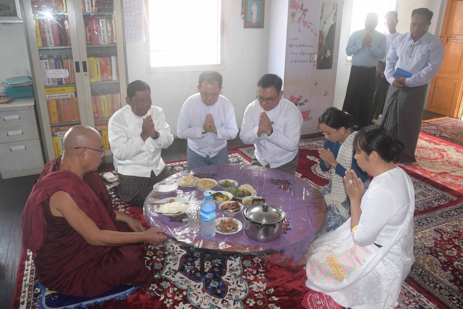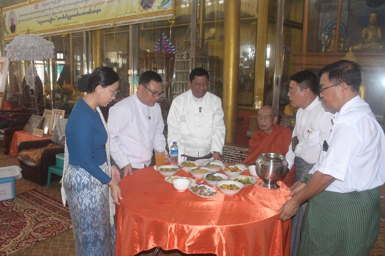 ဦးစွာ ရခိုင်ပြည်နယ်ဝန်ကြီးချုပ် ဦးနိုင်ဦးနှင့်ဇနီး၊ ရခိုင်ပြည်နယ်လွှတ်တော်ဥက္ကဋ္ဌ တို့သည် စစ်တွေမြို့၊ ဓညဝတီရပ်ကွက်၊ ဓမ္မာရာမကျောင်းတိုက်သို့ သွားရောက်ကြပြီး ဆရာတော်အားဖူးမြော်၍ ပြည်နယ်ဝန်ကြီးချုပ် ဦးနိုင်ဦးက သာသနာ့ရေးဆိုင်ရာများကို လျှောက်ထားသည်။ ဆက်လက်၍ ပြည်နယ်ဝန်ကြီးချုပ် ဦးနိုင်ဦးနှင့်ဇနီး၊ ပြည်နယ်လွှတ်တော်ဥက္ကဋ္ဌတို့က ဆရာတော်အား ဆွမ်းနှင့်လှူဖွယ်ဝတ္ထုပစ္စည်းများ ဆပ်ကပ်လှူဒါန်းကြသည်။