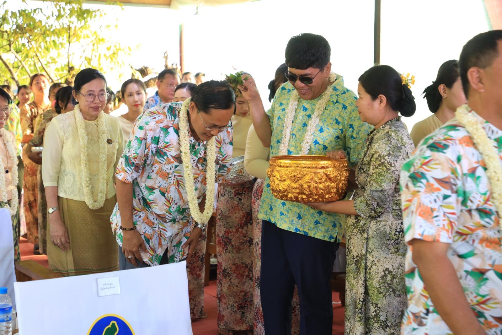 ဆက်လက်၍ ပြည်နယ်ဝန်ကြီးချုပ်နှင့်တာဝန်ရှိသူများက အခမ်းအနားသို့ တက်ရောက်လာသော ဧည့်သည်တော်များ၊ ယိမ်းအဖွဲ့များနှင့် ပြည်သူများအား အတာရေများ ပက်ဖျန်းပေးခဲ့သည်။