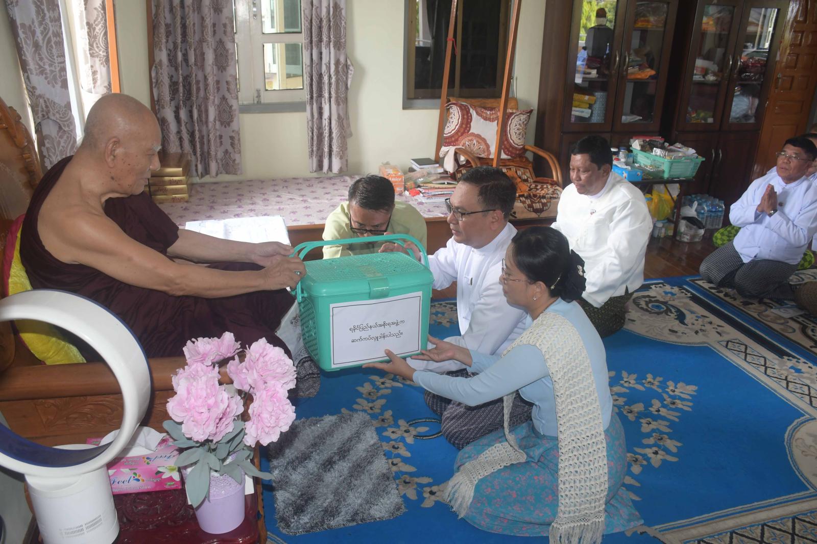 ထို့နောက် ပြည်နယ်ဝန်ကြီးချုပ်နှင့်ဇနီး၊ ပြည်နယ်လွှတ်တော်ဥက္ကဋ္ဌတို့သည် လမ်းမတော် ကျောင်းတိုက်သို့ သွားရောက်ပြီး ဆရာတော်ကြီးအား ဖူးမြော်ကာ ပြည်နယ် ဝန်ကြီးချုပ် ဦးနိုင်ဦးက သာသနာရေးဆိုင်ရာများကို လျှောက်ထားပြီး ပြည်နယ်ဝန်ကြီးချုပ် ဦးနိုင်ဦးနှင့်ဇနီး၊ ပြည်နယ်လွှတ်တော်ဥက္ကဋ္ဌတို့က ဆရာတော်ကြီးအား ဆွမ်းနှင့် လှူဖွယ်ဝတ္ထုပစ္စည်းများ ဆပ်ကပ်လှူဒါန်းကြသည်။