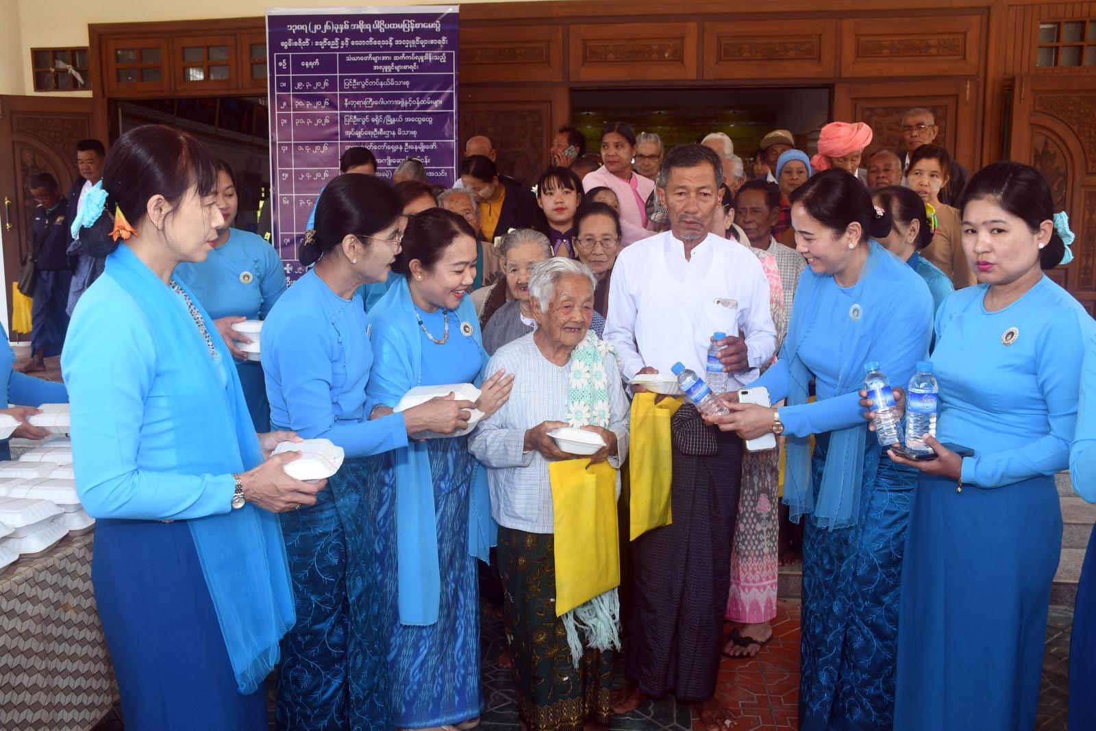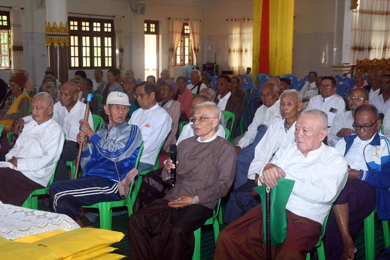 ရှေးဦးစွာ တက်ရောက်လာသူများမှ အသက် (၈၅) နှစ် အထက် သက်ကြီး ဘိုး/ဘွားများအား ကန်တော့ချိုးဖြင့် ကန်တော့ခြင်း၊ တက်ရောက်လာသည့် အဘိုး/အဘွားများ (ကိုယ်စား) အဘိုး (၁) ဦးနှင့် အဘွား (၁) ဦး တို့မှ ဆုတောင်းမေတ္တာပို့သခြင်း၊ တာဝန်ရှိသူများနှင့် တက်ရောက်လာသူများမှ အဘိုး/ အဘွားများအား ဂါရ၀ပြုအလှူငွေများနှင့် ပစ္စည်းများအား အသီးသီး ပေးအပ်လှုဒါန်းခဲ့ကြသည်။