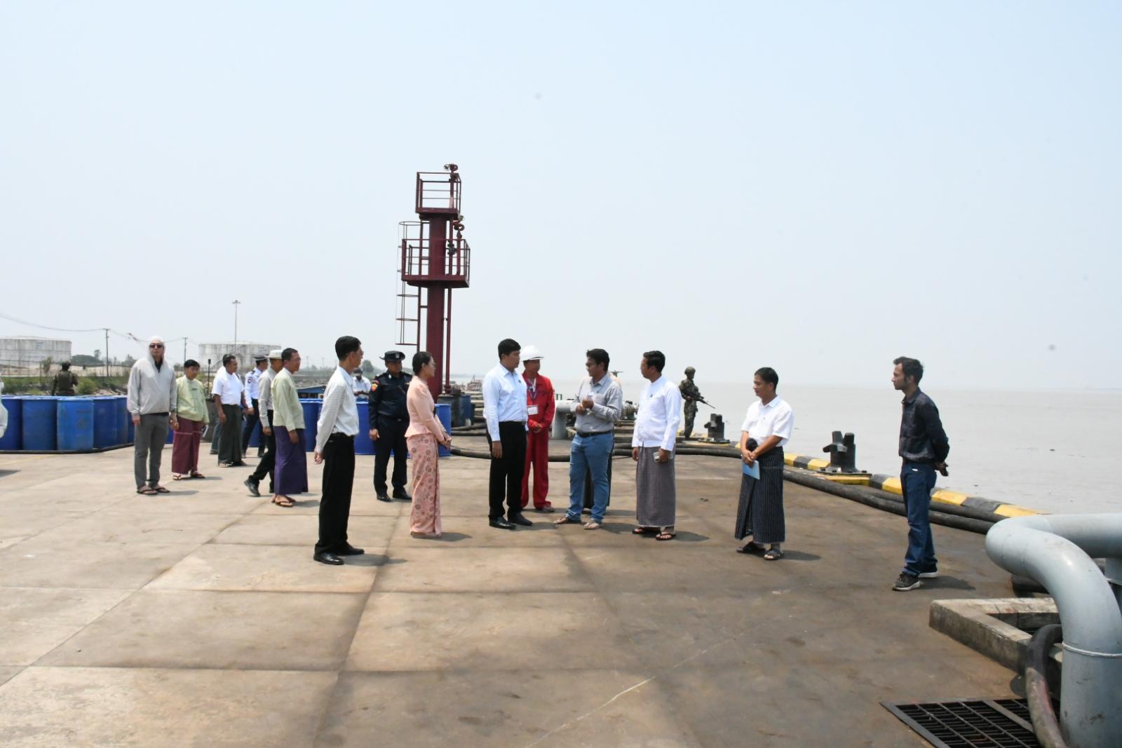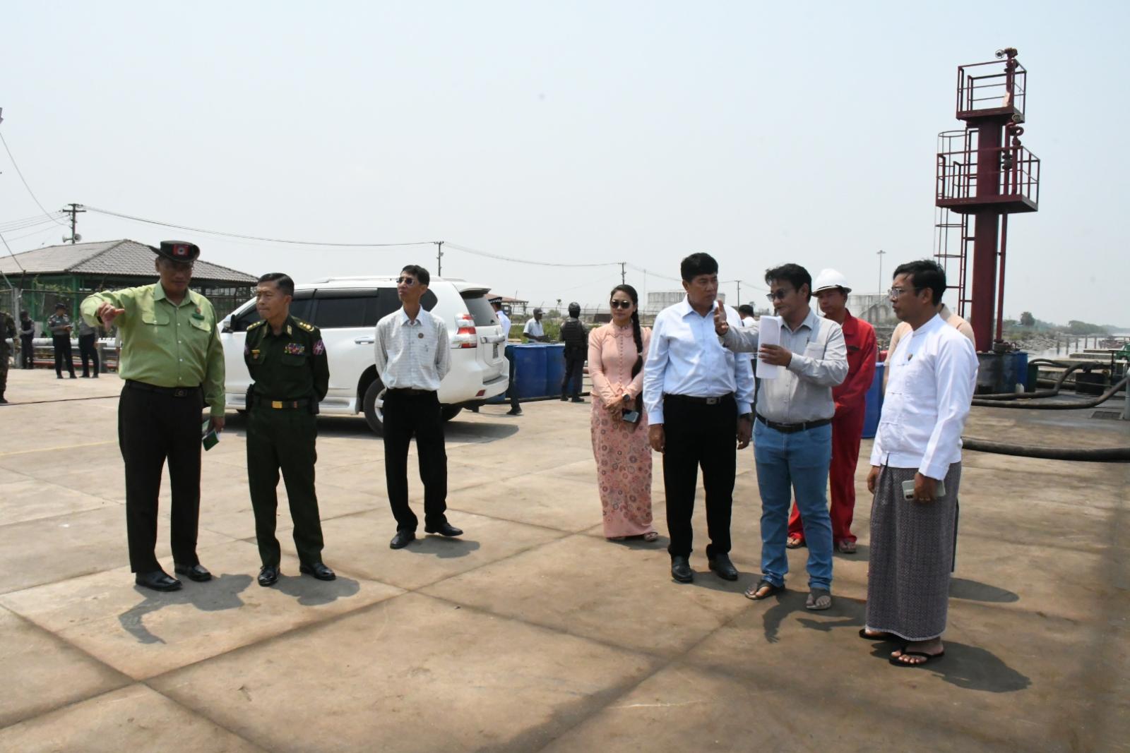 ထို့နောက် ပြည်နယ်ဝန်ကြီးများနှင့် တာဝန်ရှိသူများက Puma Power International Port Terminal ဆိပ်ကမ်းသို့လာရောက်သည့် လမ်းများ ပိုမိုကောင်းမွန်ရန်လိုအပ်ကြောင်း၊ စက်သုံးဆီ အရောင်းဆိုင်များတွင် ဘားကုတ်များဖြင့် စက်သုံးဆီ ရောင်းချနိုင်ရေးအတွက် မွန်ပြည်နယ်အတွင်း အမြန်ဆုံးဆောင်ရွက်သွားမည်ဖြစ်ကြောင်း၊ နွေရာသီကာလသို့ ရောက်ရှိလာပြီဖြစ်၍ မီးဘေးအန္တာရာယ်အား ဂရုစိုက်ရန်လိုအပ်ကြောင်းနှင့် မိုးရာသီတွင် သီးနှံစိုက်ပျိုးရေးအတွက် စက်သုံးဆီများလိုအပ်လာမည်ဖြစ်၍ ကြိုတင်ပြင်ဆင်ထားရှိသွားရန် လိုအပ်ကြောင်း၊ မကြာမီမိုးကာလသို့ရောက်ရှိလာမည်ဖြစ်ရာ သီဥတုမှာမုန်တိုင်းများ ဝင်ရောက်လာနိုင်သဖြင့် သင်္ဘောမှချည်နှောင်ထားသည့် ကြိုးများပြတ်တောက်သွားမှု မရှိစေရေးတို့အတွက် ကြိုတင်ပြင်ဆင်ထားရှိရန် လိုအပ်ကြောင်းပြောကြား၍ ပြည်နယ်ဝန်ကြီးချုပ်နှင့်အဖွဲ့သည် Puma Power International Port Terminal ဆိပ်ကမ်းနှင့် အဆိုပါ သိုလှောင်ကန်များရှိ စက်သုံးဆီများကိုသက်ဆိုင်ရာ ဆီဖြည့်ပွိုင့်များမှတစ်ဆင့် ဆီဘောက်ဆာယာဉ်များပေါ်သို့ ဆီဖြည့်ပေးနေမှုအခြေအနေတို့အား လှည့်လည်ကြည့်ရှုစစ်ဆေးခဲ့သည်။