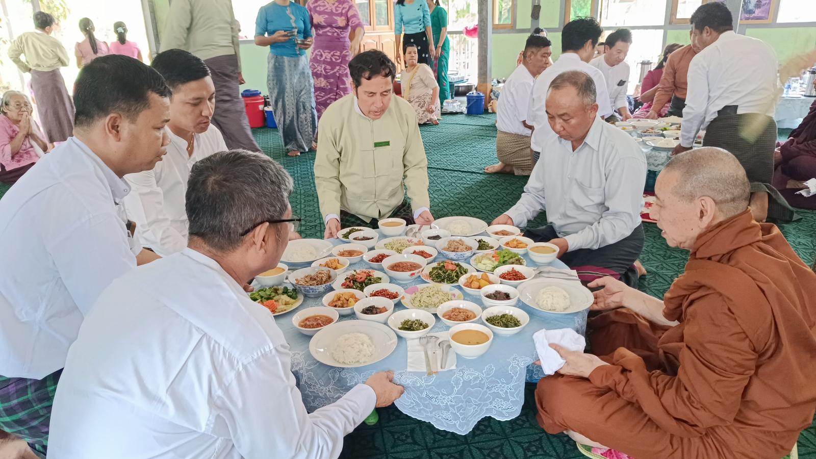 ဆက်လက်၍ ခရိုင်စီမံခန့်ခွဲရေးနှင့်အုပ်ချုပ်ရေးကော်မတီဥက္ကဋ္ဌနှင့် တာဝန်ရှိသူများက သံဃာတော်များကို နေ့ဆွမ်းဆက်ကပ်လှူဒါန်းခဲ့ကြပြီး တက်ရောက်လာကြသူများကို ဧည့်ခံကျွေးမွေးခဲ့ကြောင်း သိရသည်။
