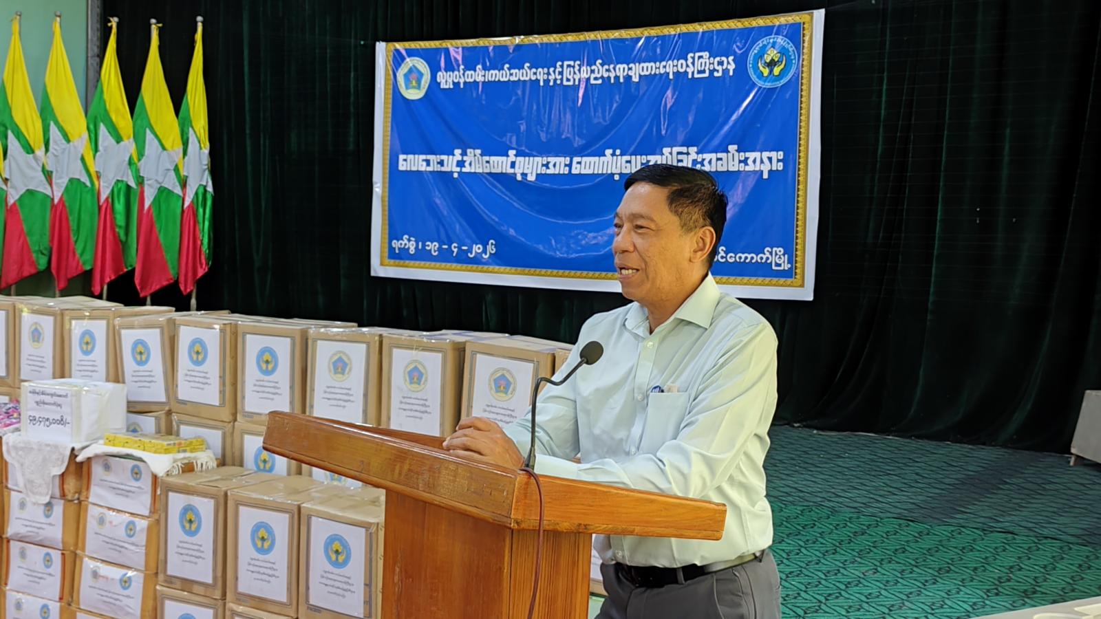 ပဲခူးတိုင်းဒေသကြီး သာယာဝတီခရိုင် ကြို့ပင်ကောက်မြို့နယ် အထွေထွေအုပ်ချုပ်ရေးဦးစီးဌာနရုံး အစည်းအဝေးခန်းမတွင် ဧပြီ ၁၉ ရက်ကကျင်းပသော လေဘေးသင့်အိမ်ထောင်စုများအား ထောက်ပံ့ပေးအပ်ခြင်း အခမ်းအနားသို့ လူမှုဝန်ထမ်းကယ်ဆယ်ရေးနှင့် ပြန်လည်နေရာချထားရေးဝန်ကြီးဌာန ပြည်ထောင်စုဝန်ကြီး ဒေါက်တာစိုးဝင်း နှင့် ပဲခူးတိုင်းဒေသကြီးဝန်ကြီးချုပ် ဦးမျိုးဆွေဝင်း တို့တက်ရောက်သည်။