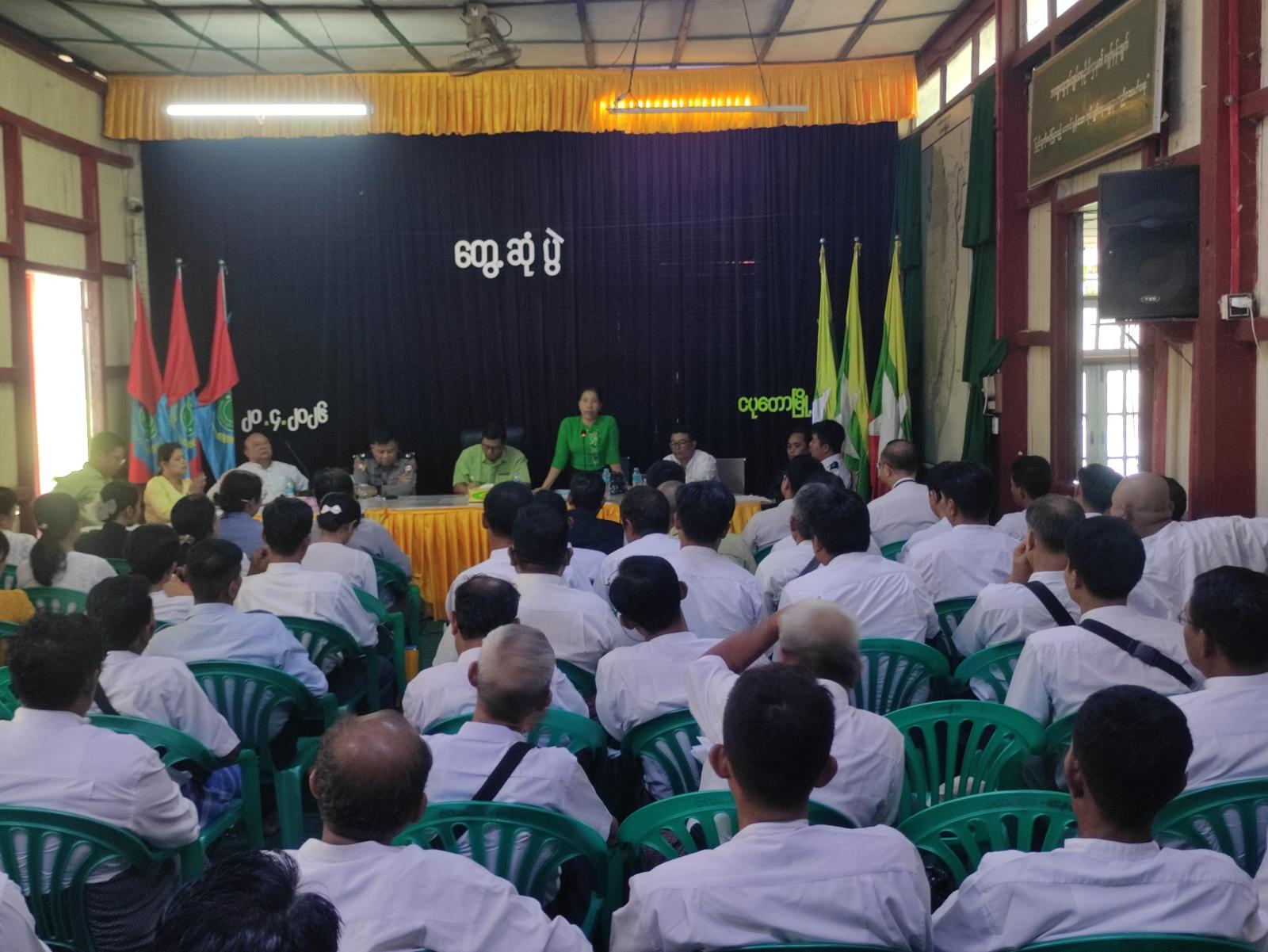 အစည်းအဝေးတွင် မြို့နယ်စီမံခန့်ခွဲရေးနှင့်အုပ်ချုပ်ရေးကော်မတီဥက္ကဋ္ဌ ဦးအောင်ဆန်းဦးက ၁၃၈၇ ခုနှစ်မဟာသင်္ကြန်ပွဲတော် အောင်မြင်စွာကျင်းပနိုင်အောင် ဝိုင်းဝန်းကူညီဆောင်ရွက် ပေးခဲ့သော ဦးစီးကော်မဝာီဆပ်ကော်မတီများအား အထူးပင်ကျေးဇူးတင်ရှိပါကြောင်း၊ ပြည်သူများအတွက် ပြည်သူ့အစိုးရ၏ ရက် ၁၀၀ စီမံချက်အစီအစဉ်အနေဖြင့် လယ်ယာမြေ လုပ်ပိုင်ခွင့်လက်မှတ်ပုံစံ (၇) အသစ်လျှောက်ခြင်း၊ အမည်ပြောင်းခြင်း၊ (၂) ရသင့်ရထိုက်သော မြေငှားဂရန်နှင့် စက်မှုမြေငှားဂရန်များ၊ လဝက၏ အိမ်ထောင်စုဇယား ပုံစံ (၁၀) နှင့် နိုင်ငံသား ကတ်မှတ်ပုံတင်ပြုလုပ်ပေးခြင်း၊ အဟောင်းလဲလှယ်ပေးခြင်း၊ အသက်အရွယ်အလိုက် သတ်မှတ်ပုံတင်ပြောင်းလဲပြုလုပ်ပေးခြင်း၊ UID ရိုက်ကူးပေးခြင်းနှင့် EID Sever ရှိအိမ်ထောင်စု လူဦးရေစာရင်းပါ အချက်အလက်များကို စိစစ်ပေးခြင်း၊ ပြင်ဆင်ပေးခြင်းလုပ်ငန်းများကို ဧပြီလ ၂၀ရက်နေ့မှစတင်၍ လုပ်ဆောင်သွားမည်ဖြစ်၍ သက်ဆိုင်ရာဌာနဆိုင်ရာအလိုက် ပူးပေါင်းပါဝင် အလေးထားဆောင်ရွက်စေရေးပြောကြားပြီး ပြည်သူ့လွှတ်တော်ကိုယ်စားလှယ် ဒေါ်ခင်သန်းမြင့်က ဒေသဖွံ့ဖြိုးရေးလုပ်ငန်းများ ဆောင်ရွက်ရမည့် အစီအစဉ်များနှင့်ပတ်သတ်၍ မြို့နယ်ဌာနဆိုင်ရာများနှင့် ရပ်ကျေးအုပ်ချုပ်ရေးမှူးများနှင့် ပေါင်းစပ်ညှိနှိုင်းဆောင်ရွက်သည်။