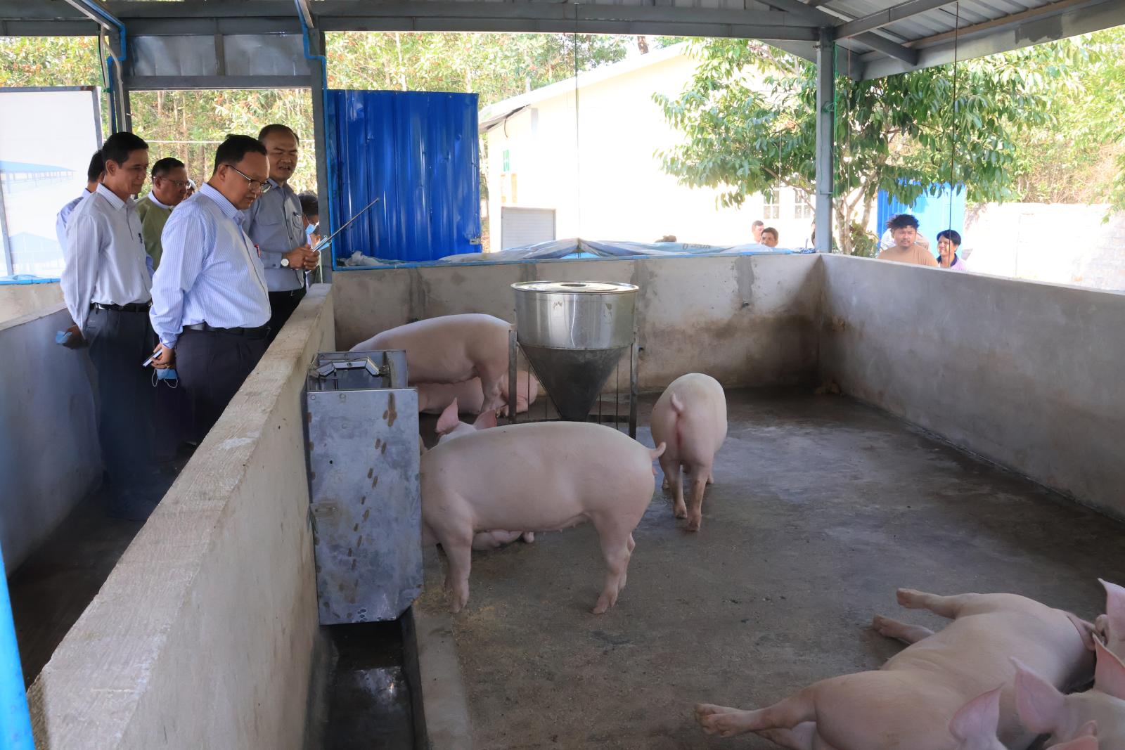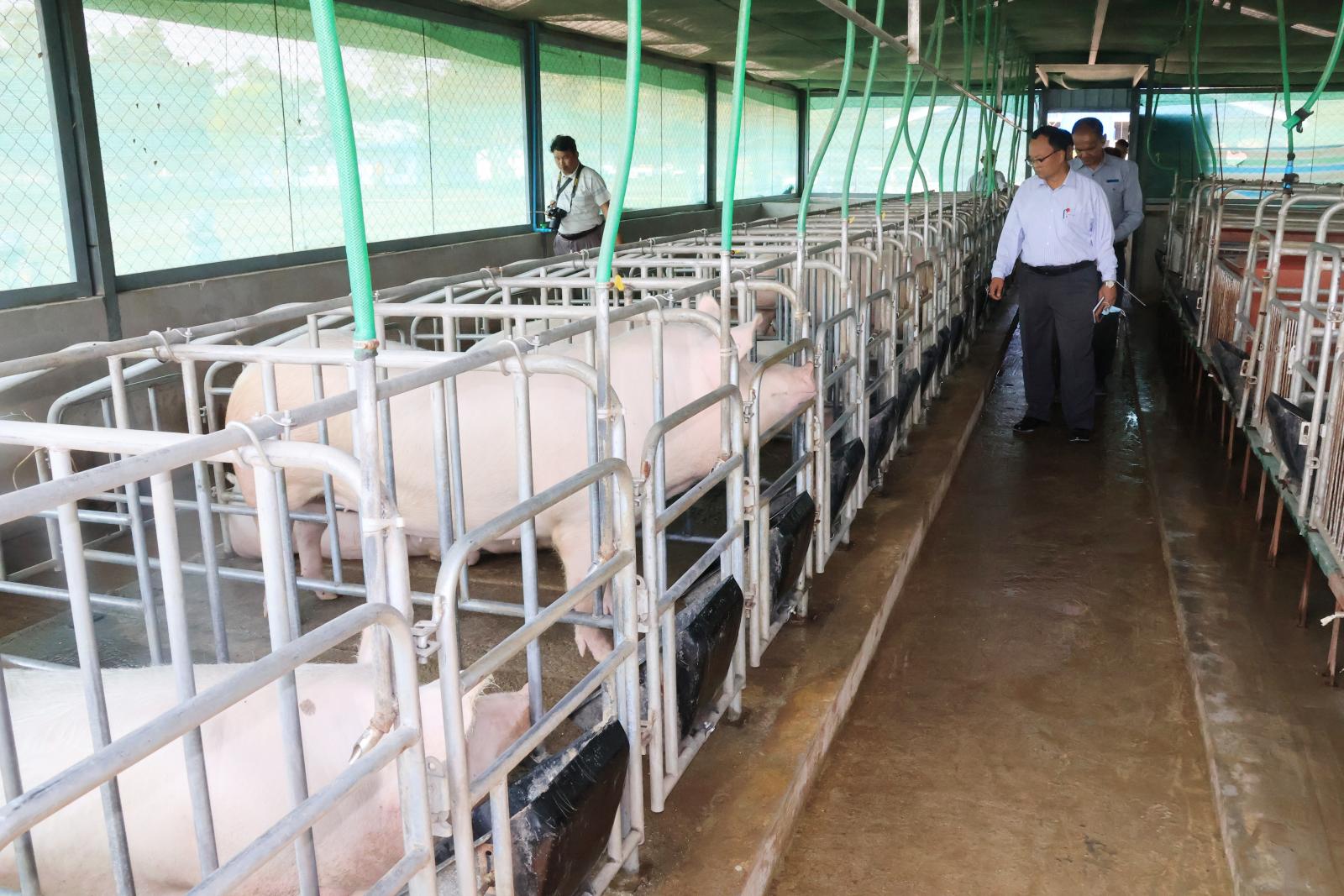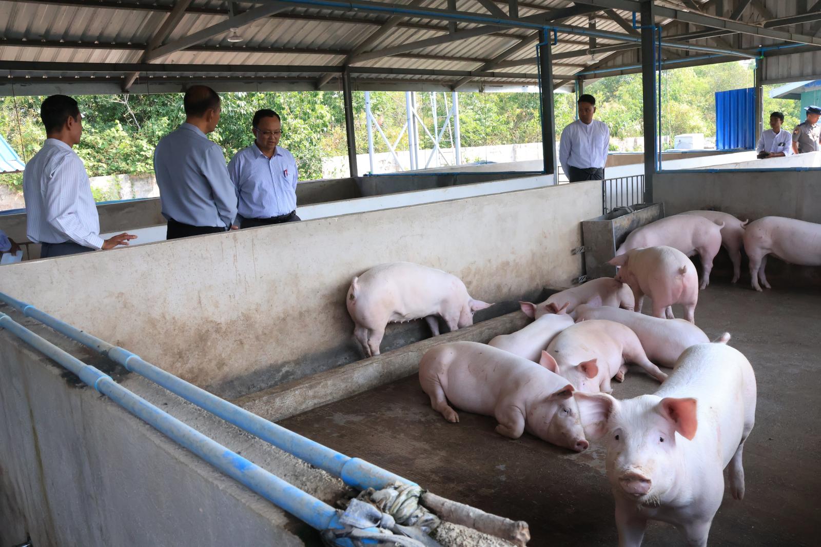 ဦးစွာ ပြည်နယ်ဝန်ကြီးချုပ်နှင့် တာဝန်ရှိသူများသည် ပြည်နယ်၏ မွေးမြူရေးကဏ္ဍဖွံ့ဖြိုးတိုးတက်စေရန်နှင့် မွေးမြူရေးလုပ်ငန်းရှင်များအား သရုပ်ပြပညာပေးဆောင်ရွက်နိုင်ရန် အကောင်အထည်ဖော် ဆောင်ရွက်ထားရှိသည့် စံပြဝက်မွေးမြူရေးခြံသို့ရောက်ရှိရာ ပြည်နယ်မွေးမြူရေးနှင့်ကုသရေးဦးစီးဌာနမှူးက အသားတိုးဝက်နှင့် မျိုးဝက်များမွေးမြူထားရှိမှုအခြေအနေများကို ရှင်းလင်းတင်ပြသည်။