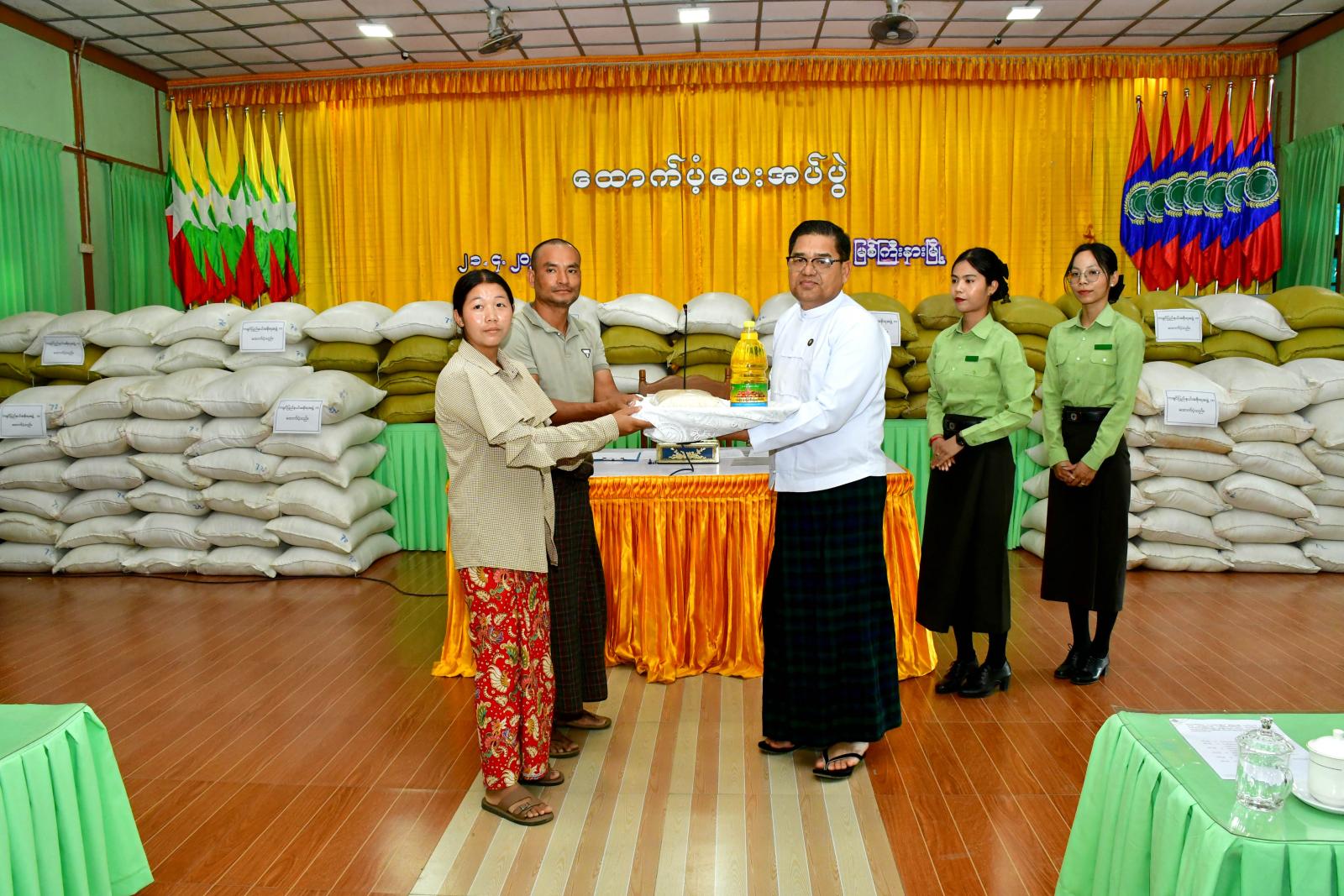 ထို့အပြင် မွန်းလွဲပိုင်းတွင် မြစ်ကြီးနားမြို့နယ်စုပေါင်းရုံး မနောရွှေပြည်ခန်းမ၌ ဝိုင်းမော်မြို့နယ်အတွင်း ယာယီတိမ်းရှောင်ပြည်သူများအား အခြေခံစားသောက်ကုန်များ ထောက်ပံ့ပေးအပ်ပွဲသို့ တက်ရောက်ပြီး ပြည်နယ်ဝန်ကြီးချုပ်နှင့် ပြည်နယ်အစိုးရအဖွဲ့ဝင်များက အခမ်းအနားတက်ရောက်လာကြသည့် ဝိုင်းမော်မြို့ အမှတ်(၁)ရပ်ကွက်၊ အောင်မင်္ဂလာဘုန်းကြီးကျောင်း၊ ခတ်ချိုကျေးရွာရှိ စခန်း (၅)ခု၊ အမှတ်(၃)ရပ်ကွက်အတွင်းရှိ မျိုးရှယာယီတိမ်းရှောင်စခန်းနှင့် ဆွေမျိုးများနေအိမ်ခြံဝင်းတို့အတွင်း ခိုလှုံနေထိုင်လျက်ရှိသော အိမ်ထောင်စု (၄၈၅)စုတို့အတွက် တစ်အိမ်ထောင်လျှင် ဆန်(၈) ပြည်နှုန်းဖြင့် စုစုပေါင်း ဆန်(၂၄)ပြည်ပါအိတ် (၁၆၂) အိတ်နှင့် ဆီပိဿာ ၁၆၂ ပိဿာတို့ကို အသီးသီး ထောက်ပံ့ပေးအပ်သည်။